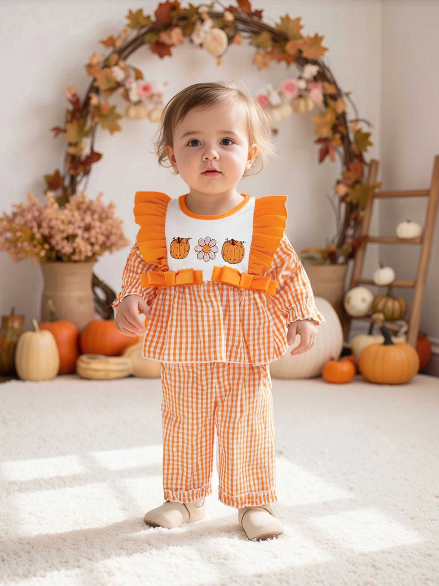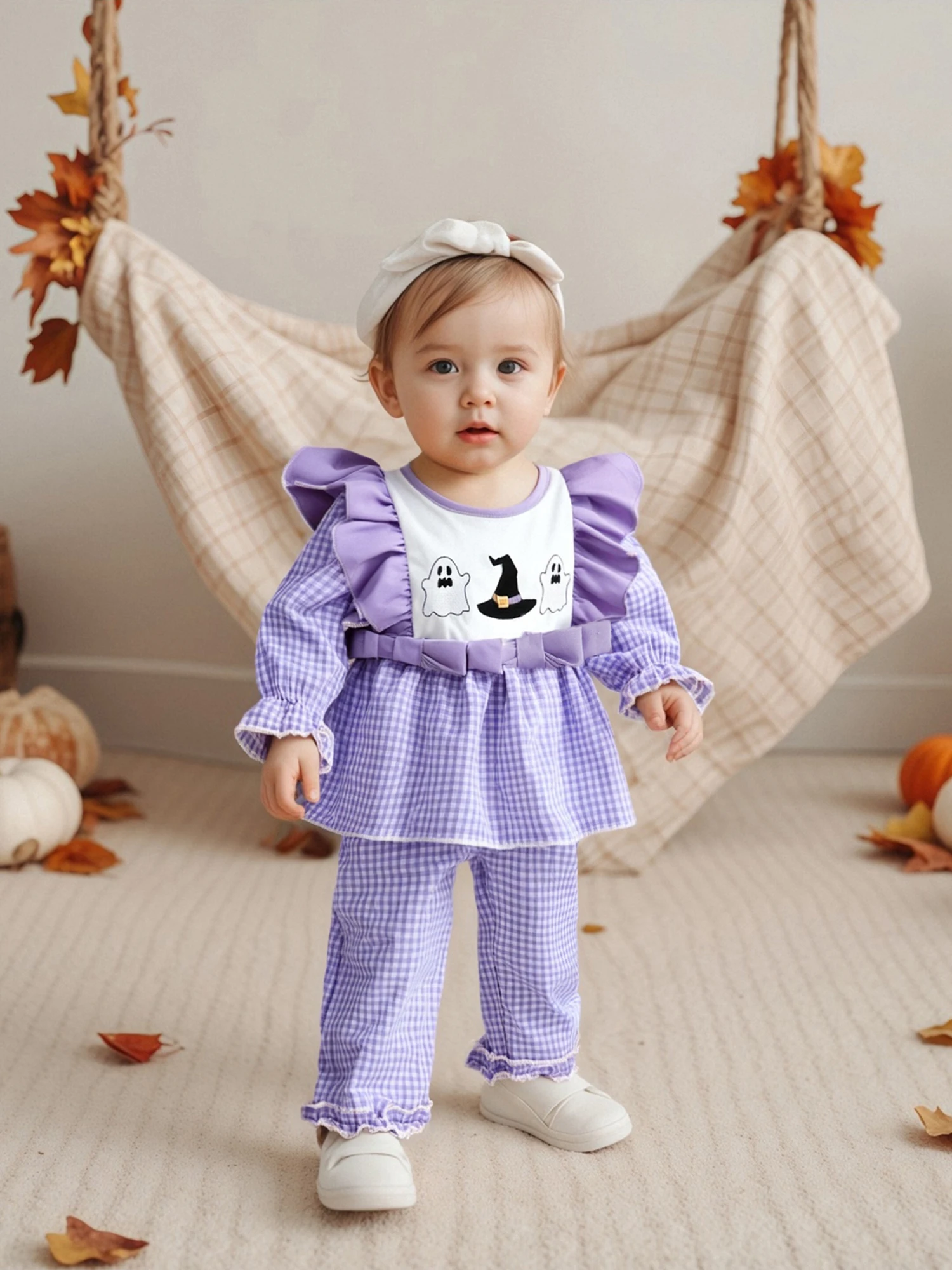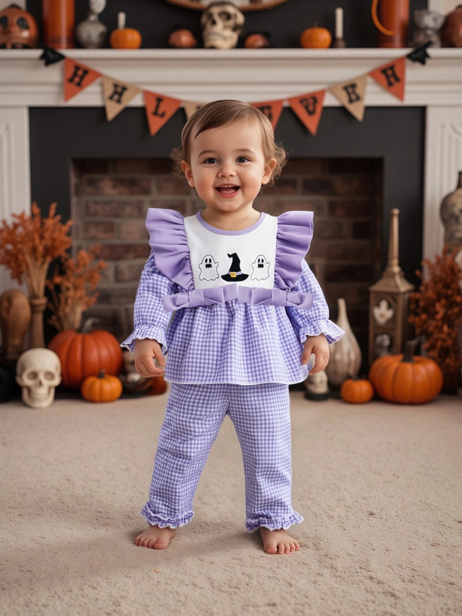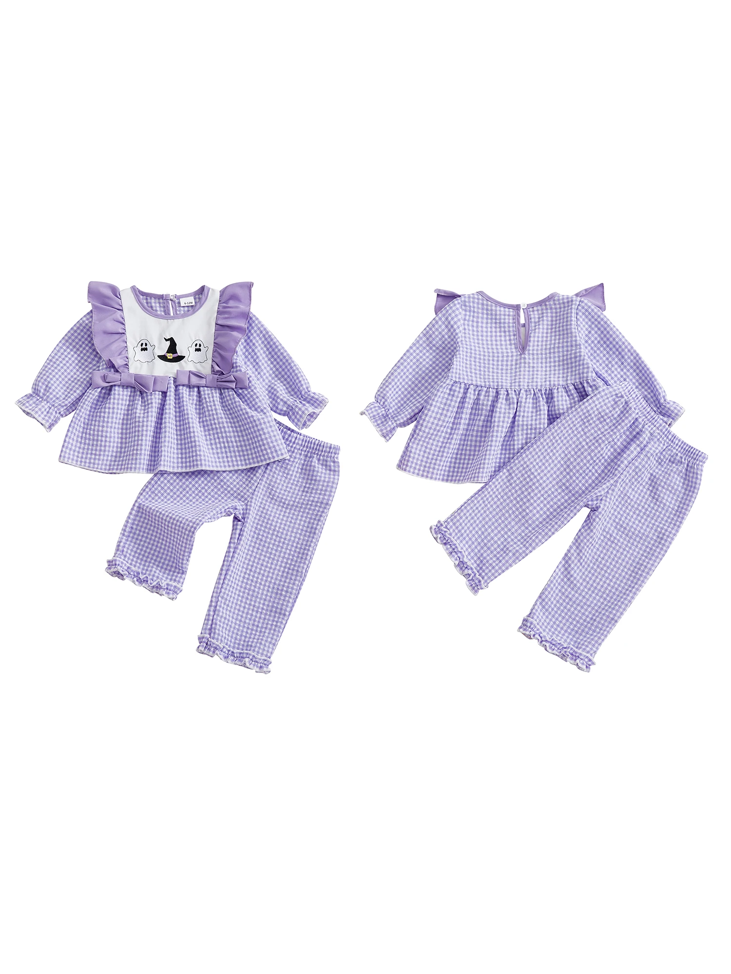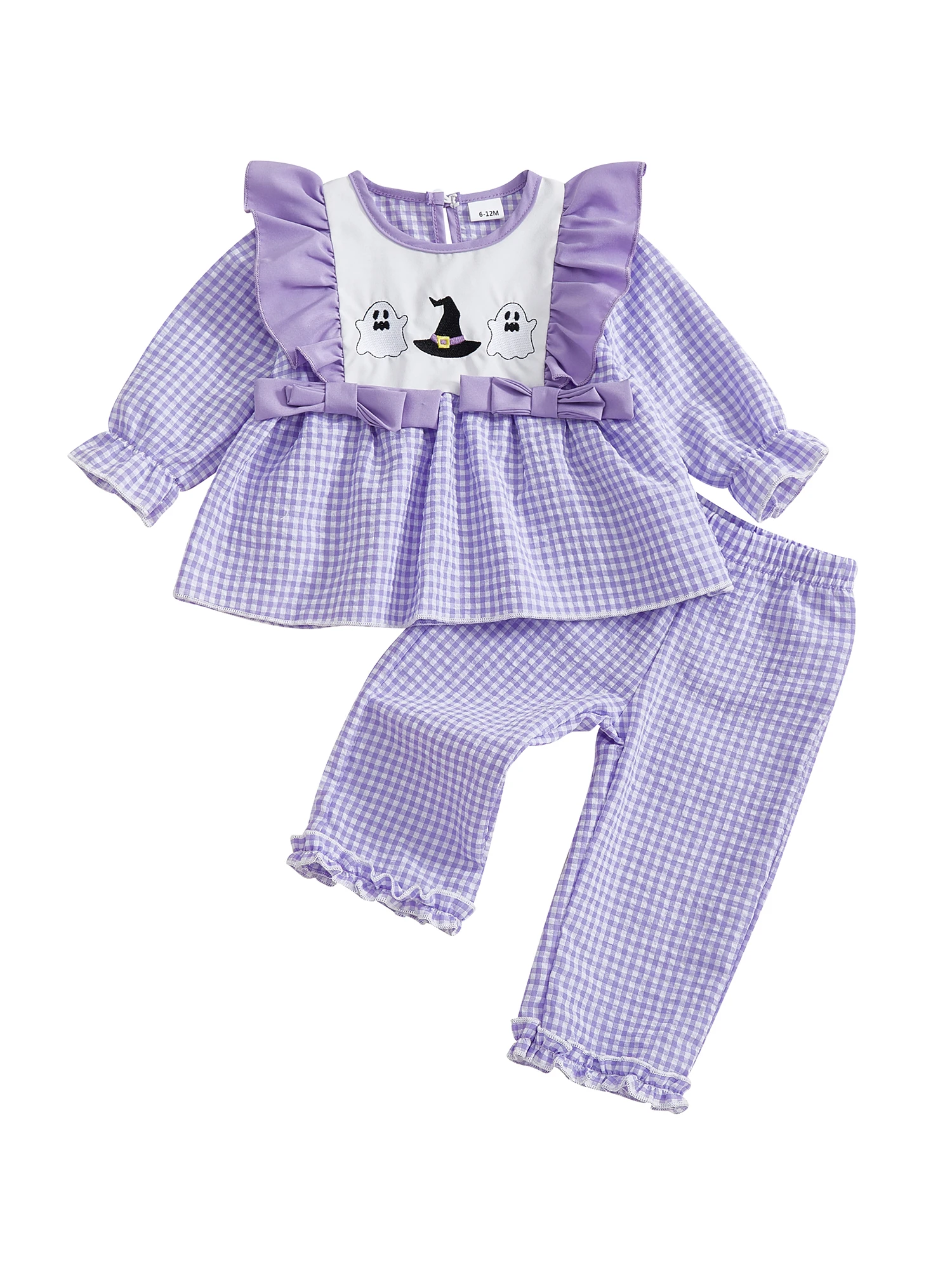 Comprar SUNSIOM Ropa a cuadros de Halloween para niña pequeña, Tops de manga larga con bordado de fantasma/calabaza, pantalones de cintura elástica, traje de otoño de 2 piezas