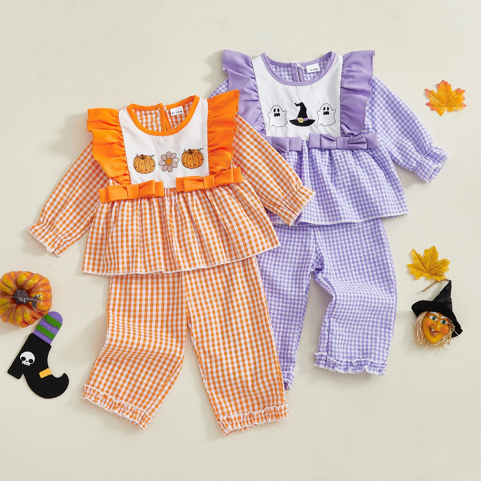 Comprar SUNSIOM Ropa a cuadros de Halloween para niña pequeña, Tops de manga larga con bordado de fantasma/calabaza, pantalones de cintura elástica, traje de otoño de 2 piezas