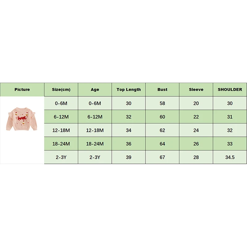Suéter para niña, manga larga, cuello redondo, bordado de helado, jersey de punto, Tops para niños pequeñosCaracterísticas:-- Este suéter es lindo y será una gran sorpresa para los niños pequeños como regalo de Navidad.-- Lavar a mano o a máquina con agua fría y colgar para secar, y no se encoge, incluso con lavados repetidos.-- Cuando elijas la talla, echa un vistazo a la TABLA DE TALLAS a continuación.Tamaño (cm)0-6M Longitud: 30 Busto: 58 Manga: 20 Hombro: 30 Edad recomendada: 0-6 meses6-12M Longitud: 32 Busto: 60 Manga: 22 Hombro: 31 Edad recomendada: 6-12 meses12-18M Longitud: 34 Busto: 62 Manga: 24 Hombro: 32 Edad recomendada: 12-18 meses18-24M Longitud: 36 Busto: 64 Manga: 26 Hombro: 33 Edad recomendada: 18-24 meses2-3T Longitud: 39 Busto: 67 Manga: 28 Hombro: 34,5 Edad recomendada: 2-3 añosTamaño (pulgadas)0-6M Longitud: 11,81 Busto: 22,83 Manga: 7,87 Hombro: 11.81 Edad recomendada: 0-6 meses6-12M Longitud: 12,6 Busto: 23,62 Manga: 8,66 Hombro: 12.2 Edad recomendada: 6-12 meses12-18M Longitud: 13,39 Busto: 24,41 Manga: 9,45 Hombro: 12,6 Edad recomendada: 12-18 meses18-24M Longitud: 14.17 Busto: 25,2 Manga: 10.24 Hombro: 12.99 Edad recomendada: 18-24 meses2-3T Longitud: 15,35 Busto: 26,38 Manga: 11.02 Hombro: 13,58 Edad recomendada: 2-3 añosEspecificación:Material: 27%Poliéster, 23% Poliamida, 50%ViscosaColor rosaGénero: niñasEstilo: CasualTemporada: primavera, otoño, invierno.Paquete incluido1 suéter.
