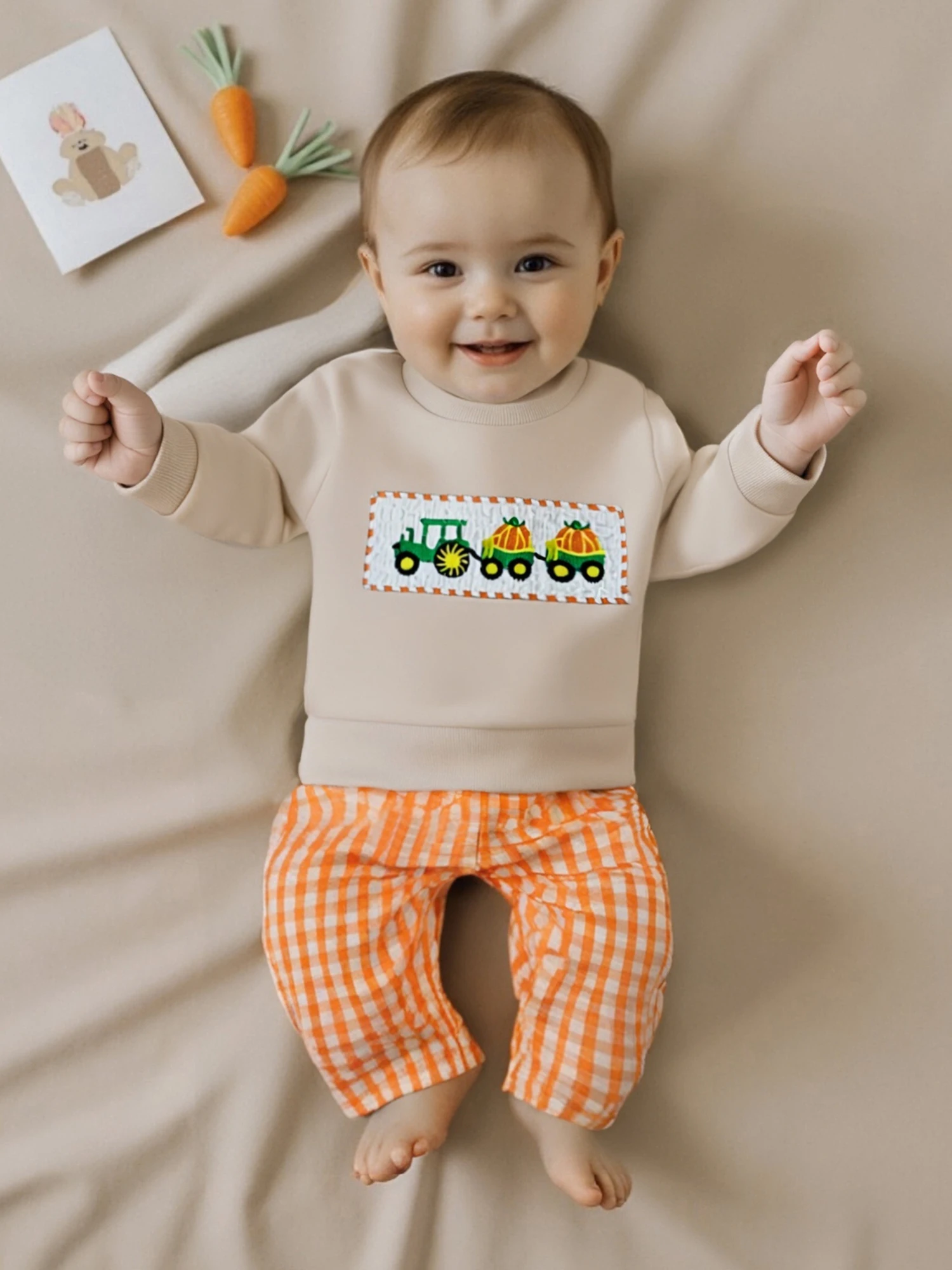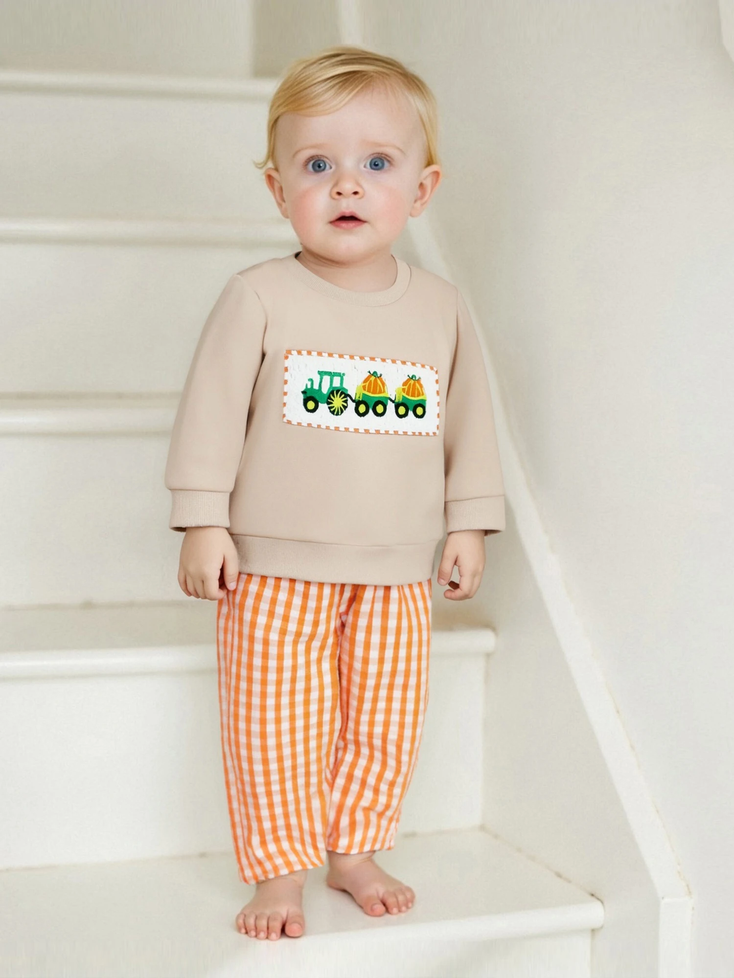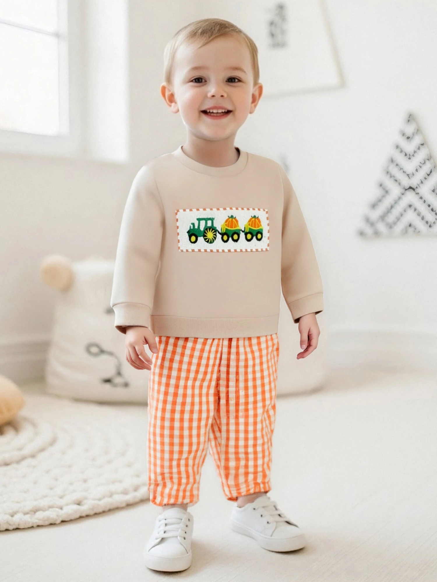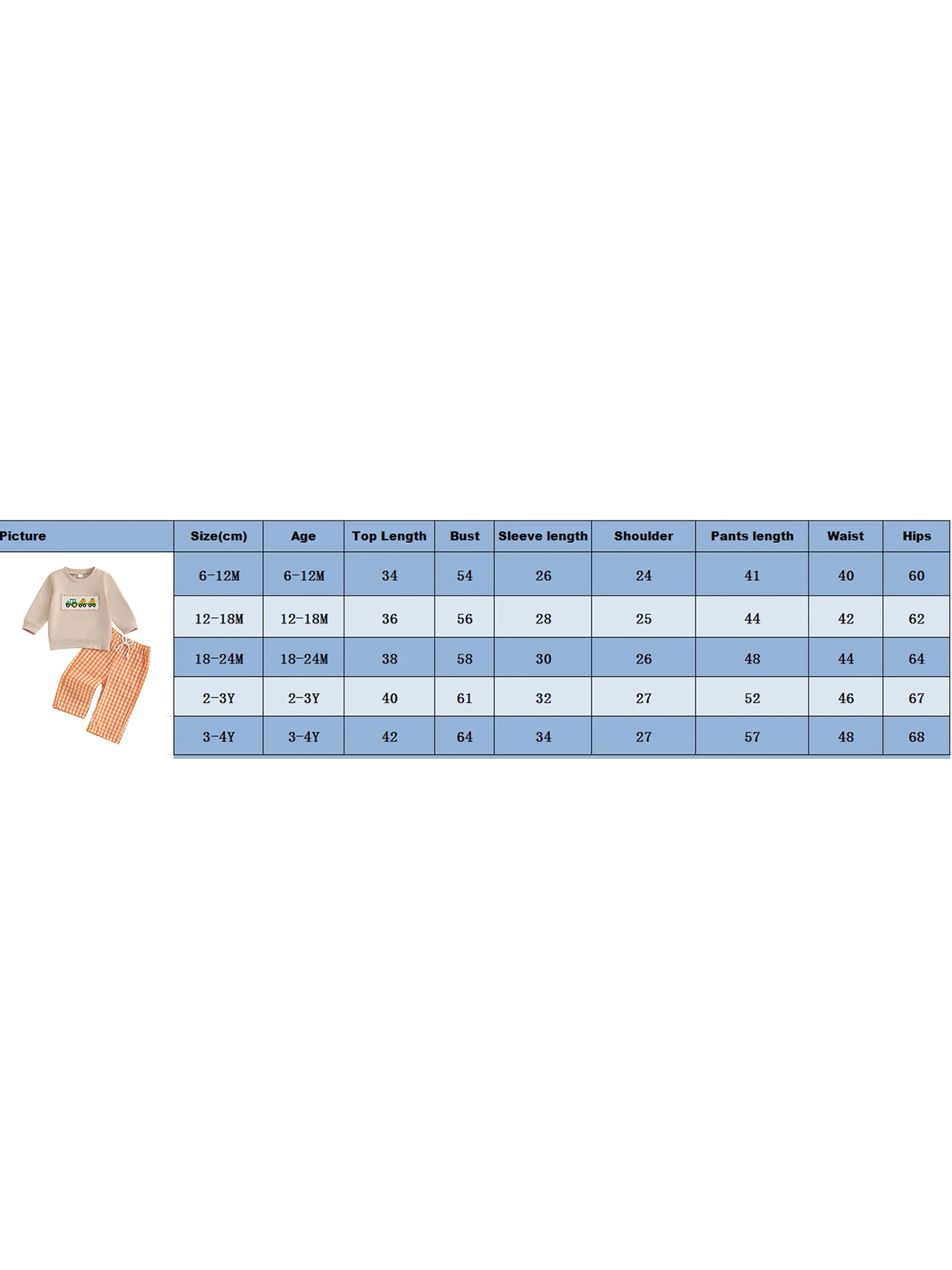 Especificación Condición: 100% nuevo Material: 95% algodón y 5% poliéster Estilo: Moda Género: niños Temporada: primavera otoño Cantidad: 2 piezas Patrón: bordado de calabaza tractor, estampado a cuadros. Manga: manga larga