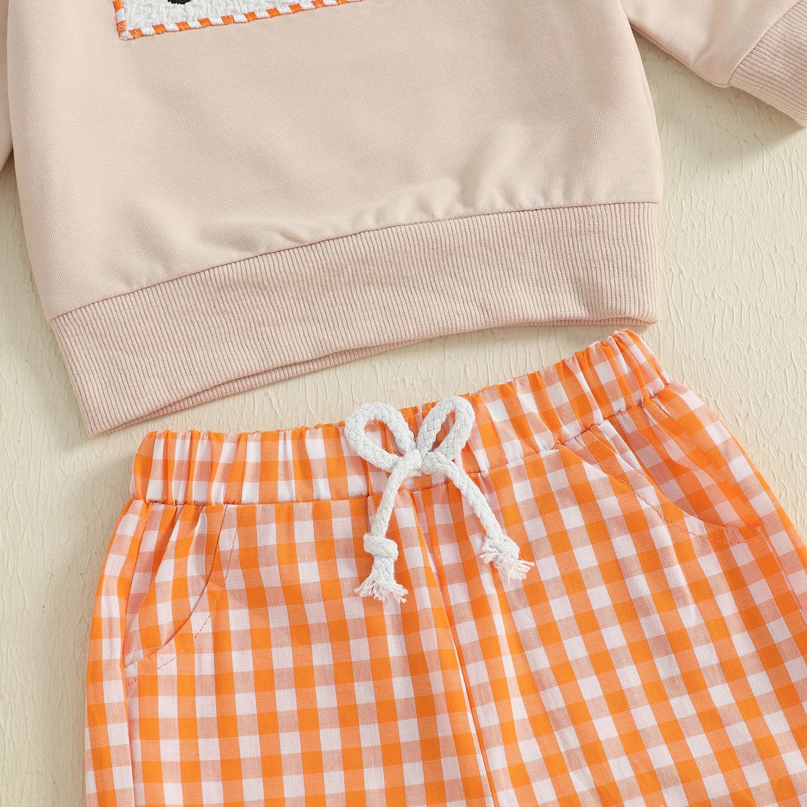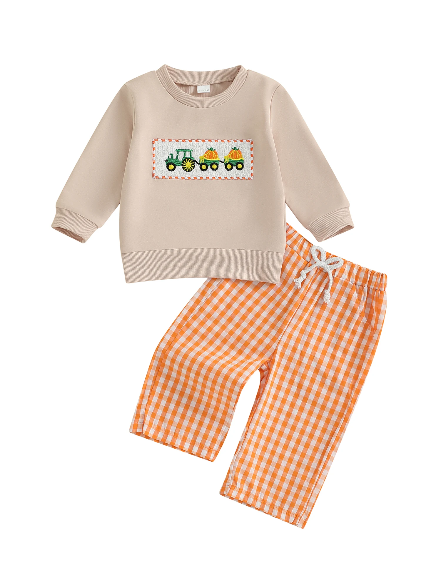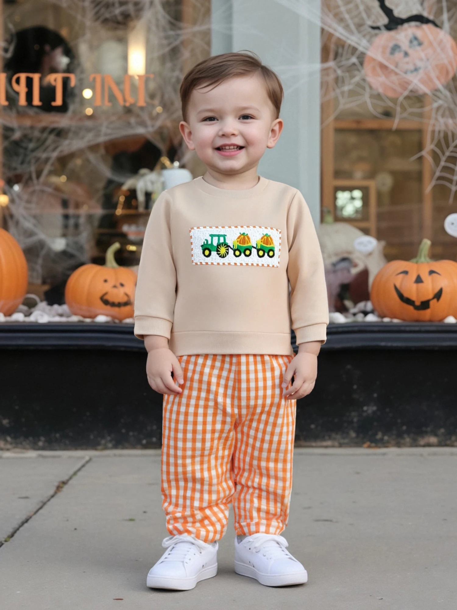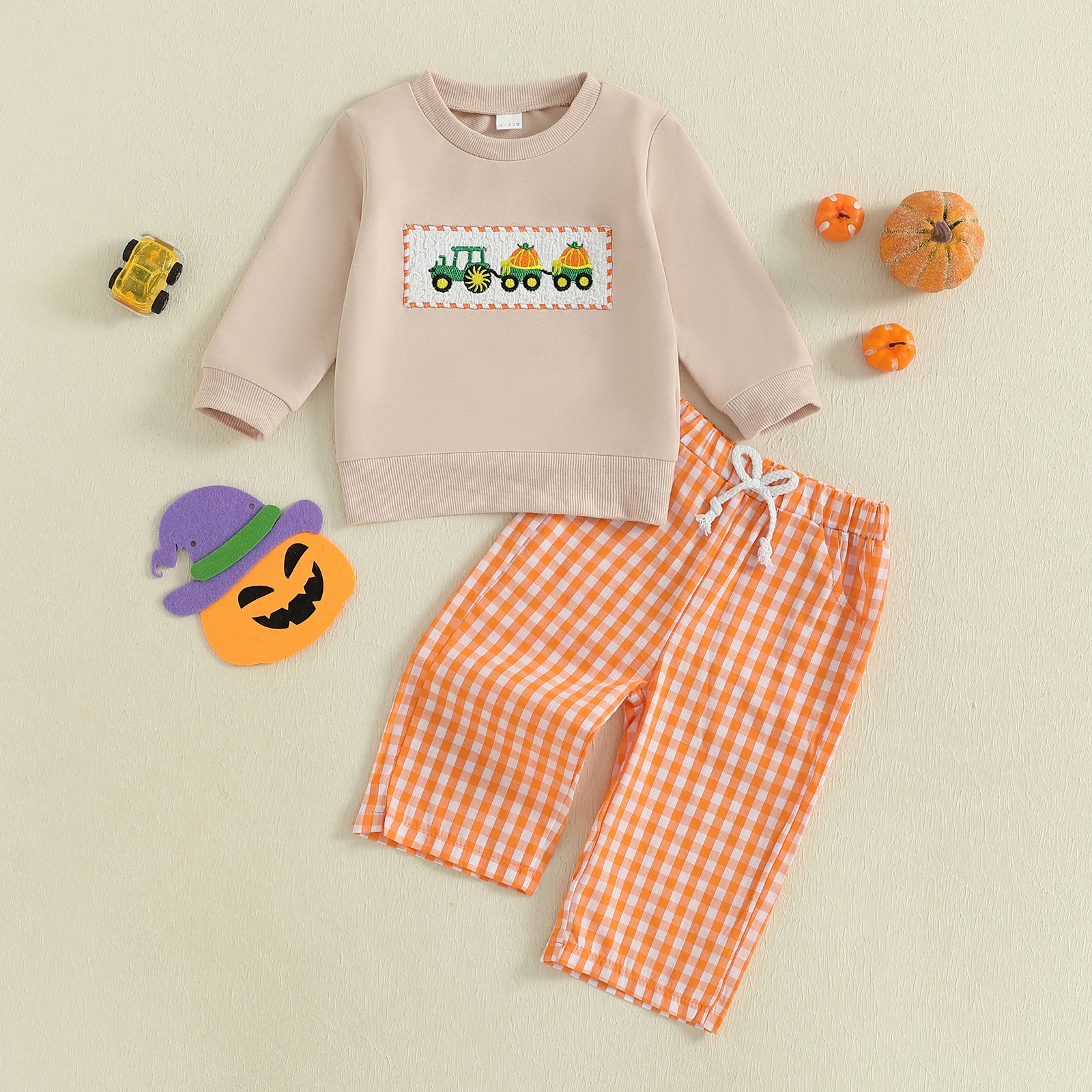 Conjunto de Halloween para bebé niño, sudadera de manga larga con bordado de calabaza y pantalones elásticos a cuadros, ropa de 2 piezas