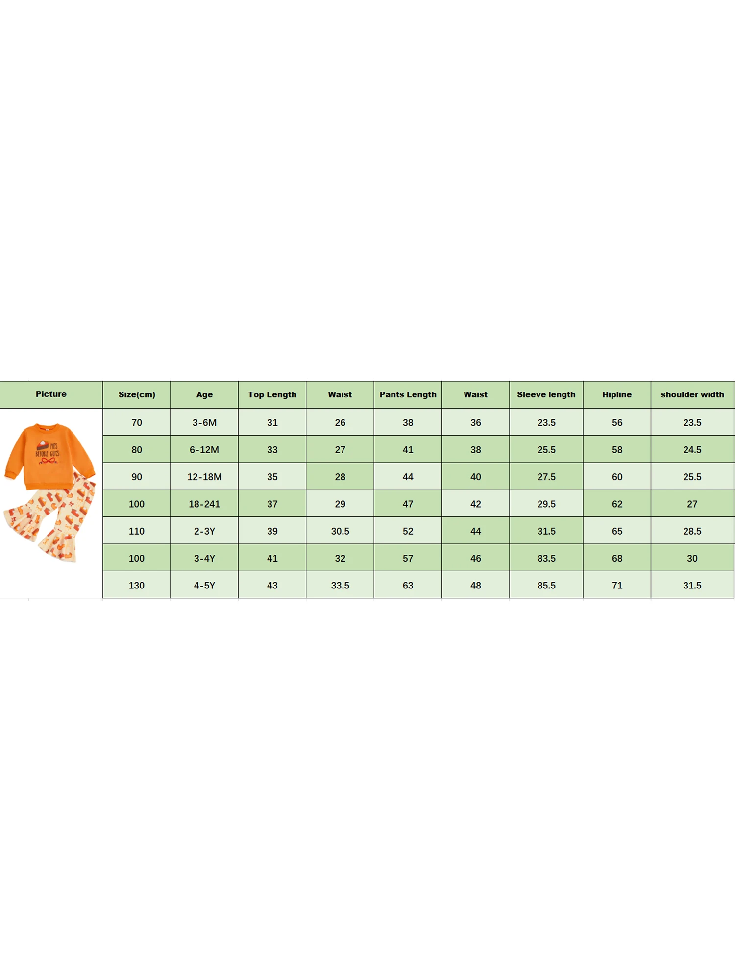 Conjunto de 2 piezas para niña pequeña, sudadera de manga larga con cupcake y pantalones acampanados con cintura elásticaTamaño (cm)100 Longitud de la camiseta: 38 Busto: 60 Manga: 30 Hombro: 26 Longitud de los pantalones: 48 Cintura: 42 Edad recomendada: 18-24 meses110 Longitud de la camiseta: 40 Busto: 63 Manga: 32 Hombro: 27 Longitud de los pantalones: 53 Cintura: 44 Edad recomendada: 2-3 años120 Longitud de la camiseta: 42 Busto: 66 Manga: 34 Hombro: 28 Longitud de los pantalones: 58 Cintura: 46 Edad recomendada: 3-4 años130 Longitud de la camiseta: 44 Busto: 69 Manga: 36 Hombro: 29 Longitud de los pantalones: 63 Cintura: 48 Edad recomendada: 4-5 años140 Longitud de la camiseta: 47 Busto: 72 Manga: 38 Hombro: 30 Longitud de los pantalones: 68 Cintura: 50 Edad recomendada: 5-6 años150 Longitud de la camiseta: 50 Busto: 75 Manga: 40 Hombro: 31 Longitud de los pantalones: 73 Cintura: 52 Edad recomendada: 6-7 añosTamaño (pulgadas)100 Longitud de la camiseta: 14,96 Busto: 23,62 Manga: 11,81 Hombro: 10,24 Longitud de los pantalones: 18,9 Cintura: 16,54 Edad recomendada: 18-24 meses110 Longitud de la camiseta: 15,75 Busto: 24,8 Manga: 12,6 Hombro: 10,63 Longitud de los pantalones: 20,87 Cintura: 17,32 Edad recomendada: 2-3 años120 Longitud de la camiseta: 16,54 Busto: 25,98 Manga: 13,39 Hombro: 11,02 Longitud de los pantalones: 22,83 Cintura: 18,11 Edad recomendada: 3-4 años130 Longitud de la camiseta: 17.32 Busto: 27,17 Manga: 14.17 Hombro: 11.42 Longitud de los pantalones: 24,8 Cintura: 18,9 Edad recomendada: 4-5 años140 Longitud de la camiseta: 18,5 Busto: 28,35 Manga: 14,96 Hombro: 11.81 Longitud de los pantalones: 26,77 Cintura: 19,68 Edad recomendada: 5-6 años150 Longitud de la camiseta: 19,68 Busto: 29,53 Manga: 15,75 Hombro: 12,2 Longitud de los pantalones: 28,74 Cintura: 20,47 Edad recomendada: 6-7 añosEspecificación:Edad recomendada: 18-24 meses, 2-3 años, 3-4 años, 4-5 años, 5-6 años, 6-7 añosMateriales: 75% Algodón y 25% PoliésterPatrón: Bordado de cupcakes con letrasColor: naranjaGénero: NiñaContenido del paquete:1 * sudadera + 1 * pantalonesNota:1.Por favor, comprenda que puede haber una desviación de 1-2 cm.2.Debido a la iluminación y los monitores, existe una ligera diferencia entre la imagen y el artículo real.Promesa:Si el producto tiene algún problema de calidad, comuníquese con nosotros, lo ayudaremos a resolver el problema lo más rápido posible.