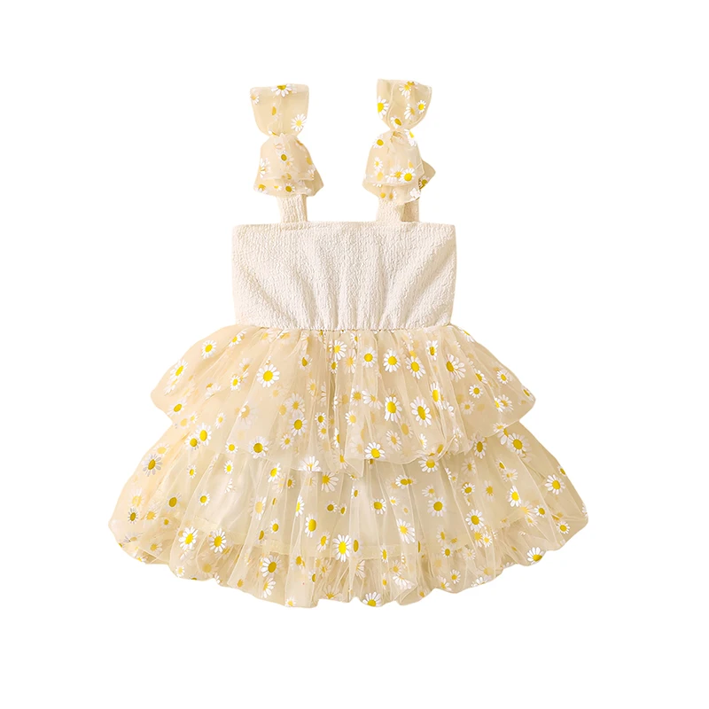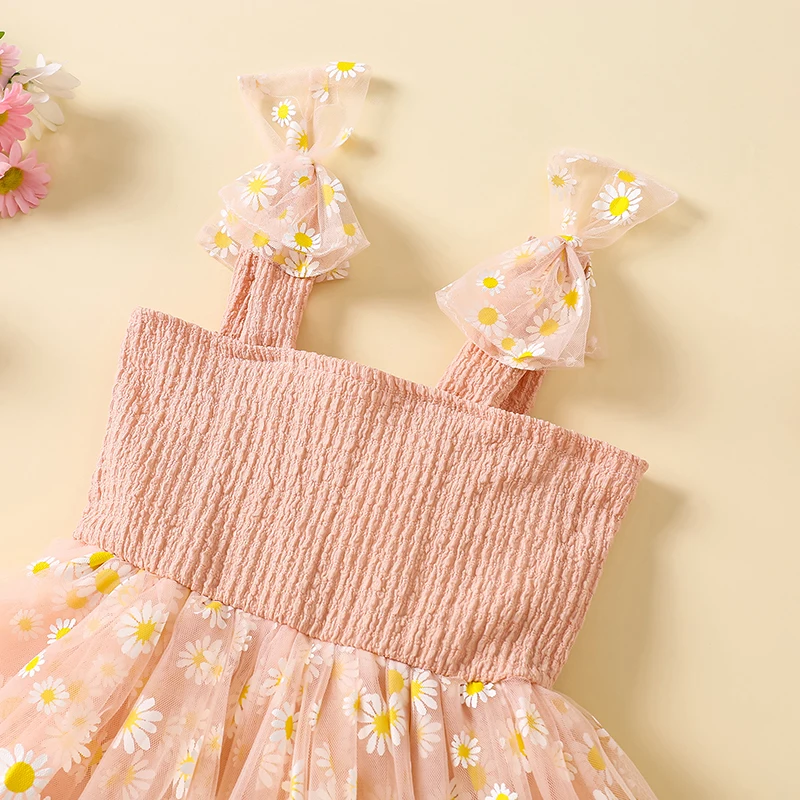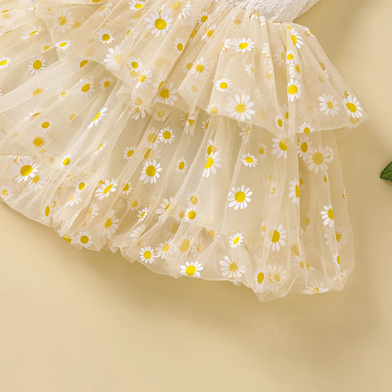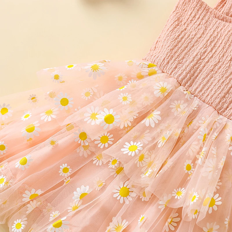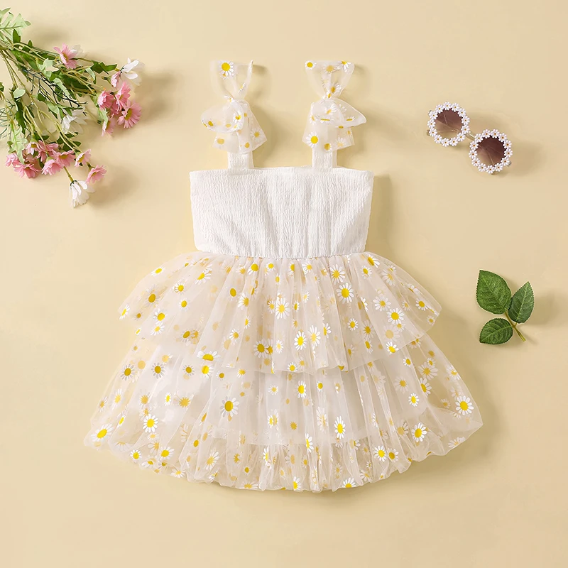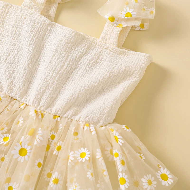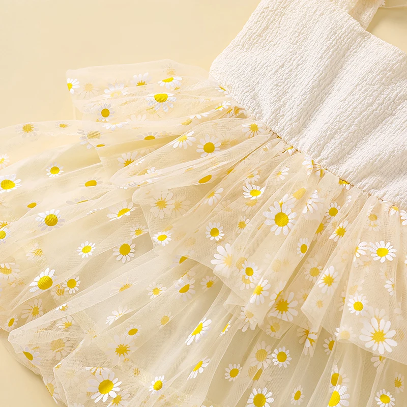 Vestido camisola con margaritas para niña pequeña, cuello cuadrado, sin mangas, vestido de princesa de tul, ropa linda de verano