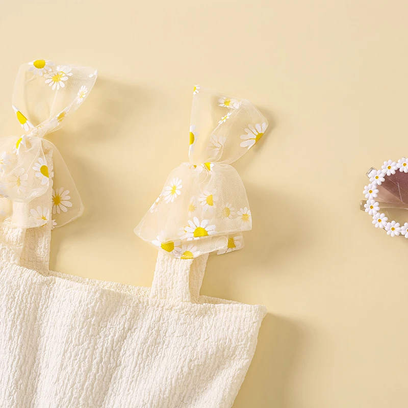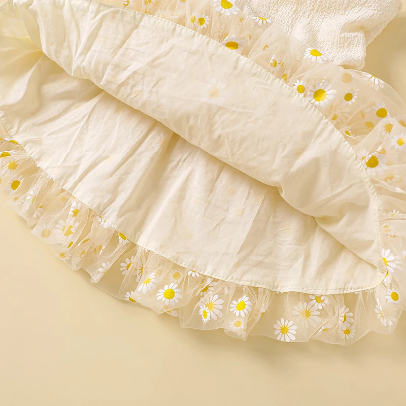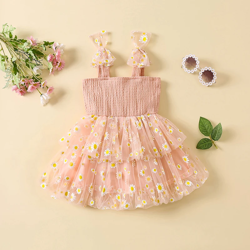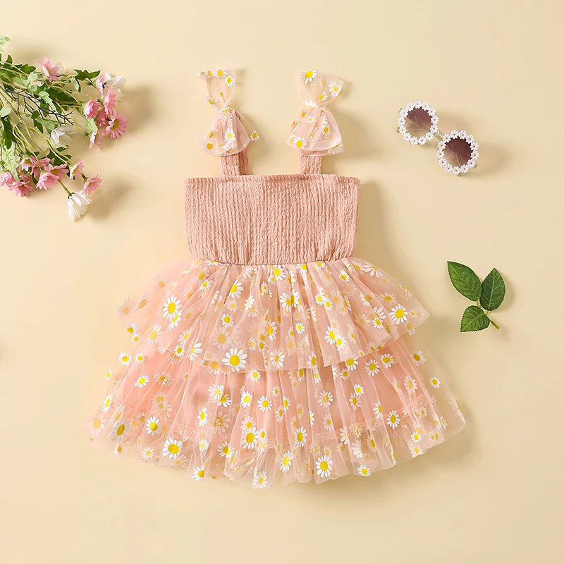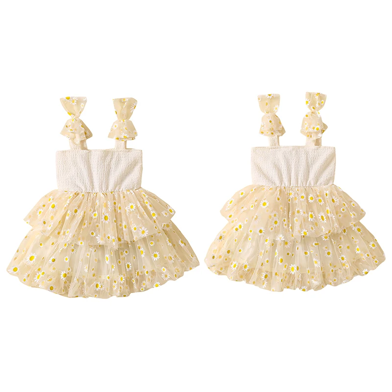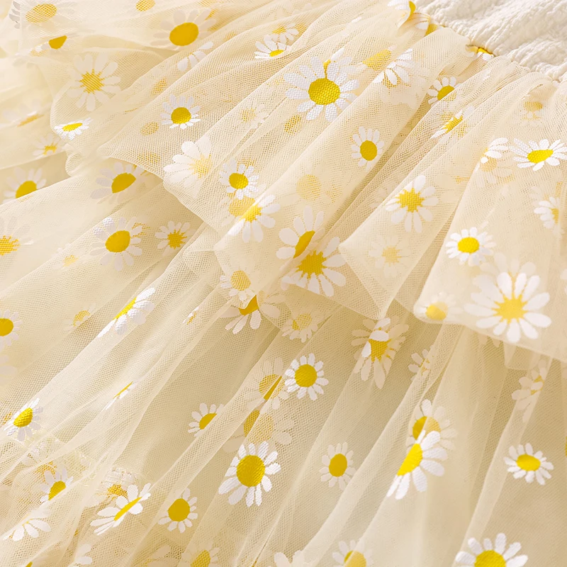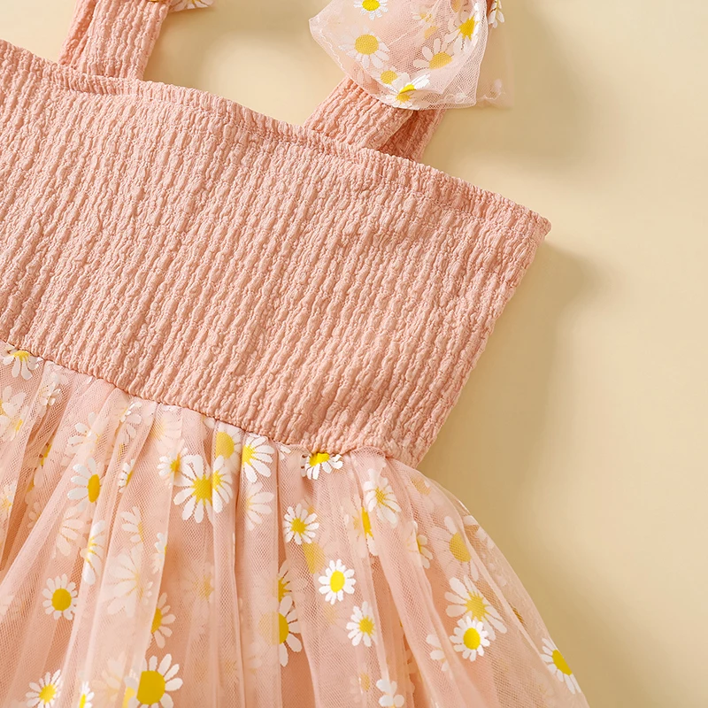 Vestido camisola con margaritas para niña pequeña, cuello cuadrado, sin mangas, vestido de princesa de tul, ropa linda de verano