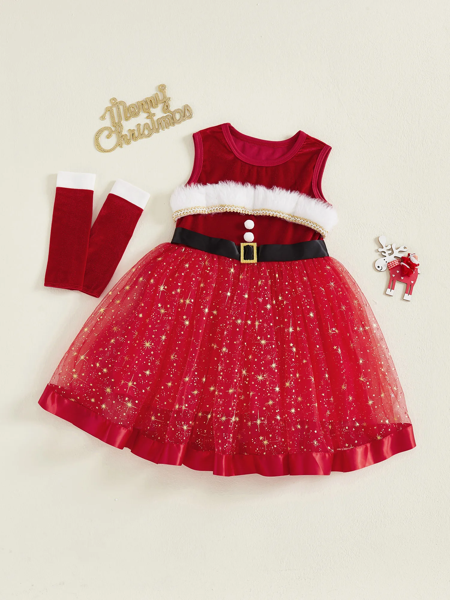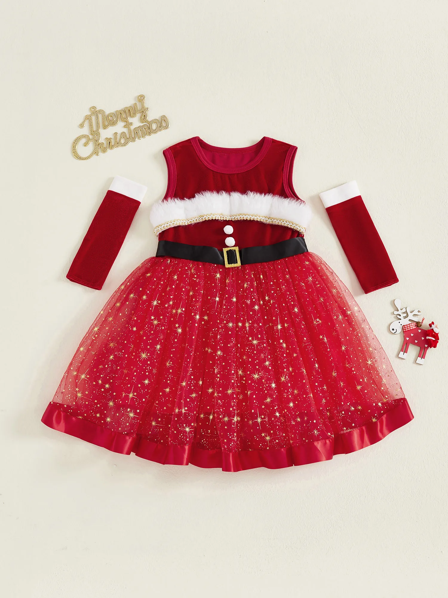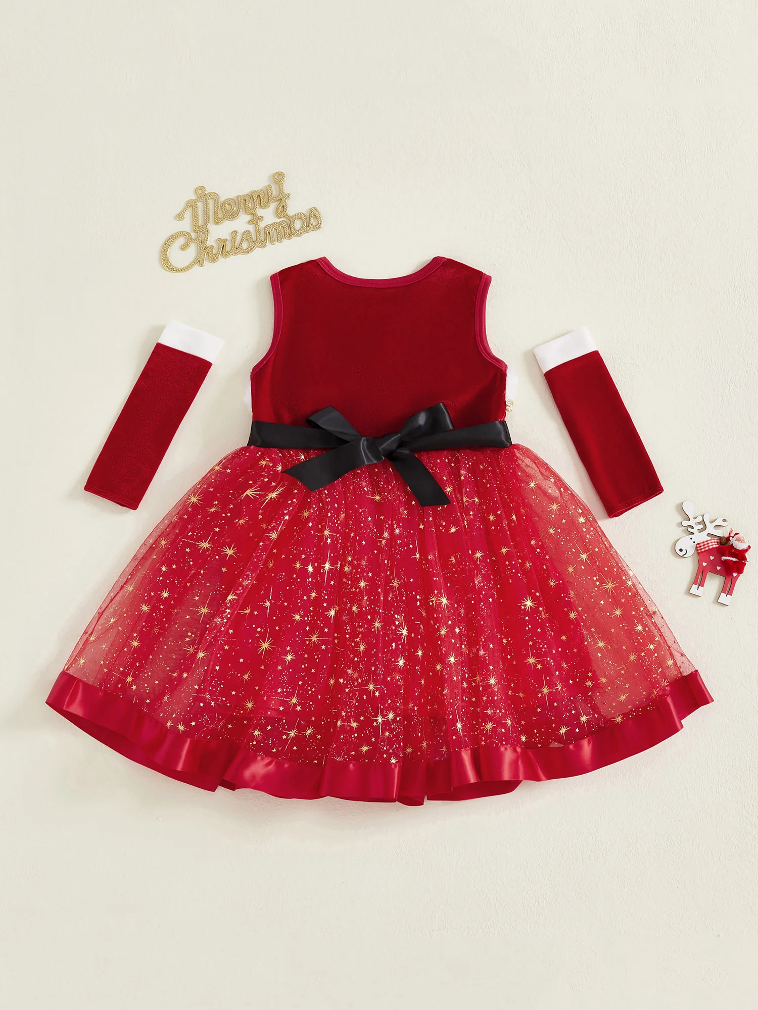 Traje de Navidad para niña, vestido de una línea de retales de tul con estrellas brillantes sin mangas y mangas largas para fiesta de cosplayEl vestido es súper elegante, para que su pequeña pueda jugar al aire libre, descansar en casa, ir de fiesta o salir con comodidad y estilo.Tabla de tallasTamaño (cm)12-18M Longitud: 48 Busto: 54 Hombro: 23 Edad sugerida: 12-18 meses18-24M Longitud: 52 Busto: 56 Hombro: 24 Edad sugerida: 18-24 meses2-3Y Longitud: 57 Busto: 58 Hombro: 25 Edad sugerida: 2-3 años3-4Y Longitud: 62 Busto: 61 Hombro: 26 Edad sugerida: 3-4 años4-5Y Longitud: 66 Busto: 64 Hombro: 27 Edad sugerida: 4-5 añosTamaño (pulgadas)12-18M Longitud: 18,90 Busto: 21,26 Hombro: 9,06 Edad sugerida: 12-18 meses18-24M Longitud: 20,47 Busto: 22,05 Hombro: 9,45 Edad sugerida: 18-24 meses2-3 años Longitud: 22,44 Busto: 22,83 Hombro: 9,84 Edad sugerida: 2-3 años3-4Y Longitud: 24,41 Busto: 24,02 Hombro: 10,24 Edad sugerida: 3-4 años4-5 años Longitud: 25,98 Busto: 25,20 Hombro: 10,63 Edad sugerida: 4-5 añosEspecificaciónNombre del artículo: Conjunto de vestido para niñasColor rojoMaterial: 85% poliéster, 15% elastanoManga: sin mangasTamaño: 12-18 meses, 18-24 meses, 2-3 años, 3-4 años, 4-5 añosContenido del paquete1 pieza x vestido de niña1 par de mangasConsejos amigables1. Por favor permita una diferencia del 2-3% según la medición manual.2. Tenga en cuenta que las mangas deben aceptarse una ligera diferencia de color debido a la luz y la pantalla. Gracias.