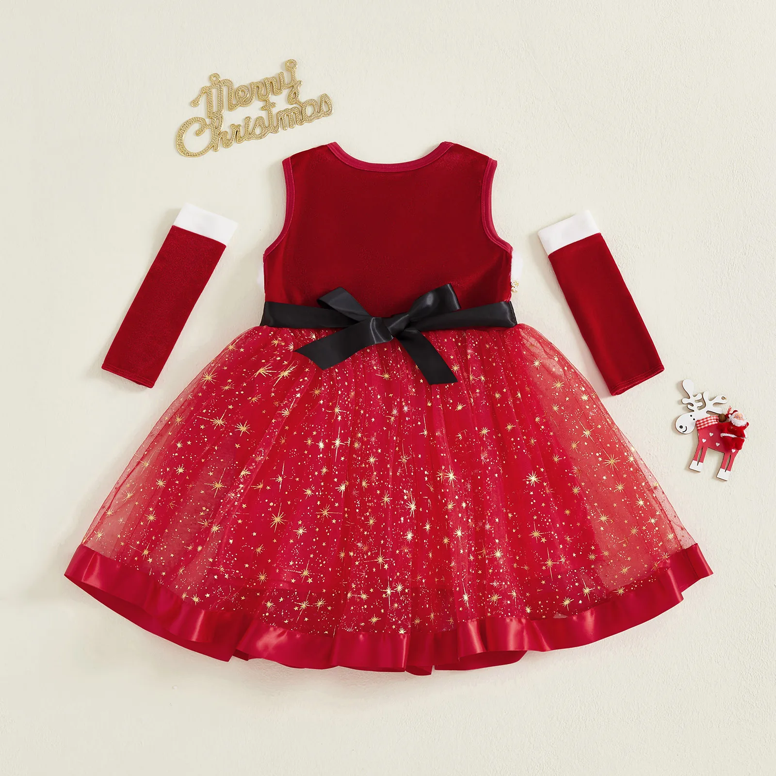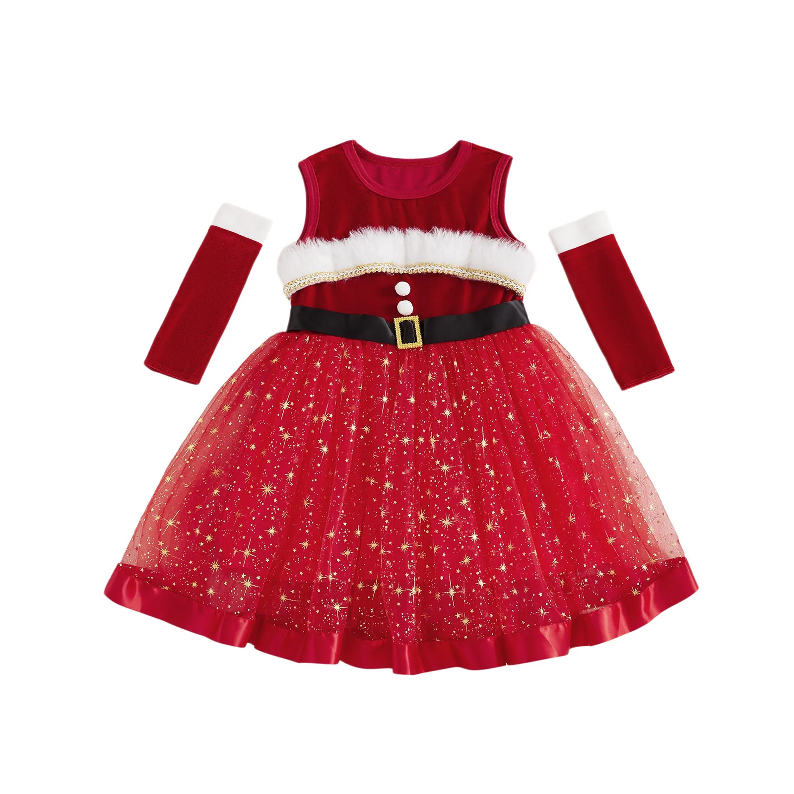 Traje de Navidad para niña, vestido de una línea de retales de tul con estrellas brillantes sin mangas y mangas largas para fiesta de cosplayEl vestido es súper elegante, para que su pequeña pueda jugar al aire libre, descansar en casa, ir de fiesta o salir con comodidad y estilo.Tabla de tallasTamaño (cm)12-18M Longitud: 48 Busto: 54 Hombro: 23 Edad sugerida: 12-18 meses18-24M Longitud: 52 Busto: 56 Hombro: 24 Edad sugerida: 18-24 meses2-3Y Longitud: 57 Busto: 58 Hombro: 25 Edad sugerida: 2-3 años3-4Y Longitud: 62 Busto: 61 Hombro: 26 Edad sugerida: 3-4 años4-5Y Longitud: 66 Busto: 64 Hombro: 27 Edad sugerida: 4-5 añosTamaño (pulgadas)12-18M Longitud: 18,90 Busto: 21,26 Hombro: 9,06 Edad sugerida: 12-18 meses18-24M Longitud: 20,47 Busto: 22,05 Hombro: 9,45 Edad sugerida: 18-24 meses2-3 años Longitud: 22,44 Busto: 22,83 Hombro: 9,84 Edad sugerida: 2-3 años3-4Y Longitud: 24,41 Busto: 24,02 Hombro: 10,24 Edad sugerida: 3-4 años4-5 años Longitud: 25,98 Busto: 25,20 Hombro: 10,63 Edad sugerida: 4-5 añosEspecificaciónNombre del artículo: Conjunto de vestido para niñasColor rojoMaterial: 85% poliéster, 15% elastanoManga: sin mangasTamaño: 12-18 meses, 18-24 meses, 2-3 años, 3-4 años, 4-5 añosContenido del paquete1 pieza x vestido de niña1 par de mangasConsejos amigables1. Por favor permita una diferencia del 2-3% según la medición manual.2. Tenga en cuenta que las mangas deben aceptarse una ligera diferencia de color debido a la luz y la pantalla. Gracias.