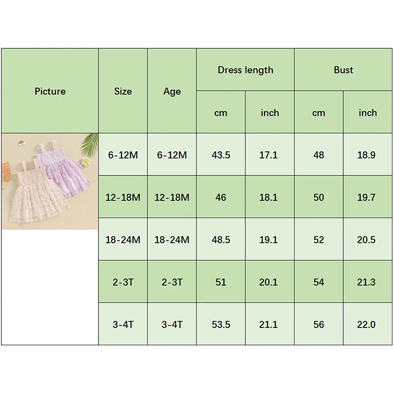 Vestido sin mangas de verano para niñas, vestido de princesa de malla fruncida Floral para fiesta en la playa, ropa bonitaCaracterísticasVestido de verano para niña con estampado floral, pecho recortado fruncido, sin mangas, malla en capas, haz que tu niña se sienta como una verdadera princesa.Adecuado para ropa informal diaria, juegos al aire libre, bodas, vacaciones, fiestas de cumpleaños, reuniones familiares, fotografía.Tamaño (cm)6-12 M Edad recomendada: 6-12 meses Longitud: Busto 43,5: 4812-18 M Edad recomendada: 12-18 Longitud meses: 46 Busto: 5018-24 M Edad recomendada: 18-24 meses Longitud: Busto 48,5: 522-3T Edad recomendada: 2-3 años Longitud: 51 Busto: 54Edad recomendada de 3 a 4 años: 3-4 años Longitud: 53,5 Busto: 56Tamaño (pulgadas)6-12 M Edad recomendada: 6-12 meses Longitud: 17,13 Busto: 18,9012-18 M Edad recomendada: 12-18 meses Longitud: 18,11 Busto: 19,6918-24 M Edad recomendada: 18-24 meses Longitud: 19,09 Busto: 20,472-3T Edad recomendada: 2-3 años Longitud: 20,08 Busto: 21,26Edad recomendada de 3-4 años: 3-4 años Longitud: 21,06 Busto: 22,05EspecificaciónCondición: 100% nuevoMaterial: 100% poliésterEstilo: ModaGénero: bebé niñaTemporada: veranoPatrón: estampado floralManga: sin mangasOcasiones: boda diaria, fiestaPaquete incluido1 * Vestido de bebéNota:Puede haber 1-2 cm de desviación en diferentes tamaños, ubicaciones y estiramiento de las telas.La Tabla de tallas es solo de referencia; puede haber una pequeña diferencia con lo que obtienes.El color puede ser más claro o más oscuro debido a las diferentes pantallas de PC.PromesaSi el producto tiene algún problema de calidad, no dude en contactarnos, le ayudaremos a resolver el problema lo más rápido posible.