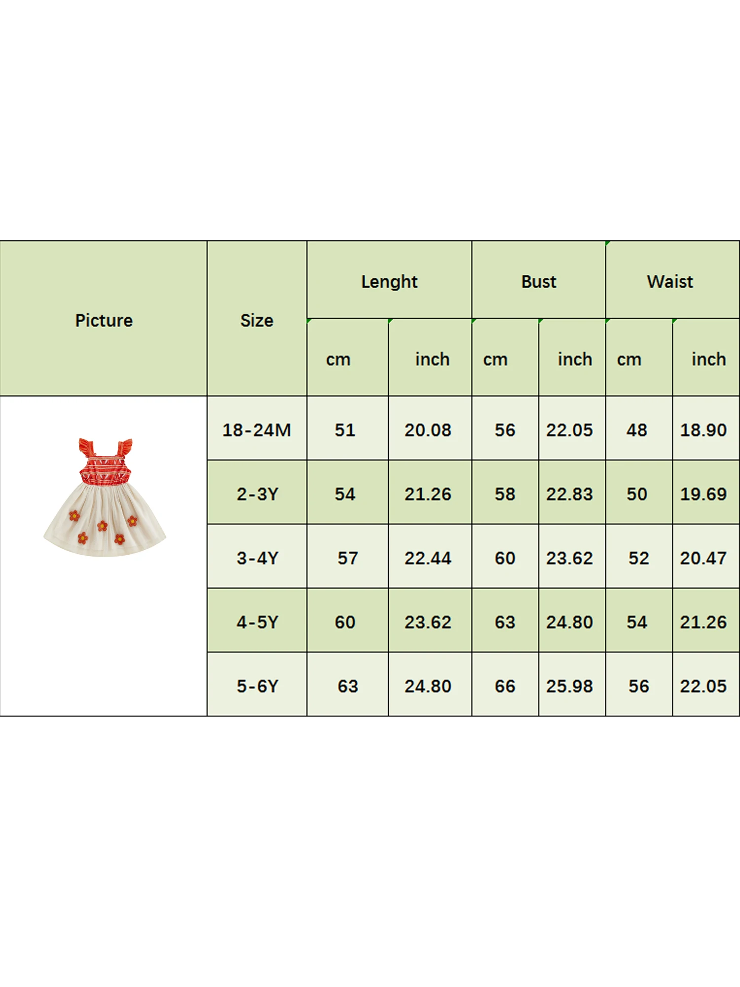 Tamaño (cm) 18-24M Longitud: 51 Busto: 56 Cintura: 48 Edad recomendada: 18-24 meses 2-3Y Longitud: 54 Busto: 58 Cintura: 50 Edad recomendada: 2-3 años 3-4Y Longitud: 57 Busto: 60 Cintura: 52 Edad recomendada: 3-4 años 4-5Y Longitud: 60 Busto: 63 Cintura: 54 Edad recomendada: 4-5 años 5-6 años Longitud: 63 Busto: 66 Cintura: 56 Edad recomendada: 5-6 años Tamaño (pulgadas) 18-24M Longitud: 20,08 Busto: 22,05 Cintura: 18,90 Edad recomendada: 18-24 meses 2-3 años Longitud: 21.26 Busto: 22,83 Cintura: 19,69 Edad recomendada: 2-3 años 3-4Y Longitud: 22,44 Busto: 23,62 Cintura: 20,47 Edad recomendada: 3-4 años 4-5 años Longitud: 23,62 Busto: 24,80 Cintura: 21.26 Edad recomendada: 4-5 años 5-6 años Longitud: 24,80 Busto: 25,98 Cintura: 22,05 Edad recomendada: 5-6 años