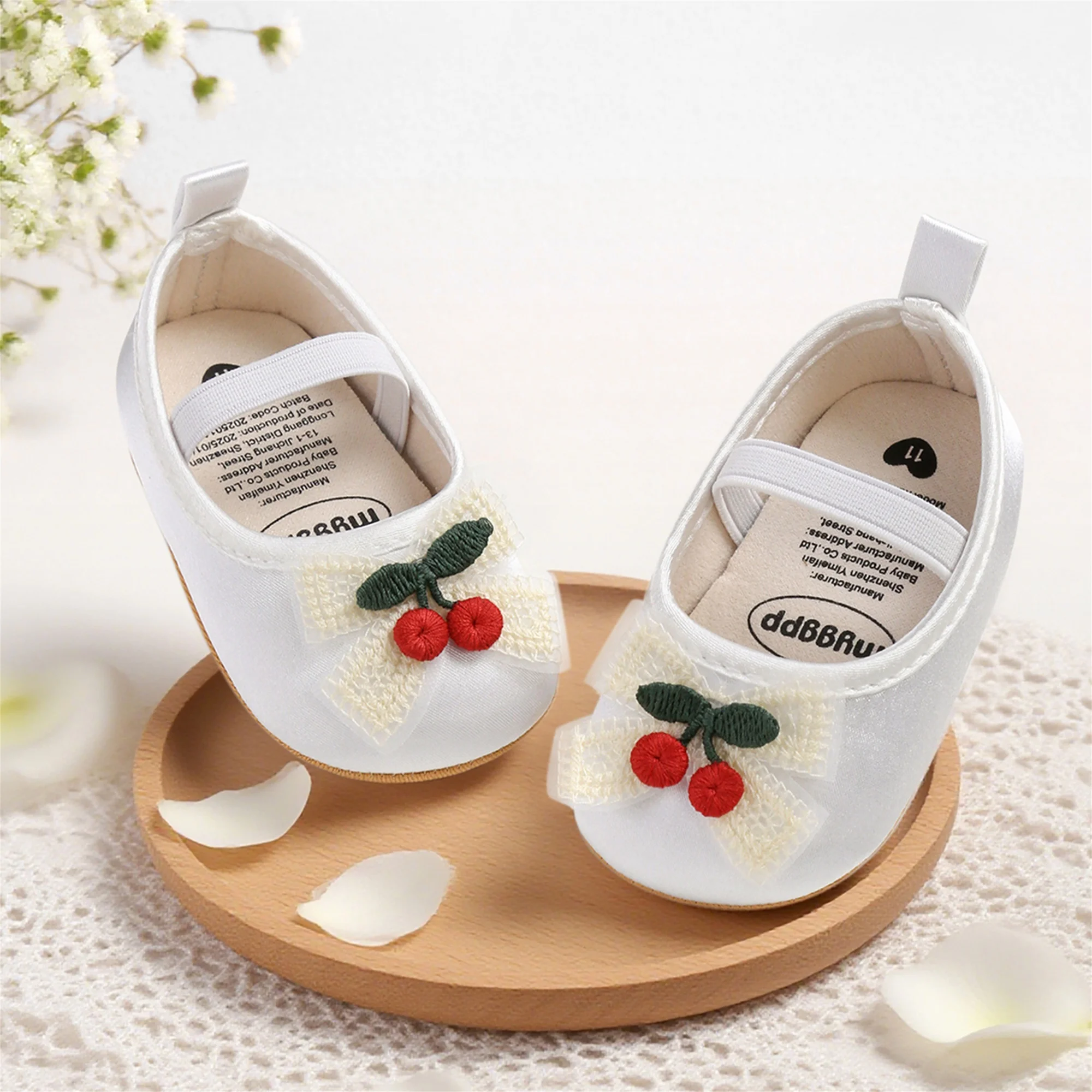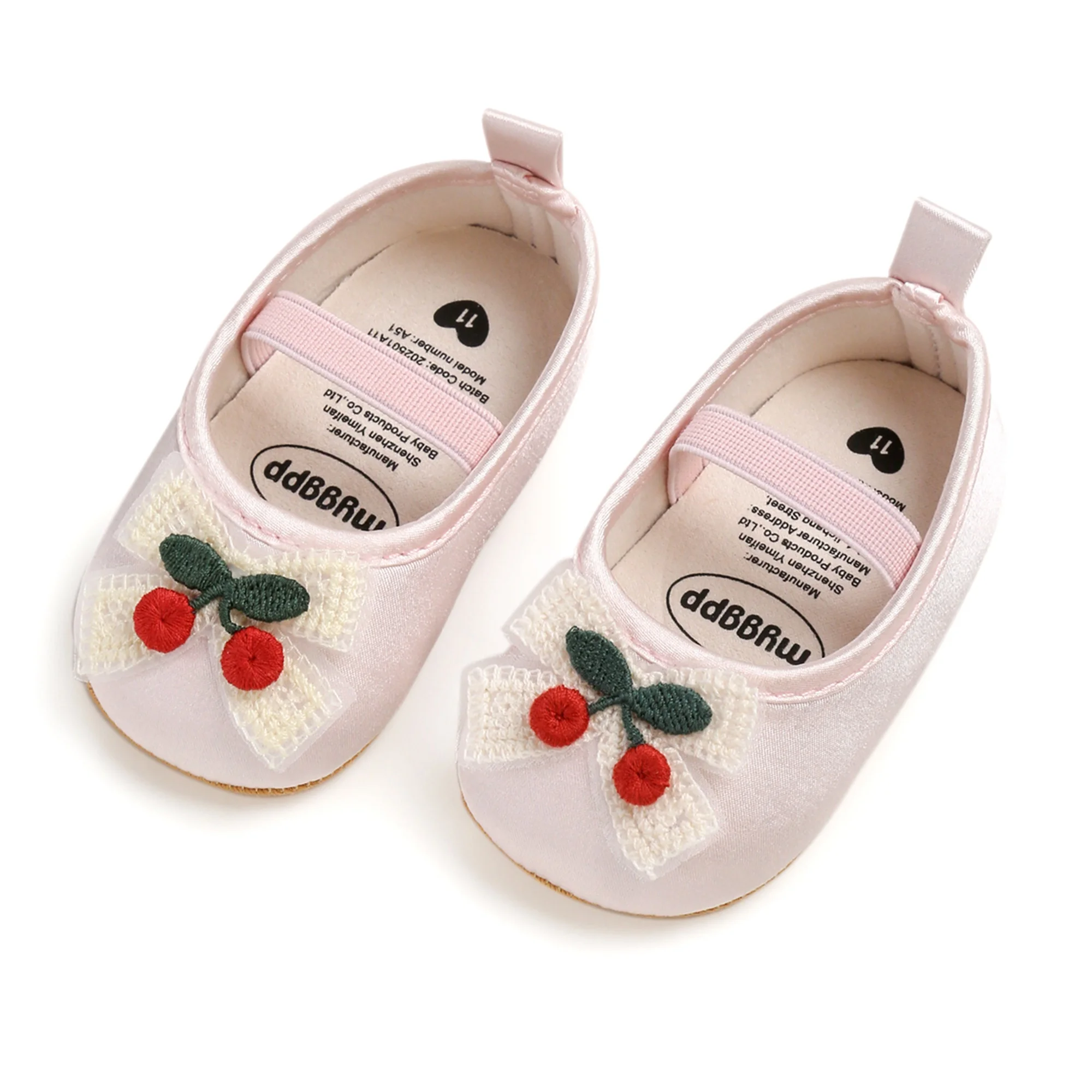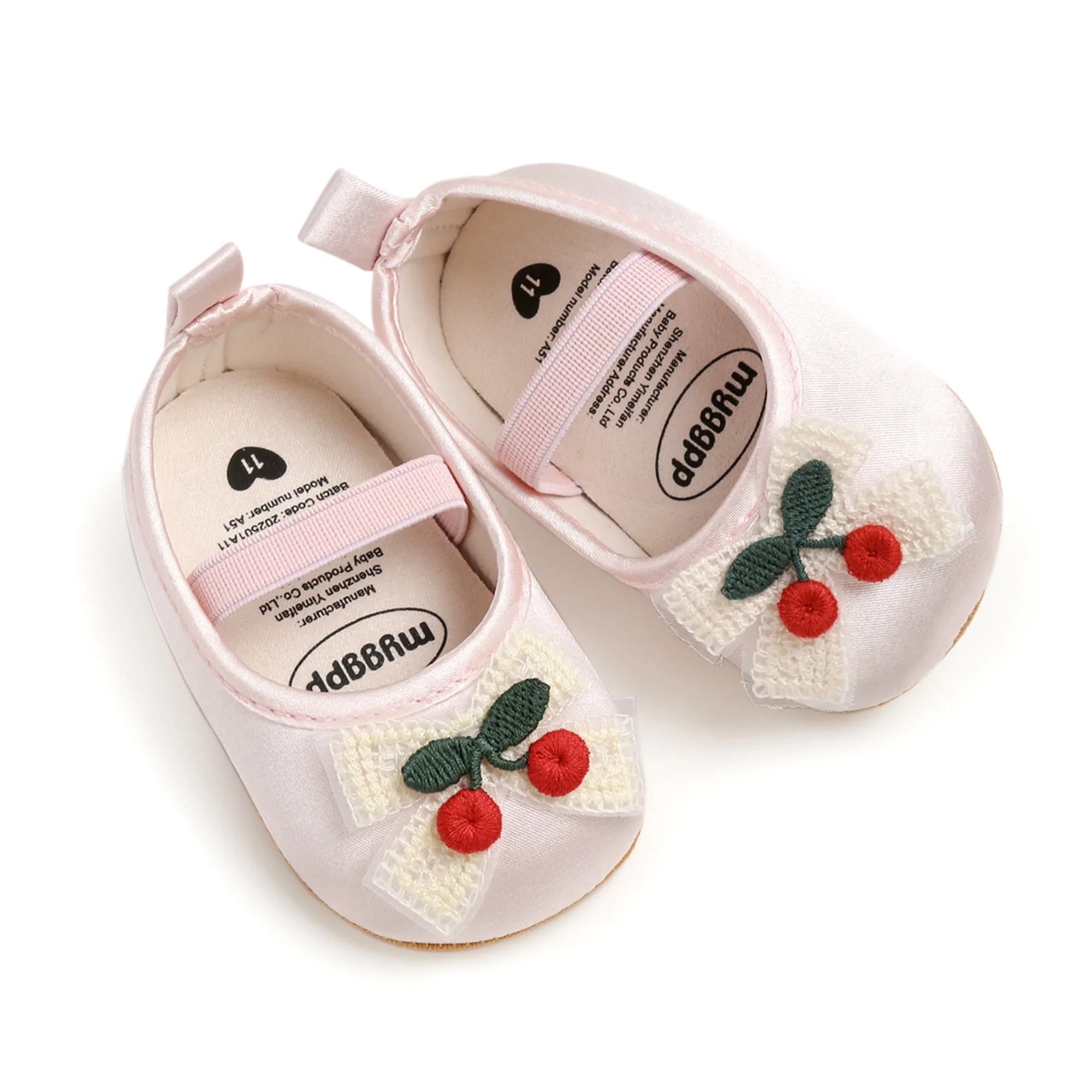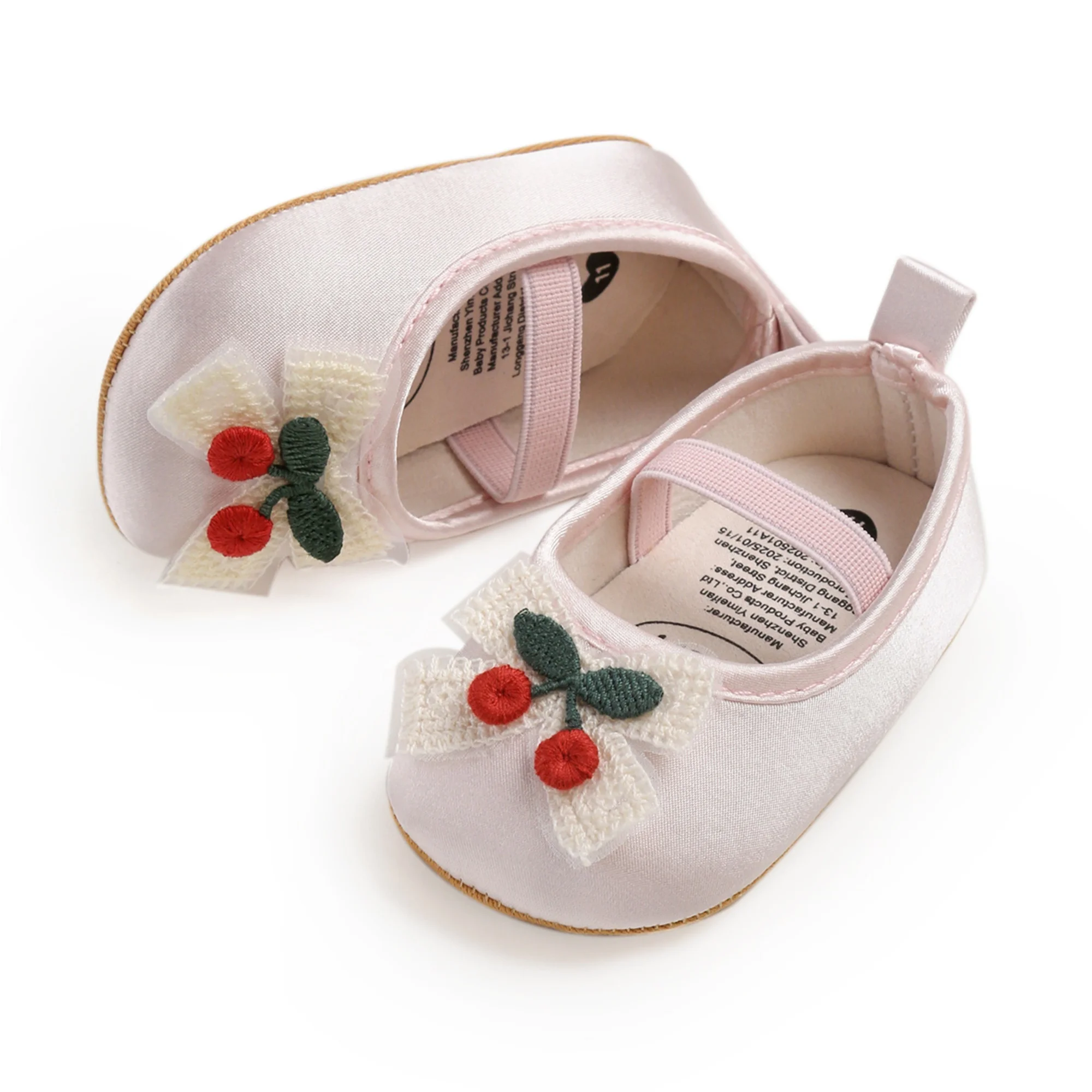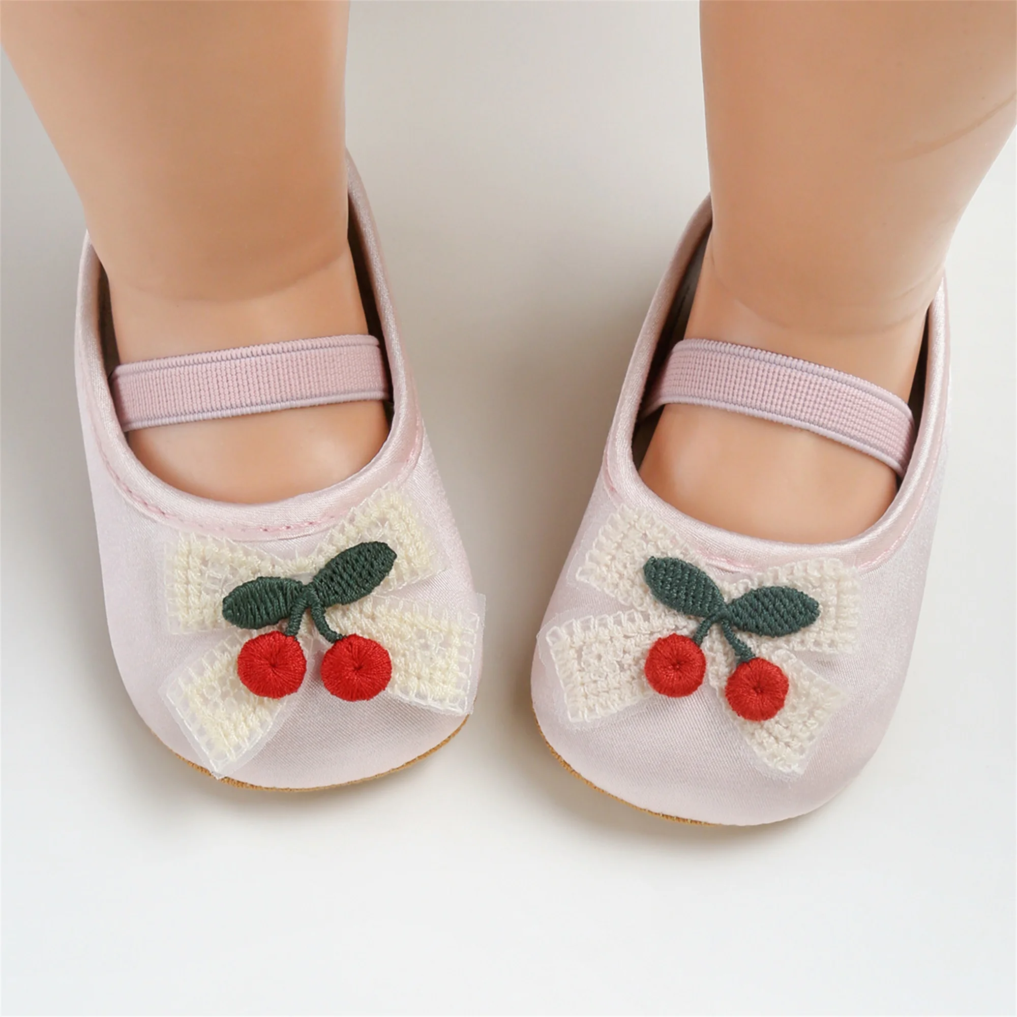 Zapatos de princesa para niñas, zapatos para primeros pasos con fondo antideslizante suave con lazo de cereza, zapatos para niños pequeños