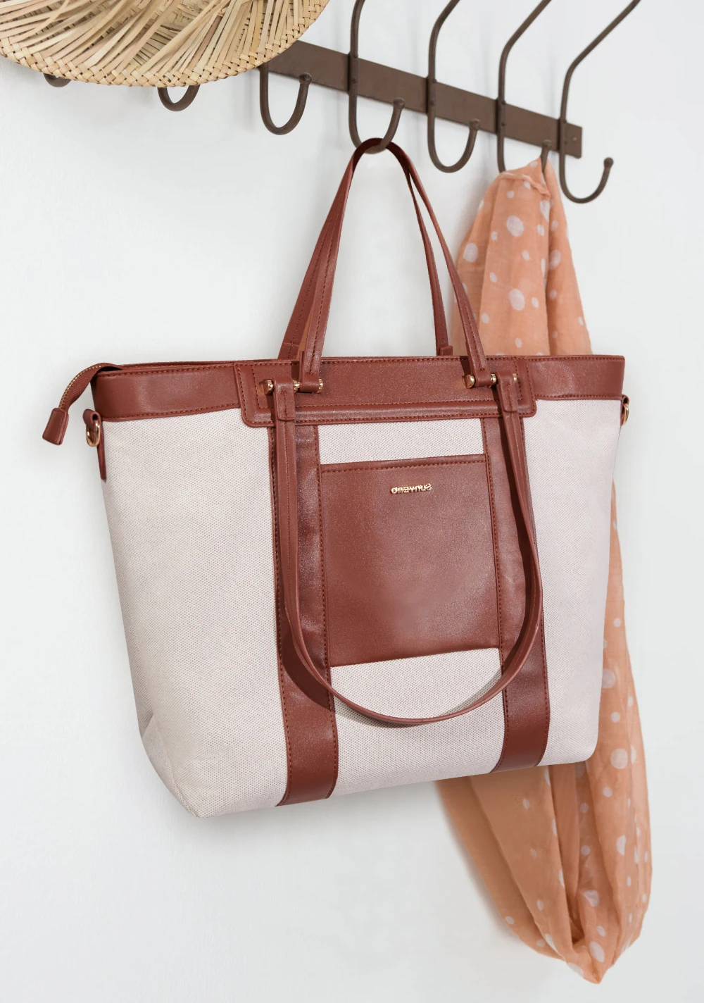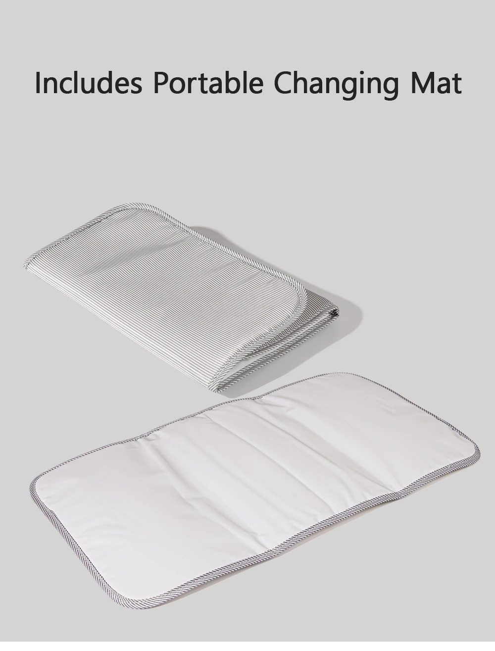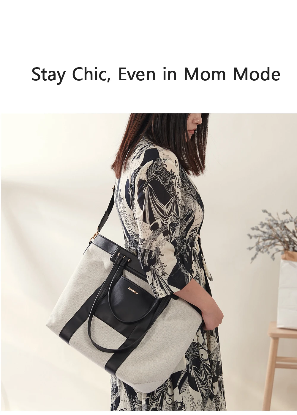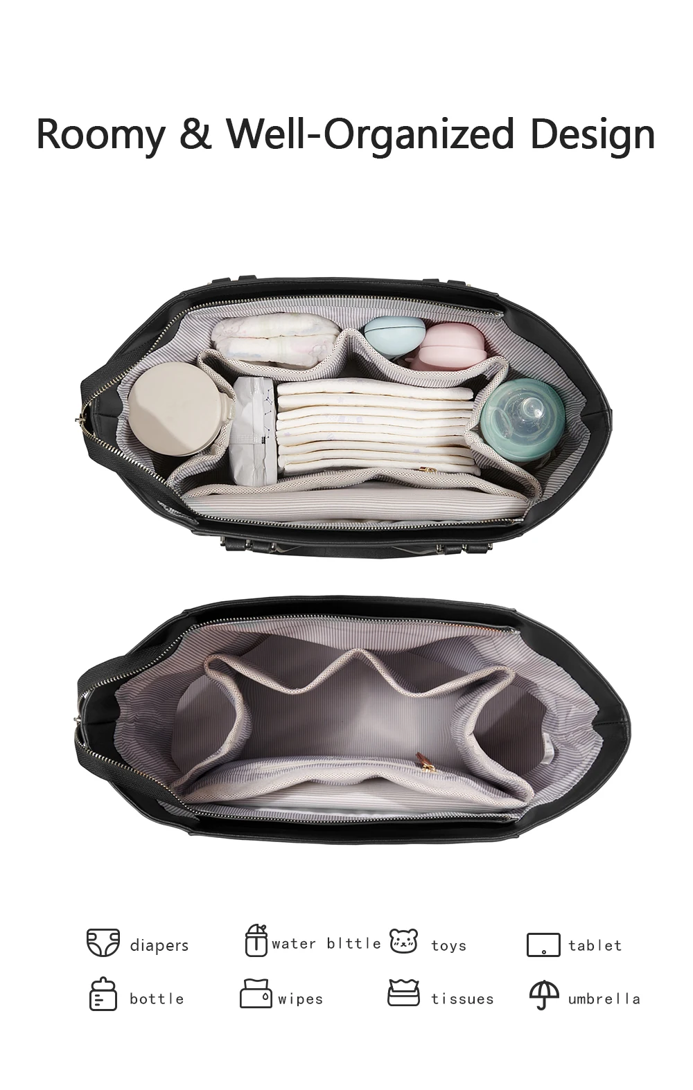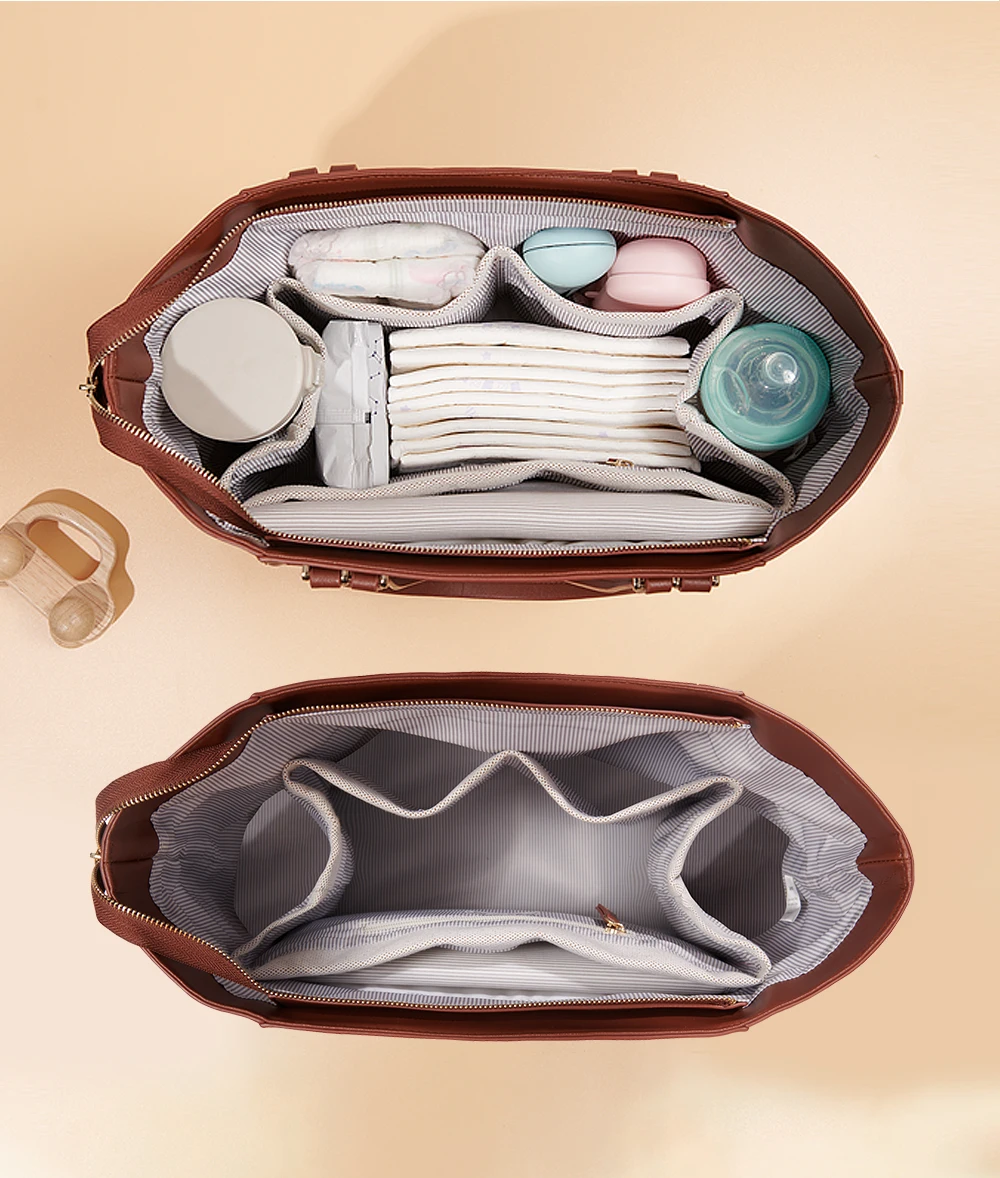 Este espacioso bolso de mano cuenta con un amplio compartimento principal y un cierre de cremallera superior que deja espacio a los lados, lo que le permite acceder a los bolsillos laterales profundos sin abrir la cremallera.También viene con un cambiador de pañales a juego, para que puedas mantenerte preparado para cualquier cambio repentino.Puedes transportarlo de cuatro maneras: correas cortas en las manos, correas más largas en los codos, una correa para el hombro desmontable o anillos en D para sujetarlo a un cochecito, silla de ruedas, scooter o andador.Perfecto para padres que viajan y lo suficientemente elegante para la oficina.