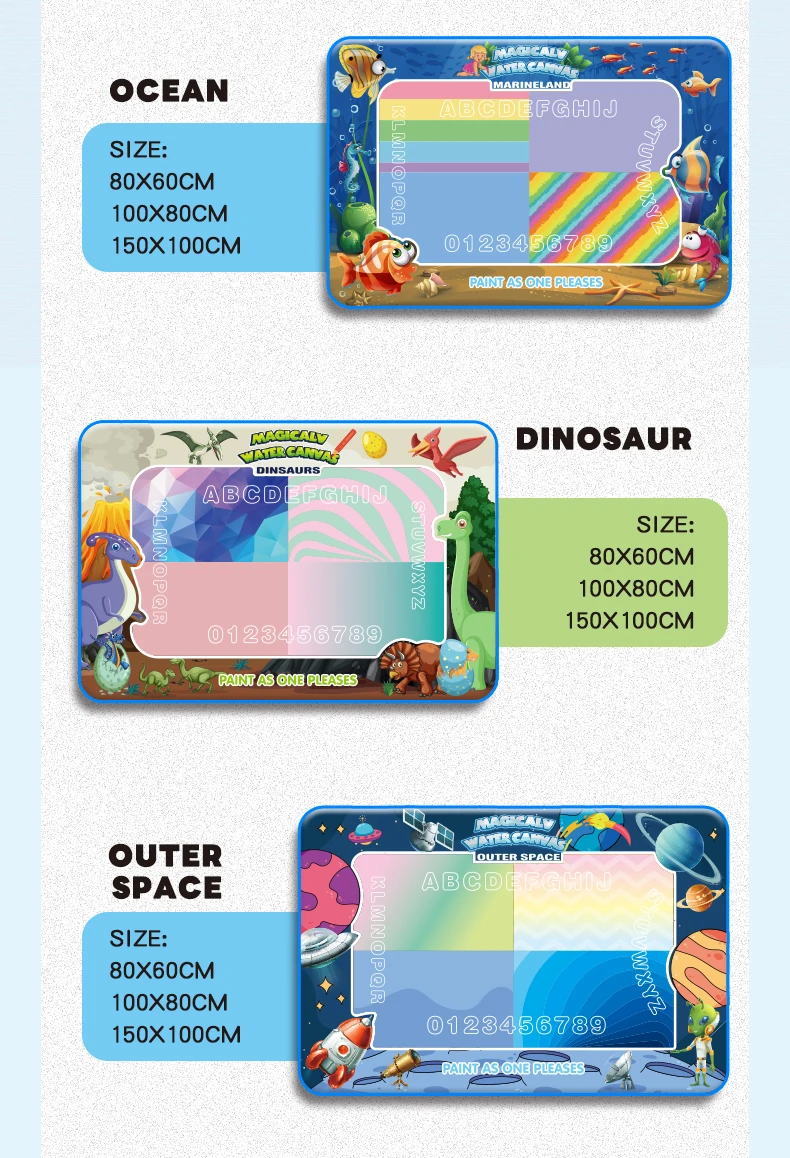 Tapete de dibujo al agua: tamaño grande. Patrón de animal/dinosaurio/océano/espacial. Sea fácil de usar. Se puede plegar en un tamaño compacto. Portátil para interiores y exteriores y viajes. Un gran juguete de aprendizaje para niños pequeños. Un buen juguete de interacción para niños y niñas.