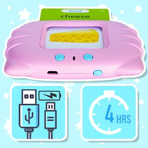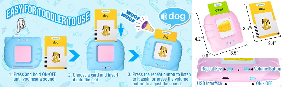[Recargable y ligero]-El juguete para niños pequeños viene con una batería recargable incorporada y se puede usar hasta 4,5 horas, sin necesidad de cargar con frecuencia. El lector de tarjetas pesa 71g y las dimensiones son 4*3,5*0,5 pulgadas, fácil de sostener para los niños. El volumen es ajustable. Un juguete portátil para tus hijos.