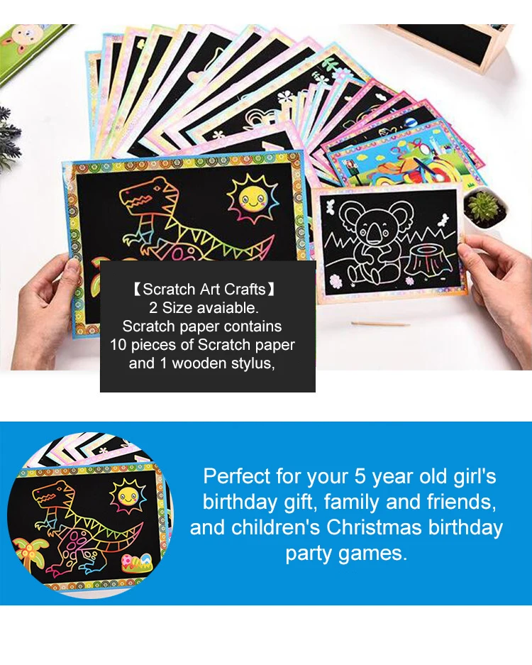 【Scratch Art Crafts】Scratch Paper contiene 10 piezas de papel Scratch y 1 lápiz óptico de madera, perfecto para el regalo de cumpleaños de su niña de 5 años, familiares y amigos, y juegos de fiesta de cumpleaños de Navidad para niños.