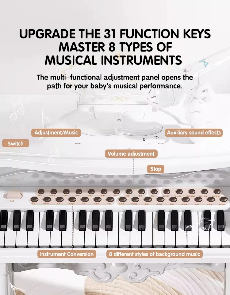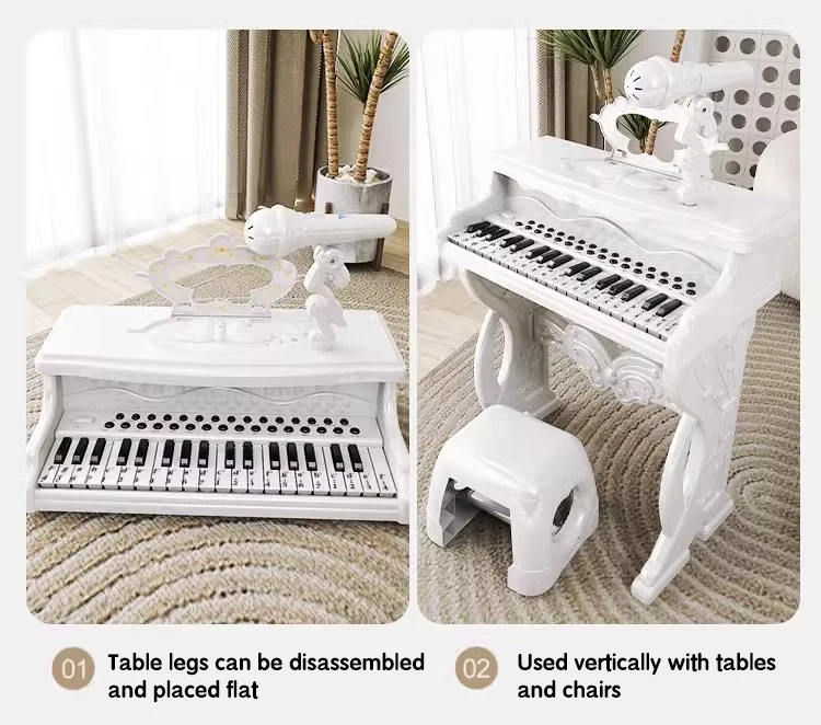3. El órgano electrónico tiene patas de mesa desmontables para uso plano o puede colocarse en posición vertical con una mesa y una silla.Cuenta con 10 canciones, 6 tipos de cambio de instrumentos, 8 estilos de música de fondo y múltiples métodos de reproducción.El bebé puede formar un grupo.