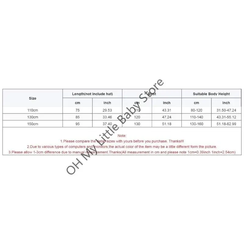 Tamaño: 130 cm Longitud (no incluye sombrero): 85 cm (33,46 pulgadas) Busto: 120 cm (47,24 pulgadas) Altura del cuerpo adecuada: 110-140 cm (43,31-55,12 pulgadas)