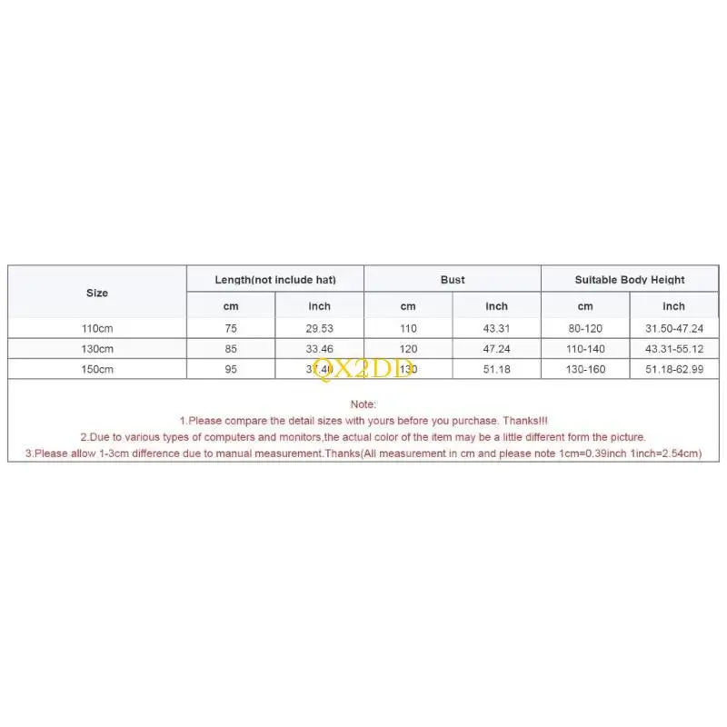 Tamaño: 130 cm Longitud (no incluye sombrero): 85 cm (33,46 pulgadas) Busto: 120 cm (47,24 pulgadas) Altura del cuerpo adecuada: 110-140 cm (43,31-55,12 pulgadas)