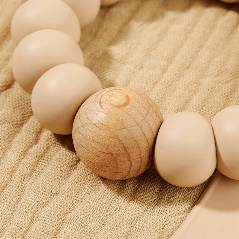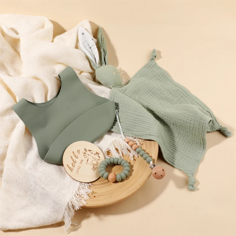 Hecho de silicona y algodón, y este juego incluye una manta de seguridad suave, un babero de silicona, una cadena para chupete, anillos para la dentición y piezas para una experiencia integral.