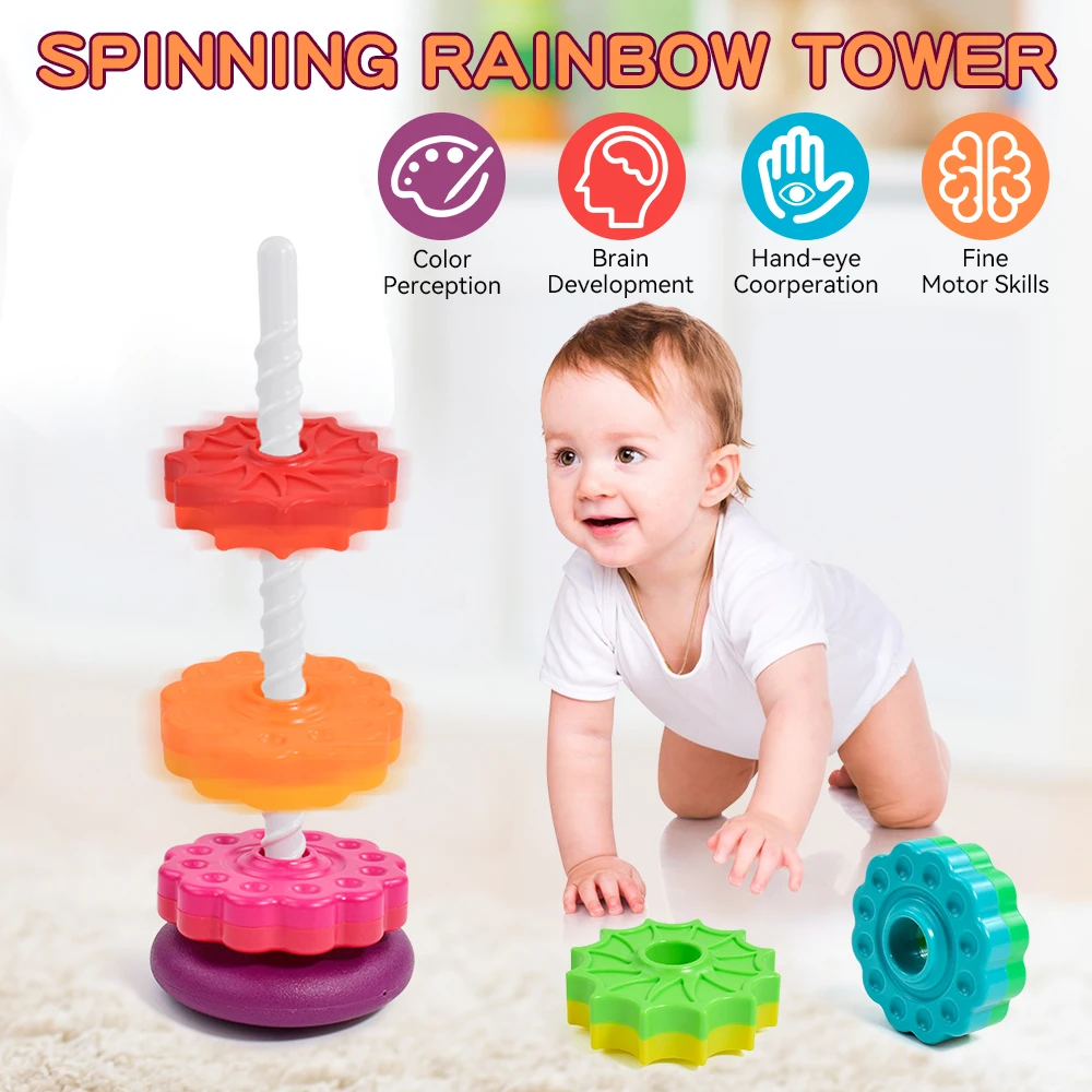 Comprar Torre de arcoíris giratoria Montessori para bebé, rompecabezas apilable, juguetes de seguridad, juguete educativo para edades tempranas, juguetes de colores de seguridad para niños