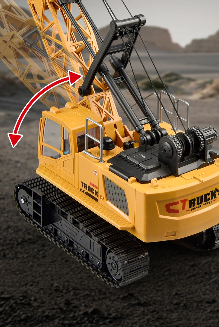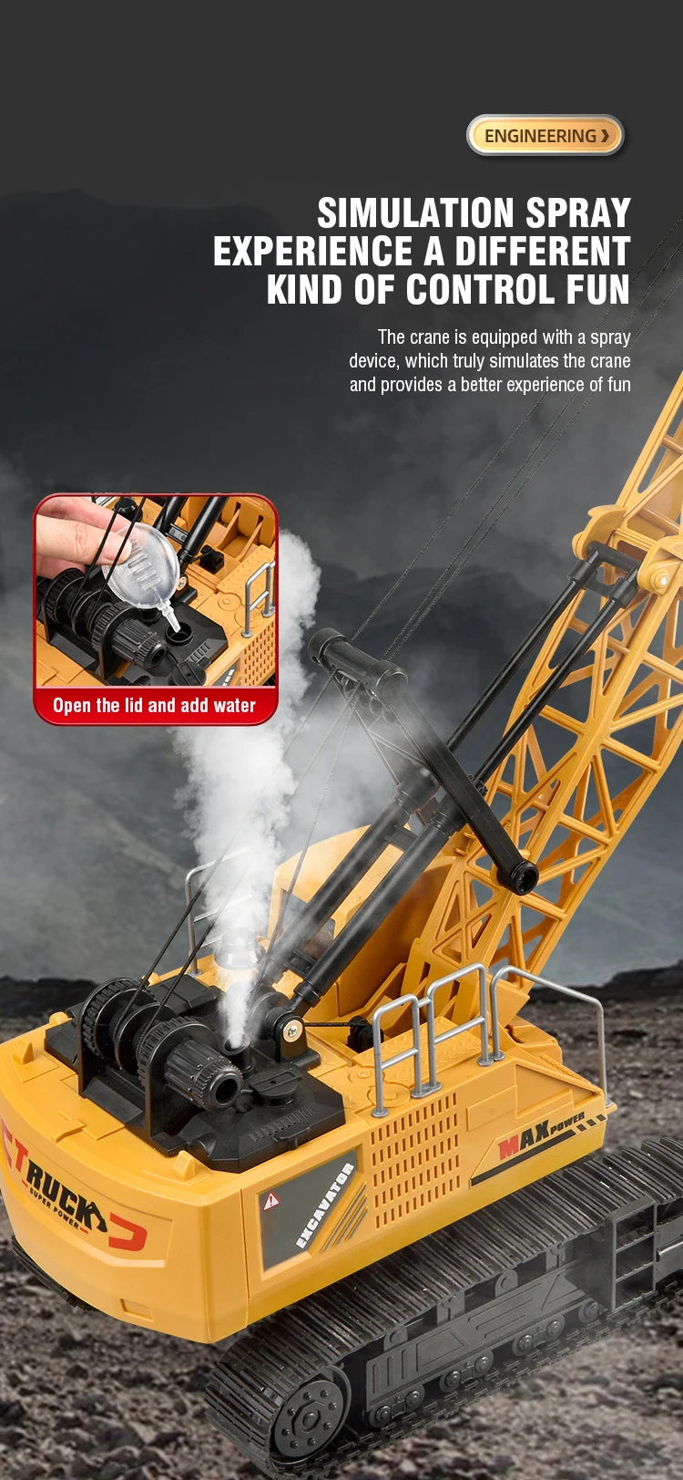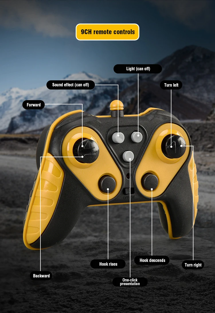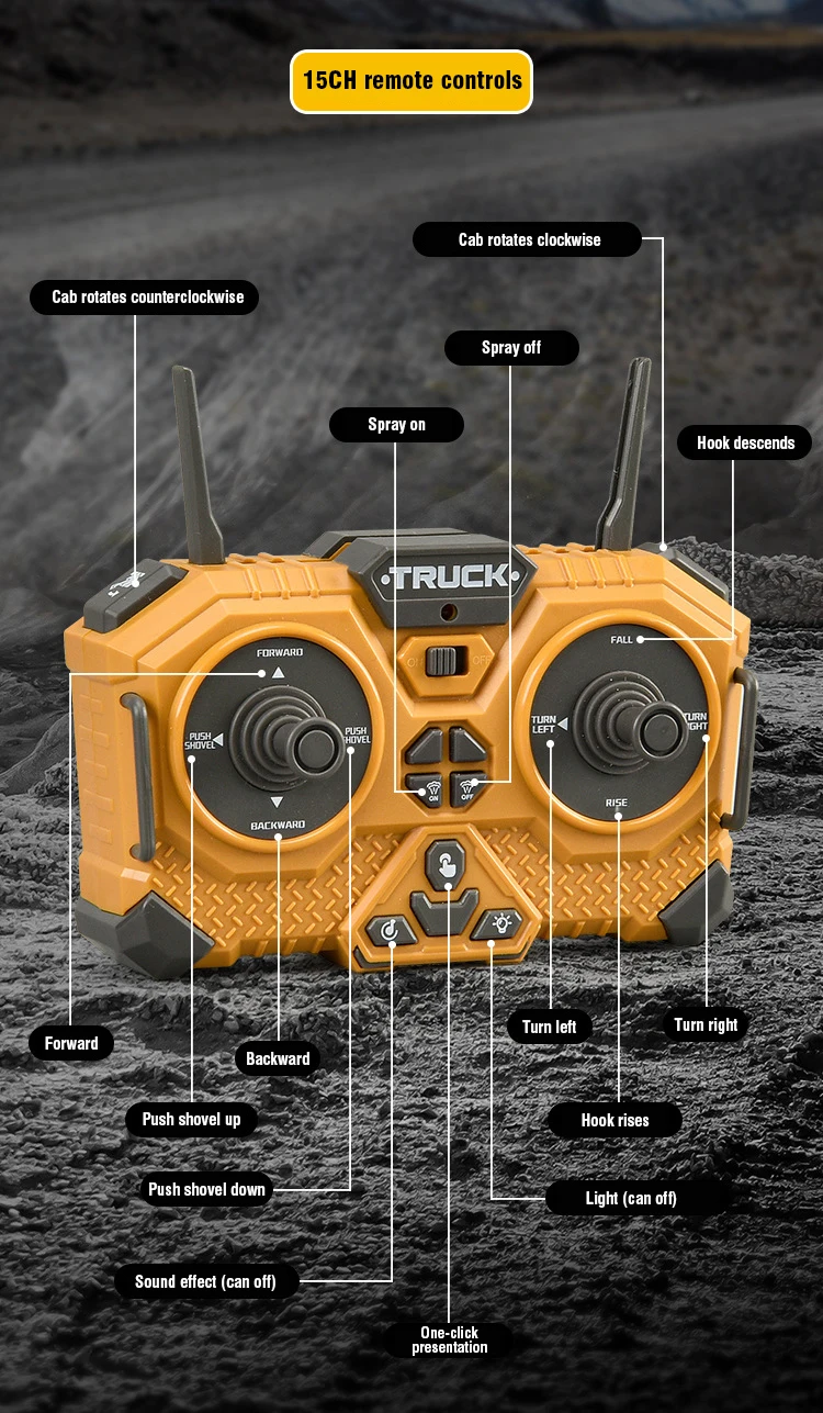 13 canales: adelante, atrás, giro a la izquierda, giro a la derecha, 680 grados de plataforma giratoria, gancho de elevación ascendente, descendente, efecto de sonido, luz, spray, pala de empuje, demostración con un botón