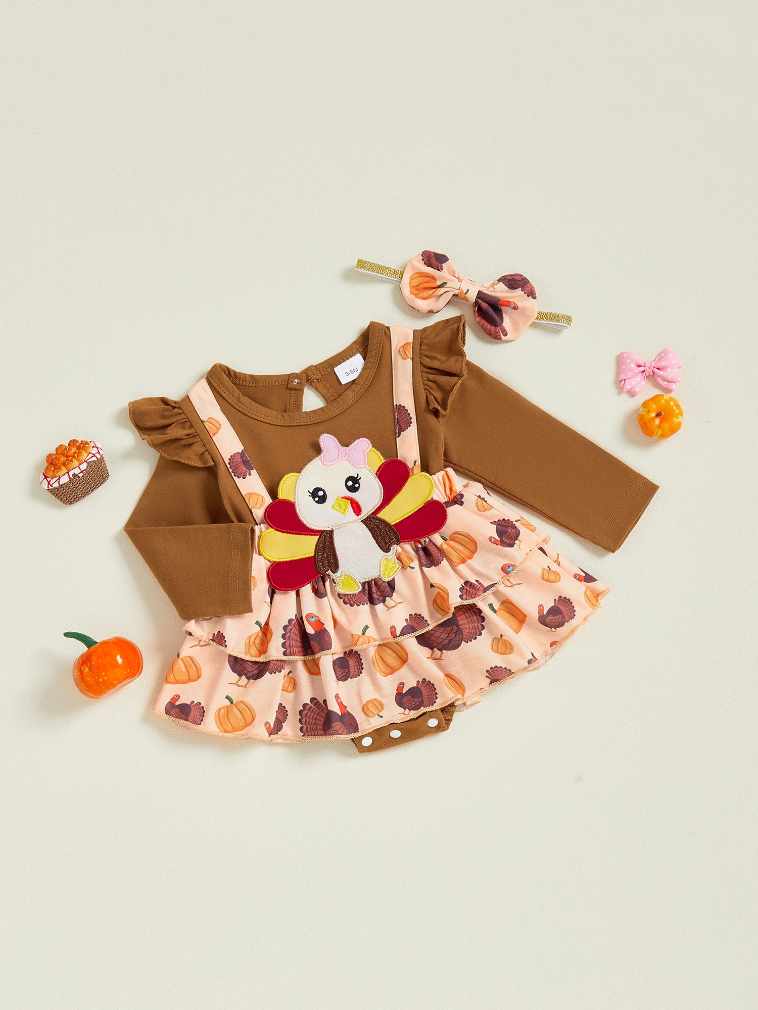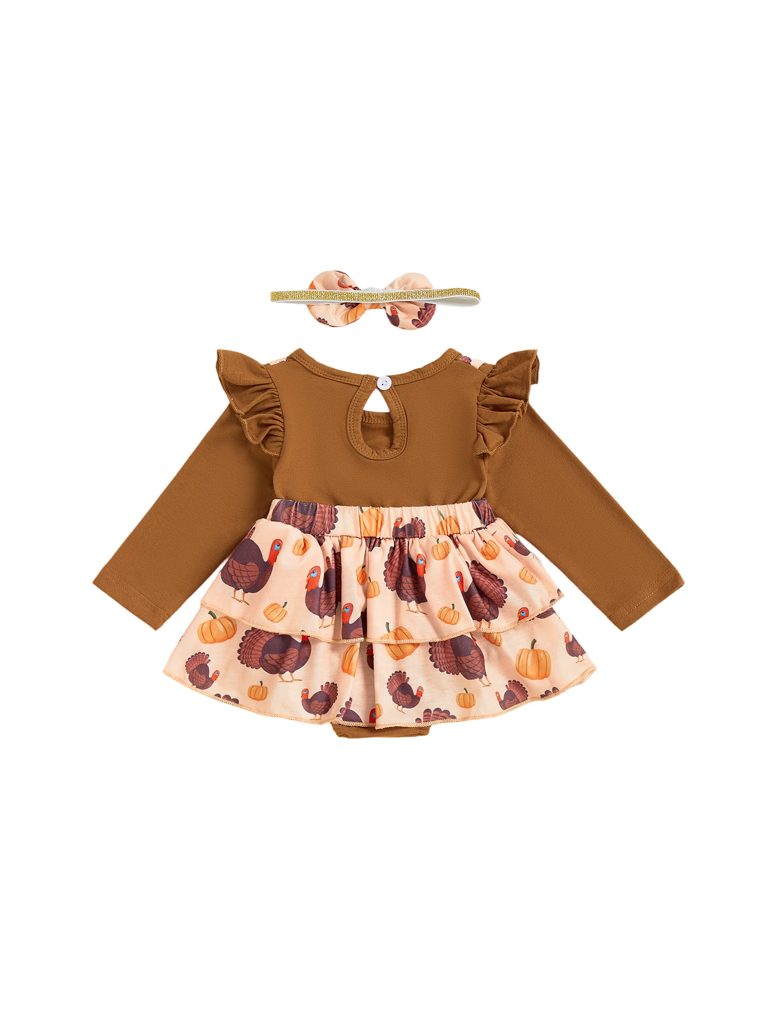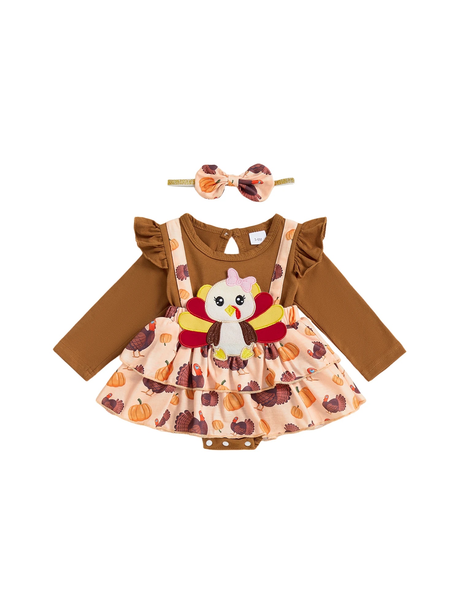 Traje de Acción de Gracias para niña de 0 a 18 meses, vestido mameluco de manga larga con volantes de pavo y diadema con lazo, conjunto de 2 piezas para otoño