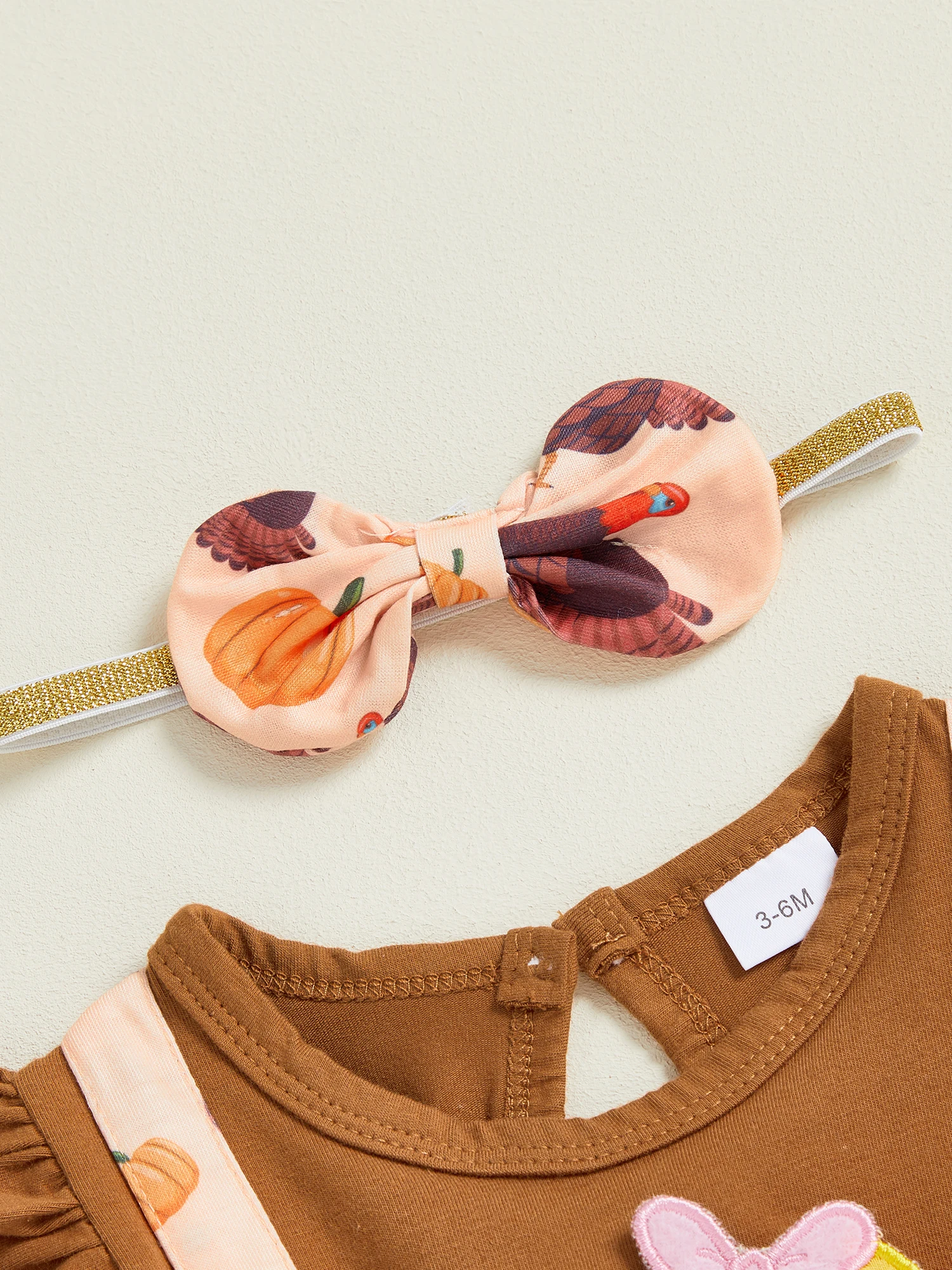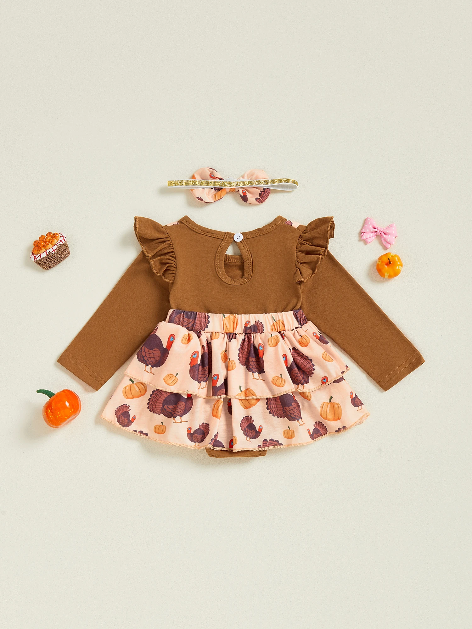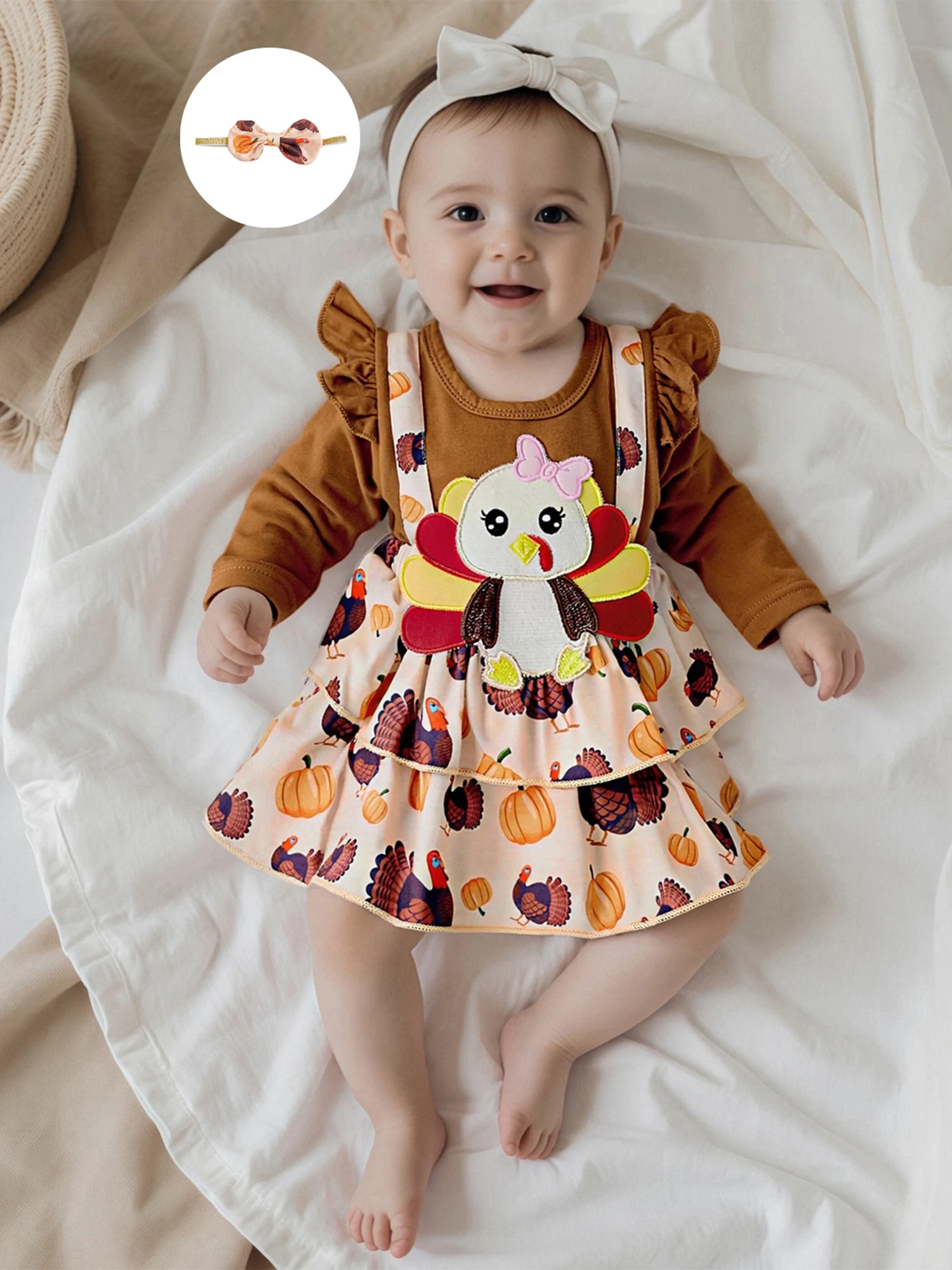 Traje de Acción de Gracias para niña de 0 a 18 meses, vestido mameluco de manga larga con volantes de pavo y diadema con lazo, conjunto de 2 piezas para otoño