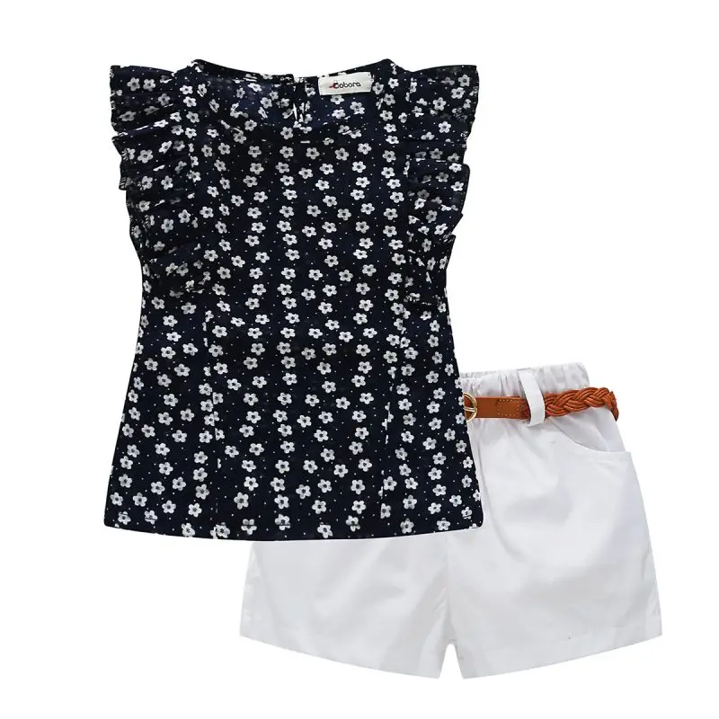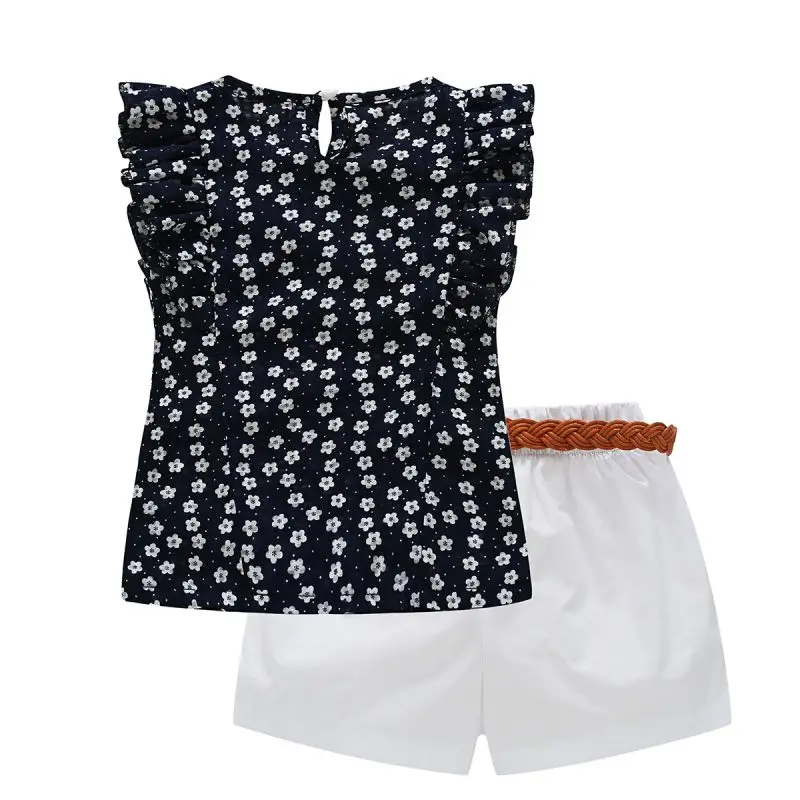Traje de algodón para niña de verano, Blusa con volantes dulces con patrón de flores + corto sólido + cinturón de cuero, conjunto de ropa fresca para salir a la moda para niños de 3 a 7 años