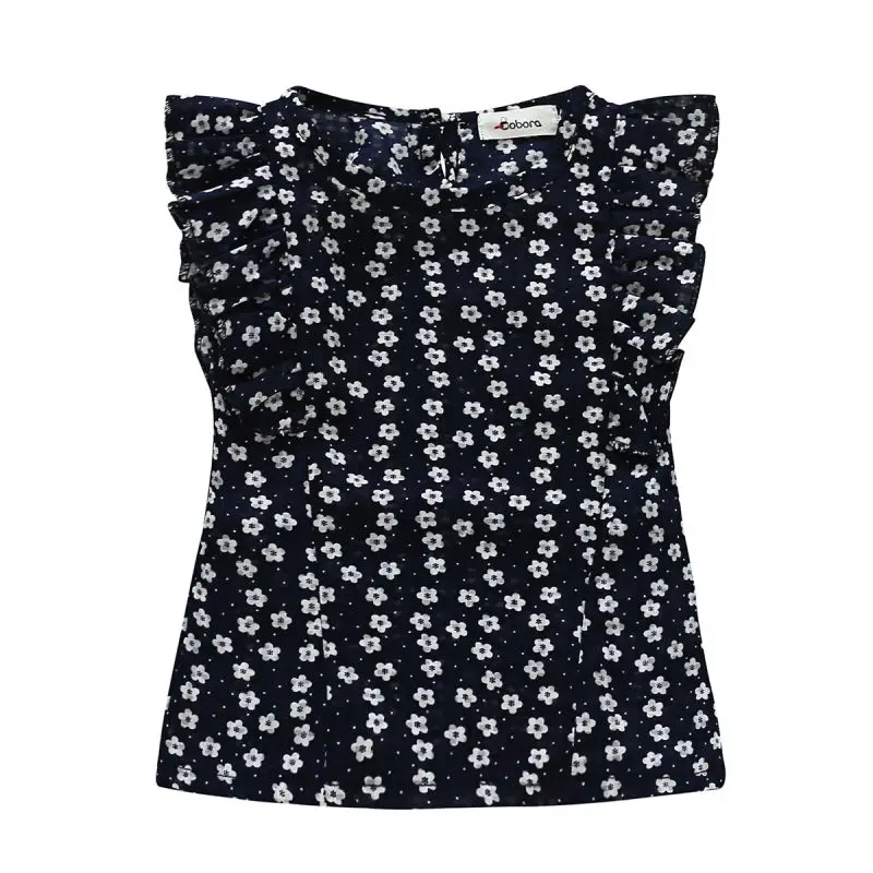 Traje de algodón para niña de verano, Blusa con volantes dulces con patrón de flores + corto sólido + cinturón de cuero, conjunto de ropa fresca para salir a la moda para niños de 3 a 7 años