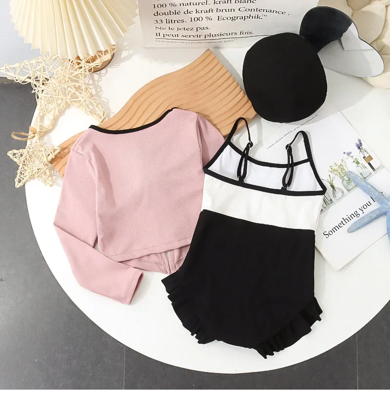 Comprar Traje de baño con lazo para niña, conjunto de gorro, moda coreana, Color negro y rosa, Verano