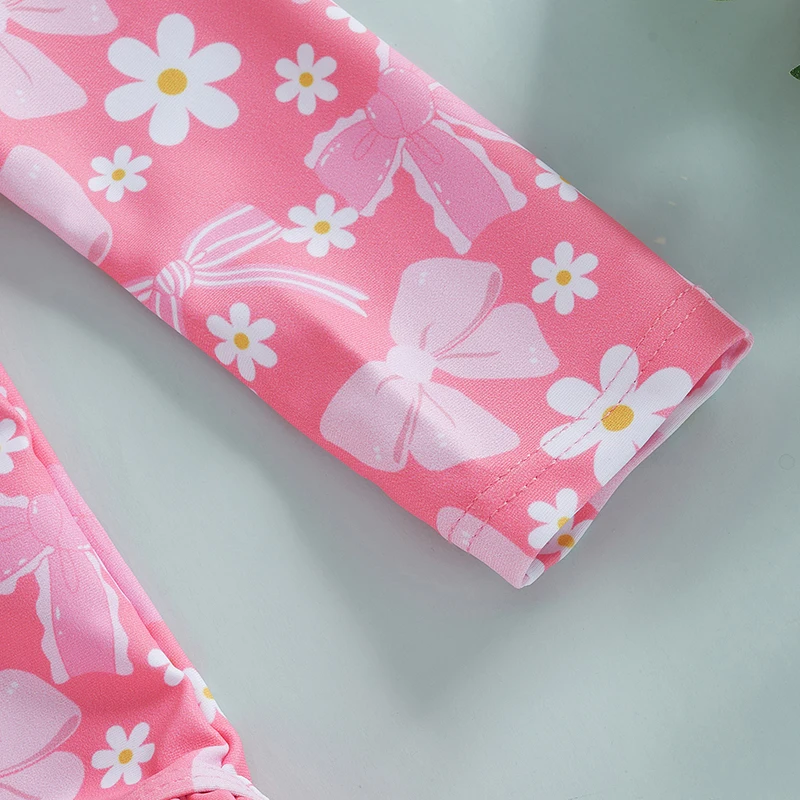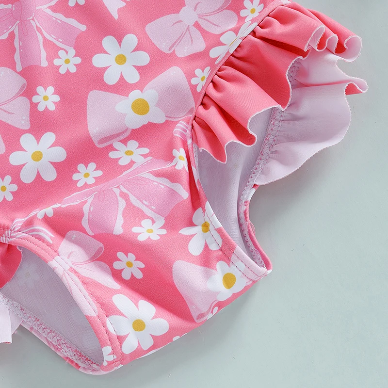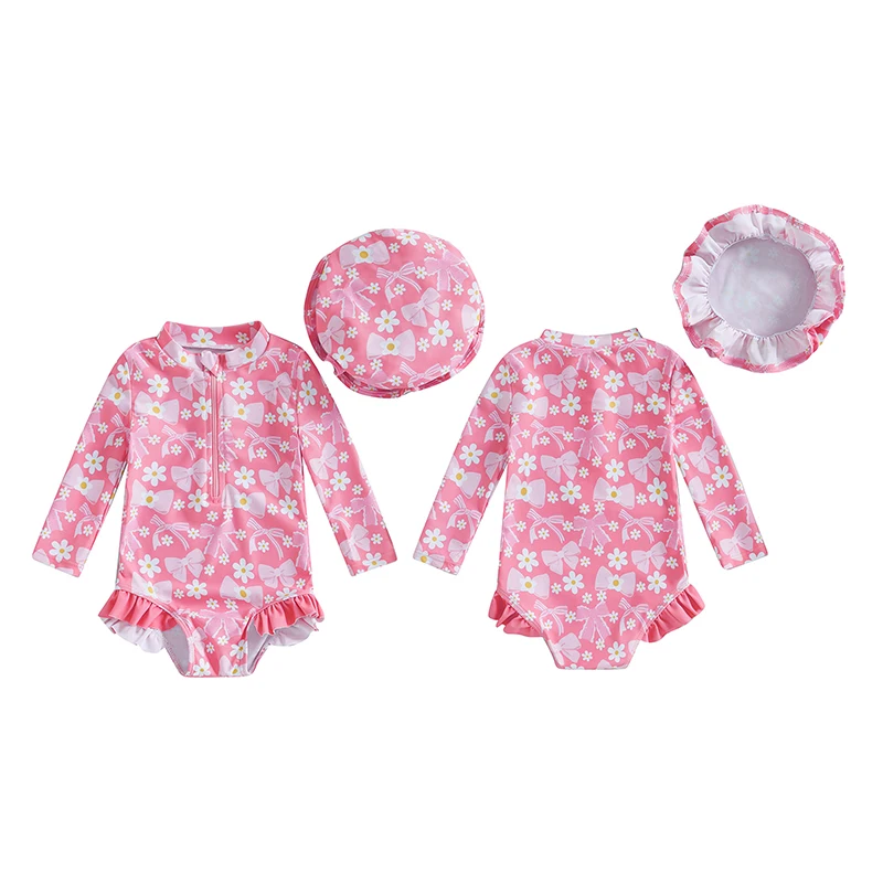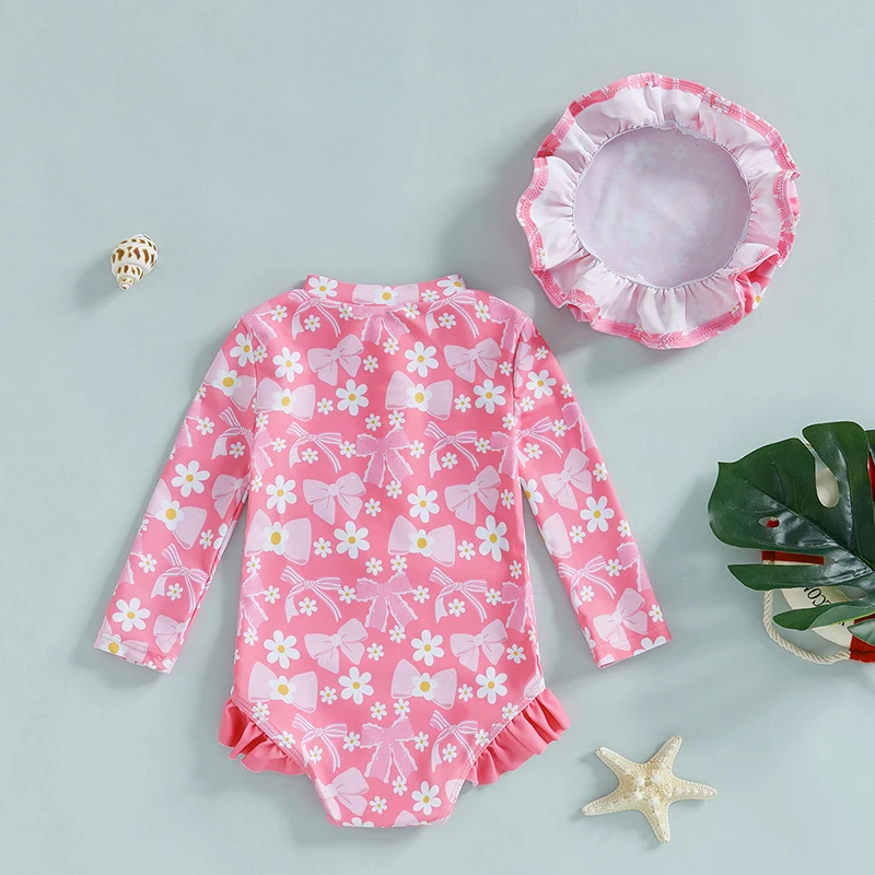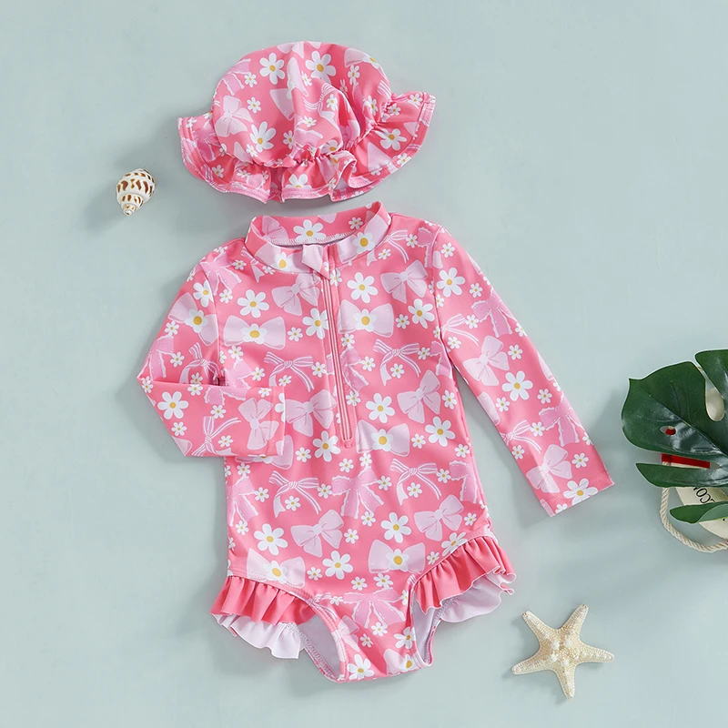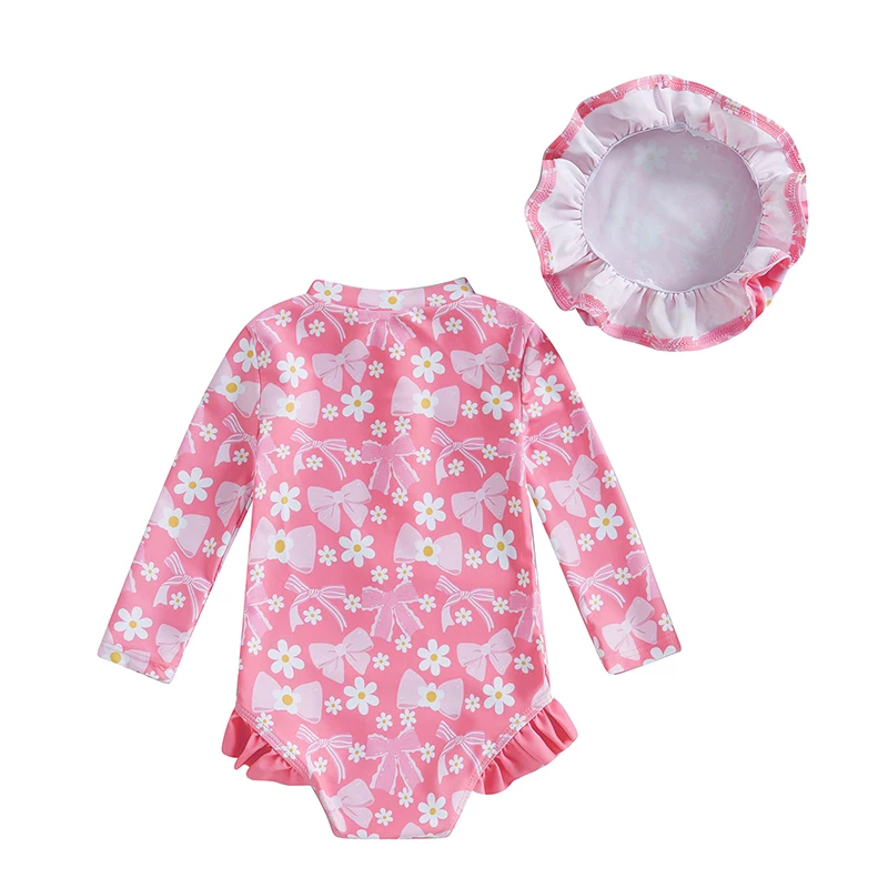 Comprar Traje de baño de protección contra sarpullidos para niñas pequeñas, mameluco de manga larga con cuello redondo y estampado de lazo, mameluco de natación para playa con sombrero