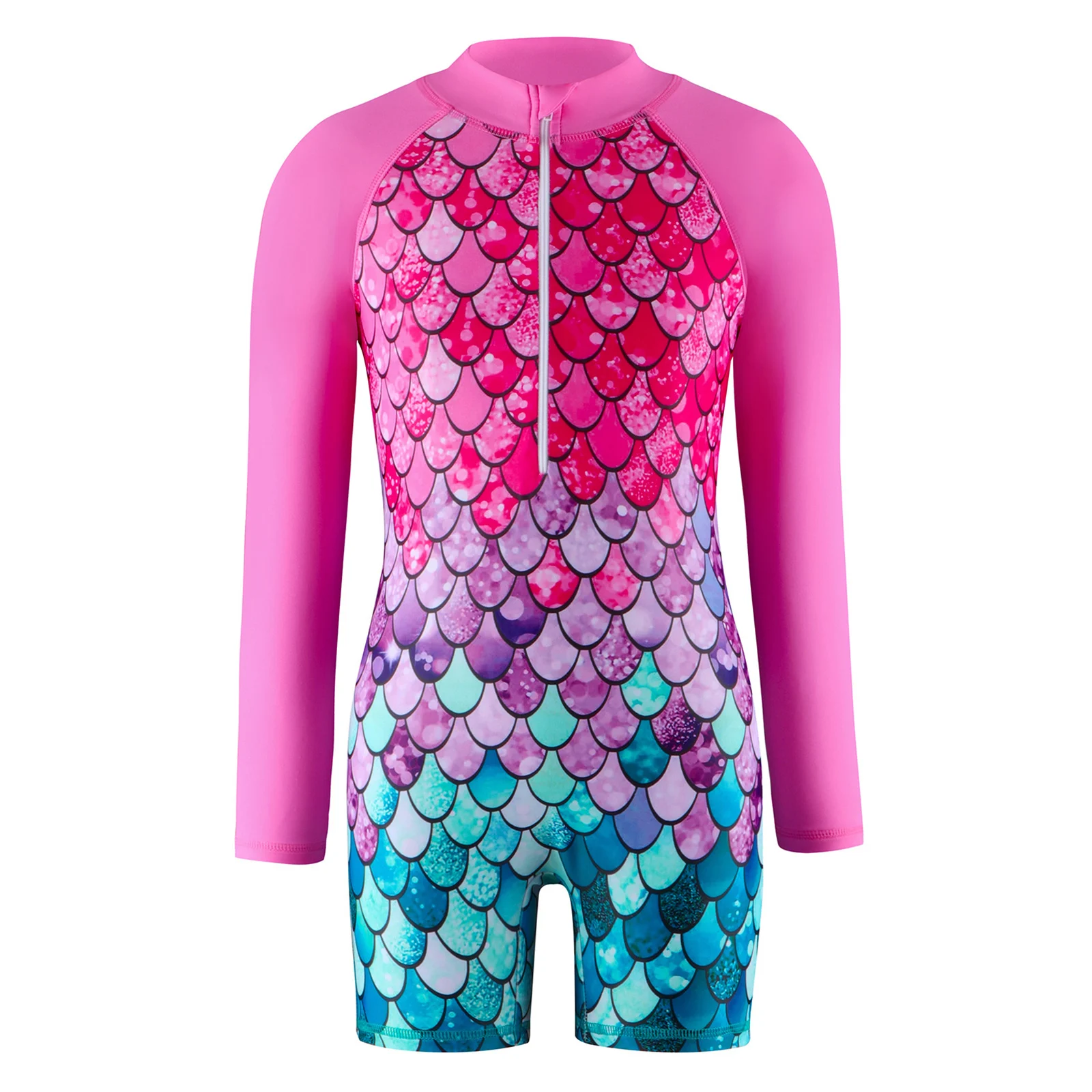 Comprar Traje de baño de una pieza para niños y niñas, mono de natación con estampado de escamas de pescado de sirena, manga larga, ropa de playa, traje de baño para surfear, protector de erupción