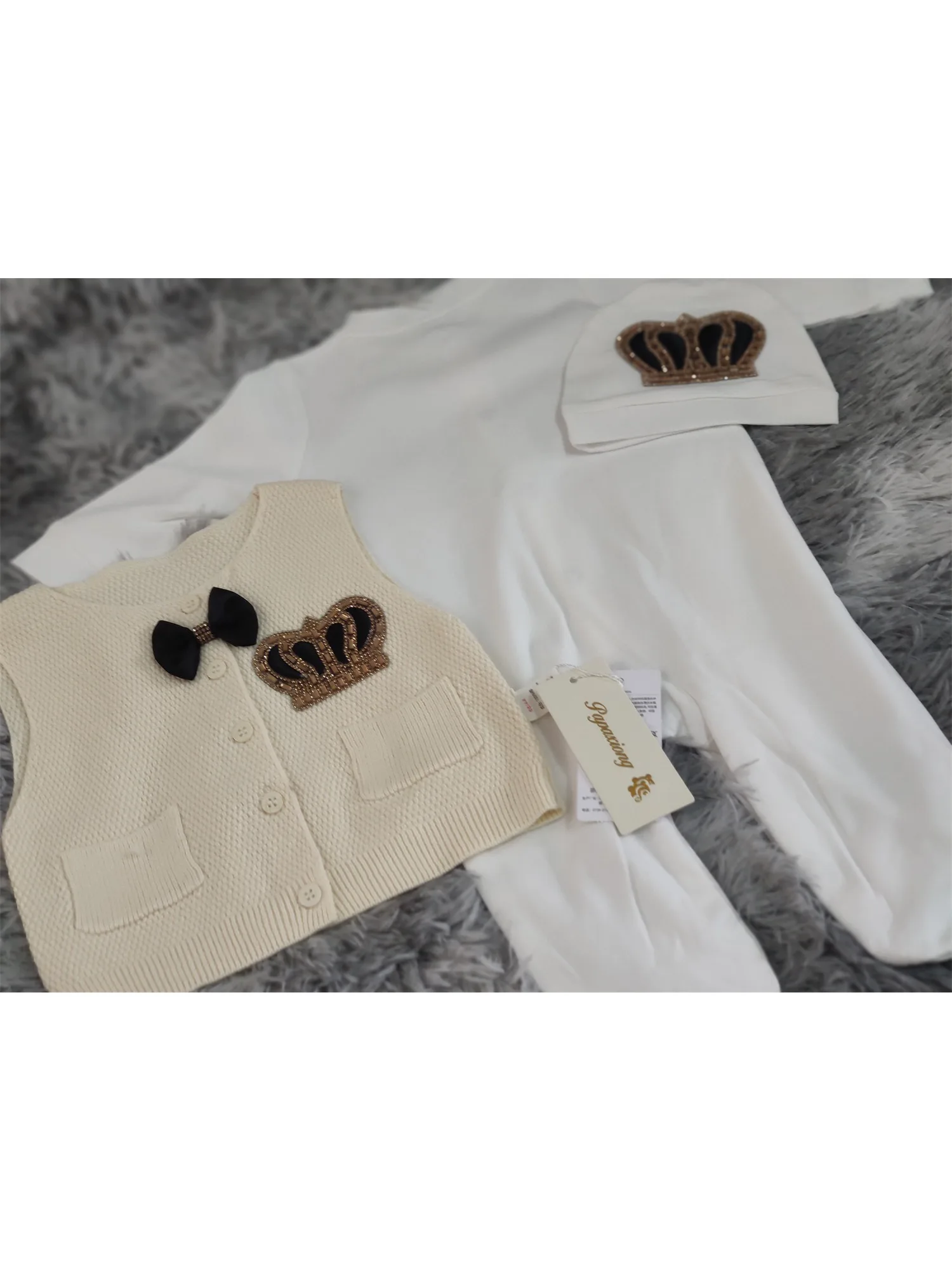 Traje de corona dorada y negra color crema para bebé, chaleco de punto, gorro de mono con corona de diamantes de imitación y pajarita, formal para bautismo, baby shower