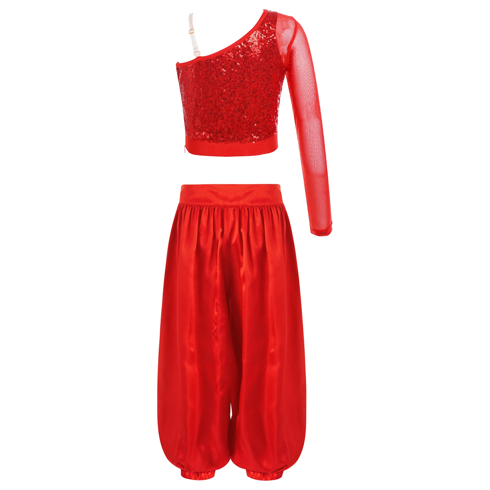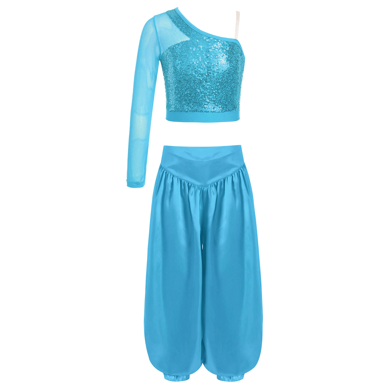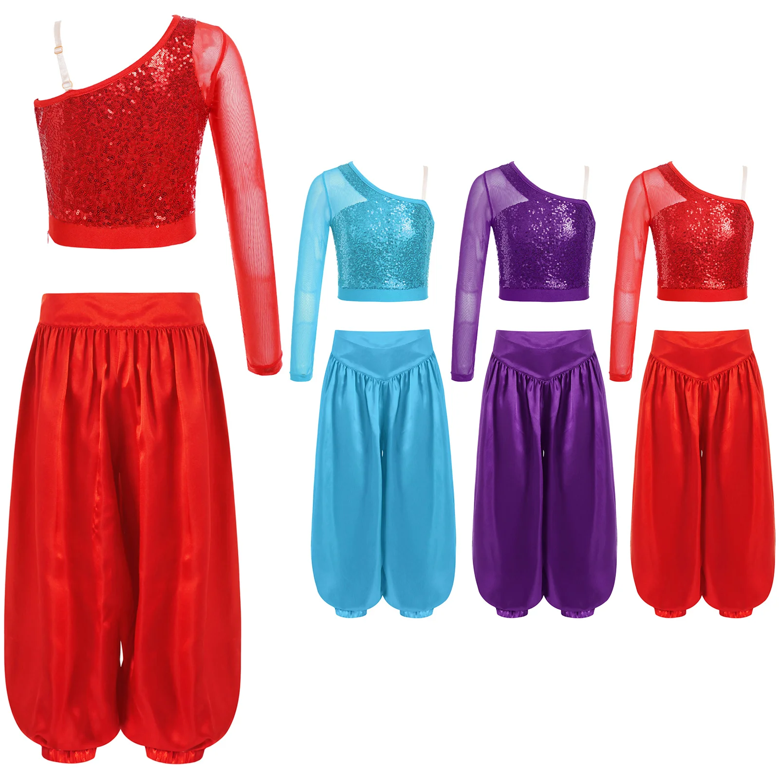 Comprar Traje de danza del vientre para niñas, Top corto de malla transparente de manga larga con un hombro y cremallera lateral, Top corto de lentejuelas brillantes con pierna ancha de satén
