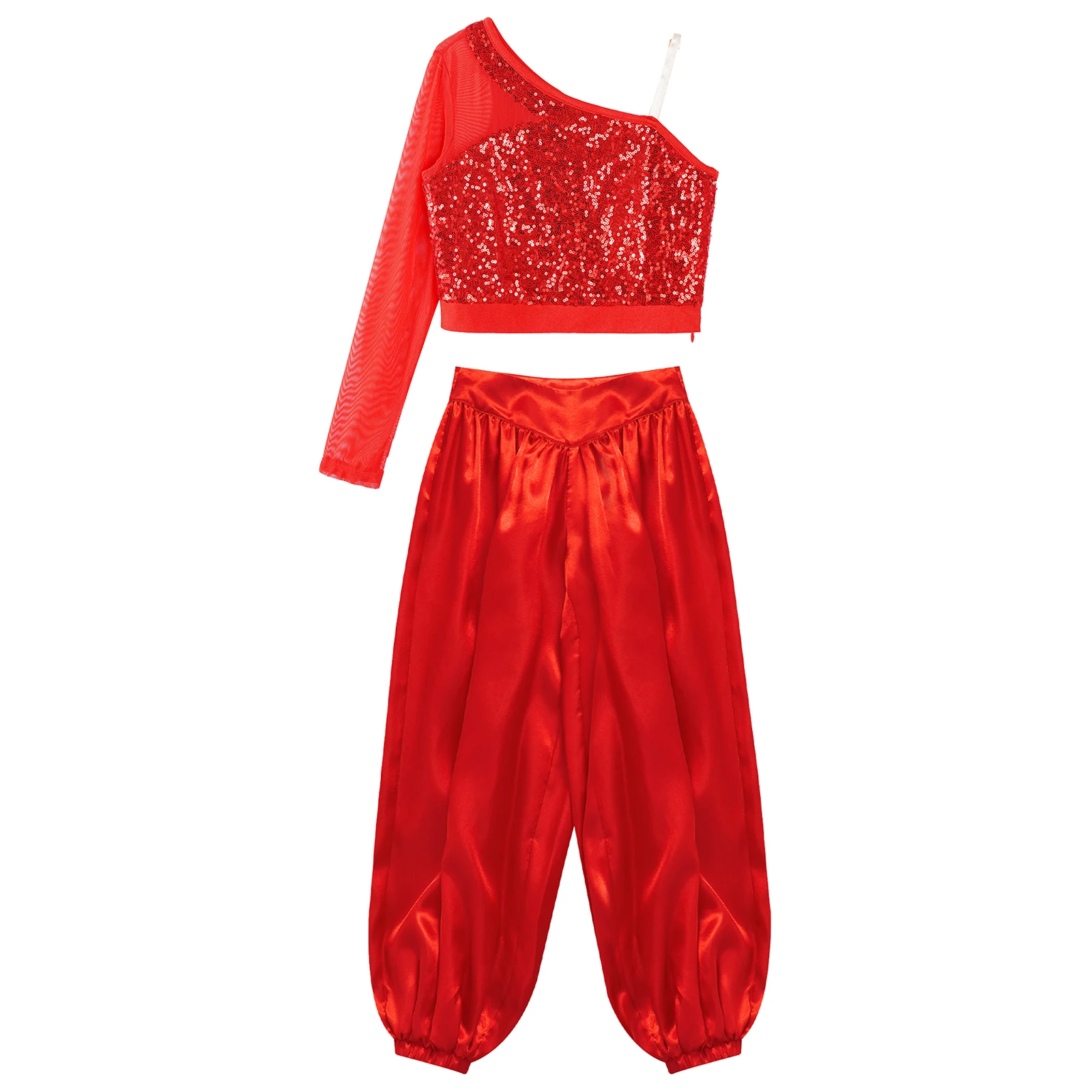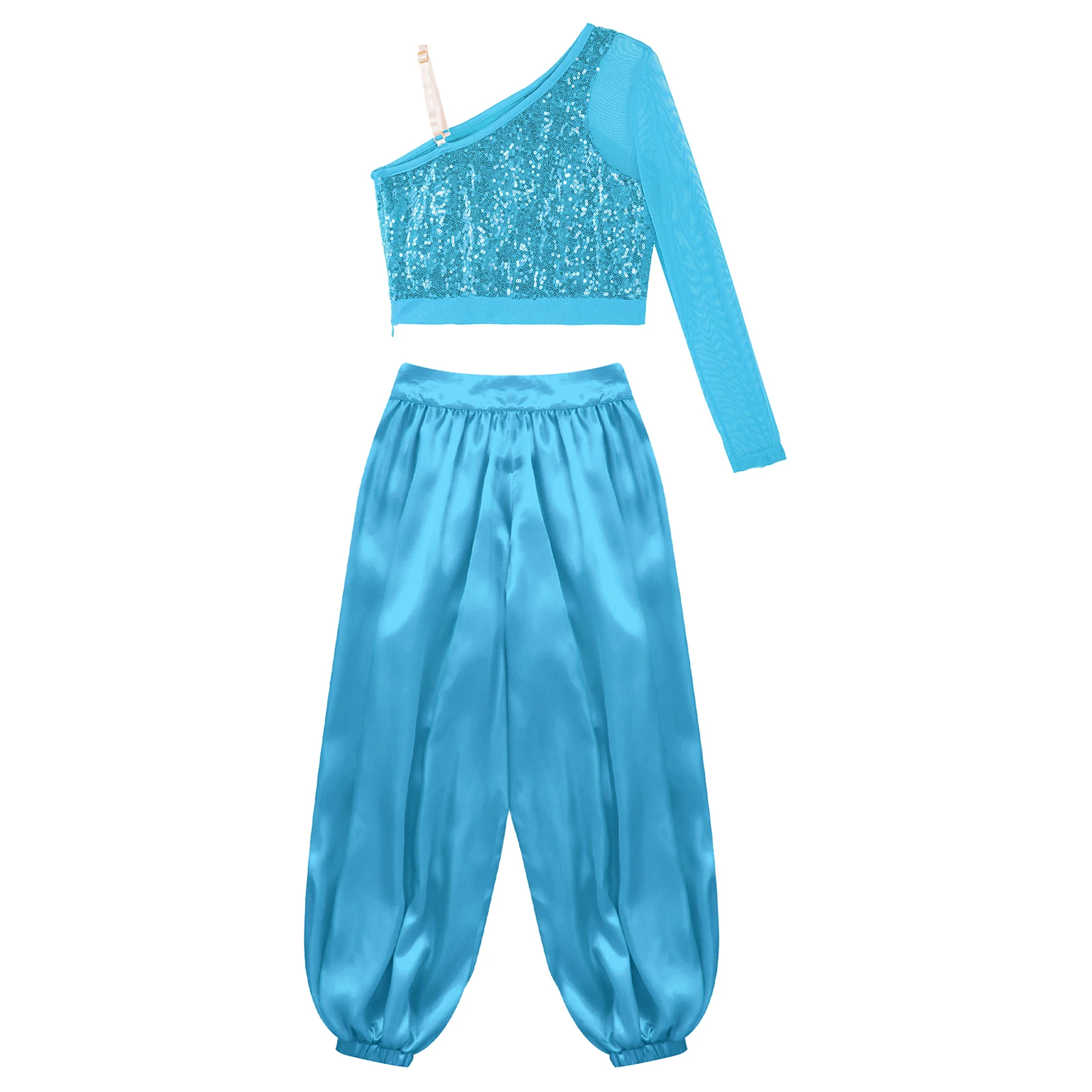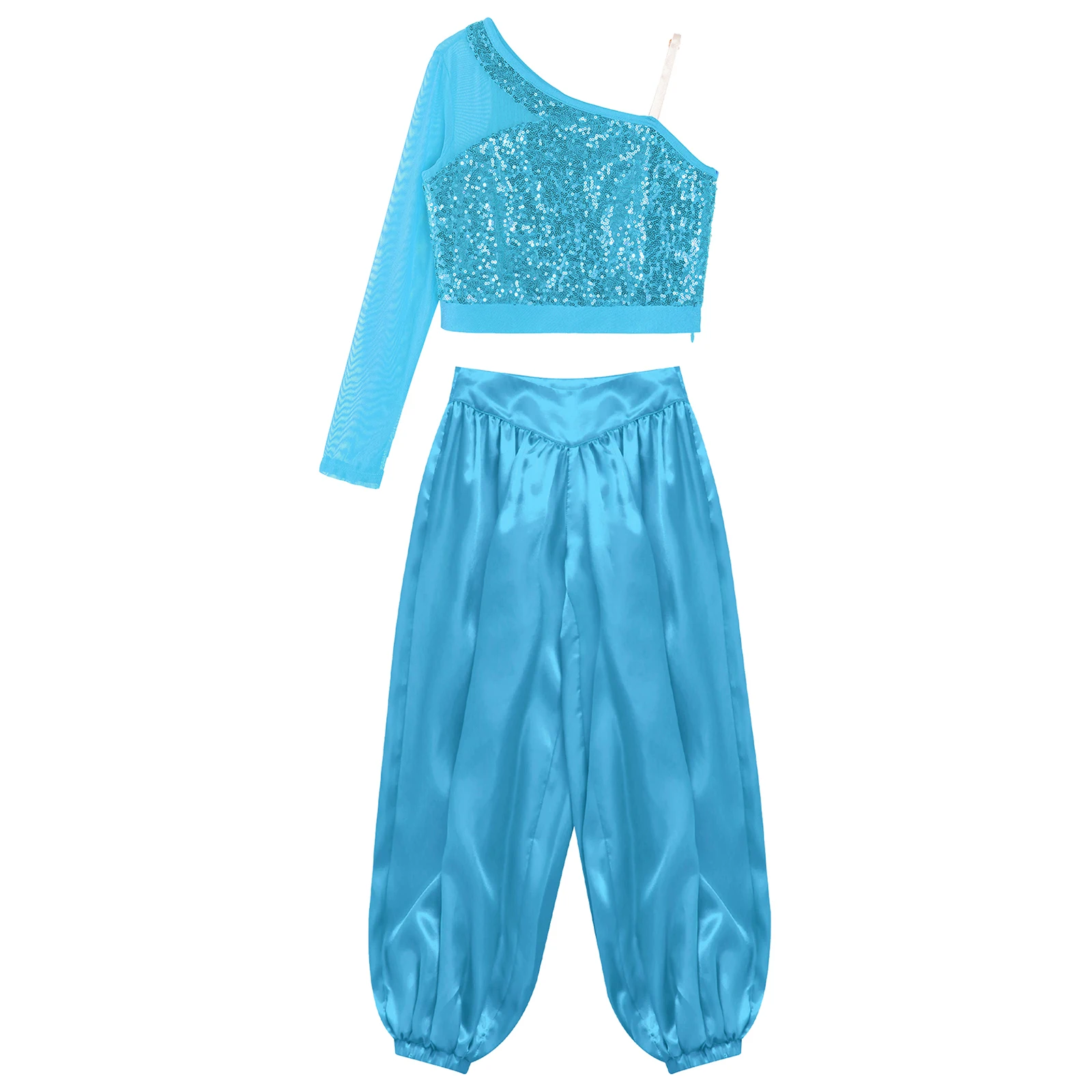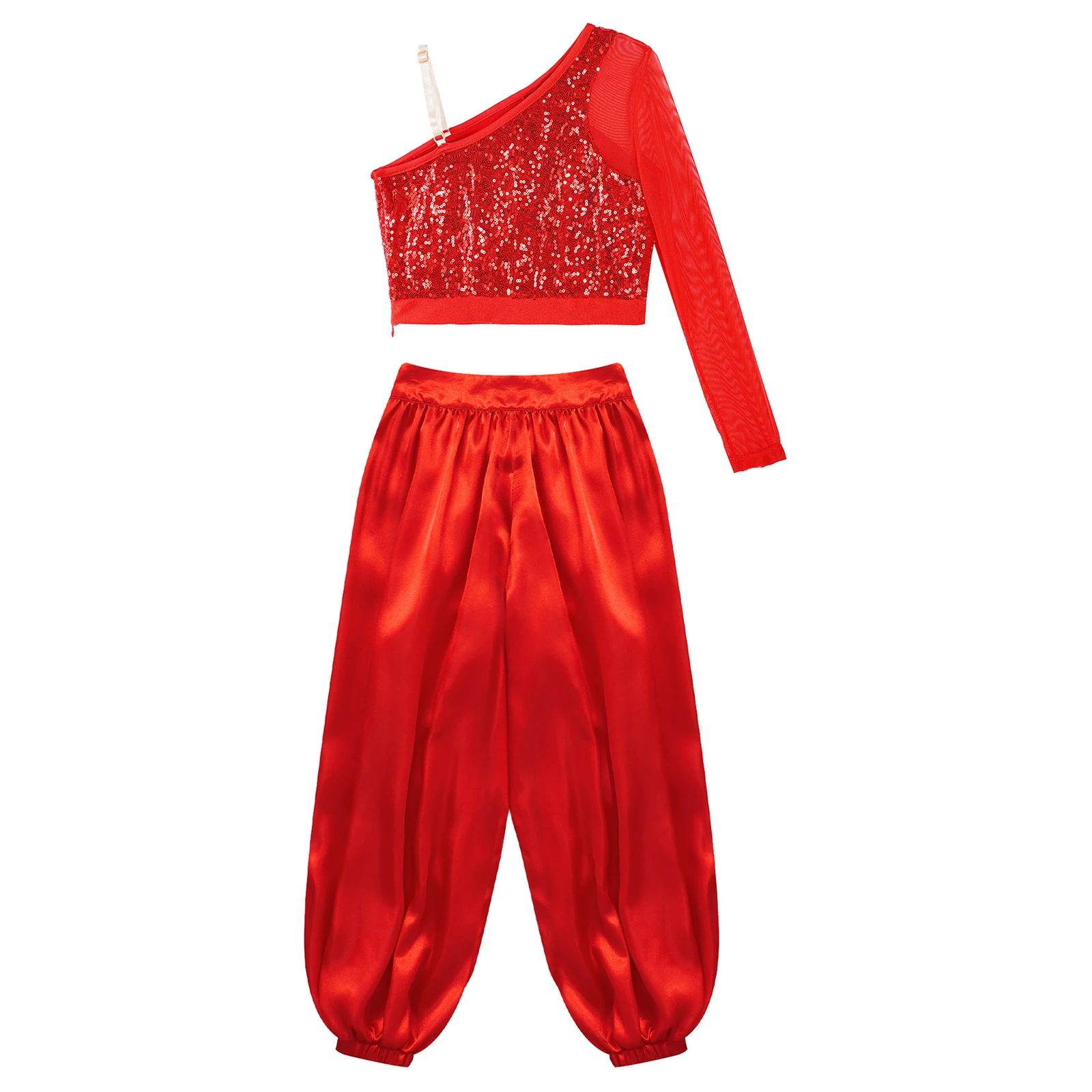 Comprar Traje de danza del vientre para niñas, Top corto de malla transparente de manga larga con un hombro y cremallera lateral, Top corto de lentejuelas brillantes con pierna ancha de satén