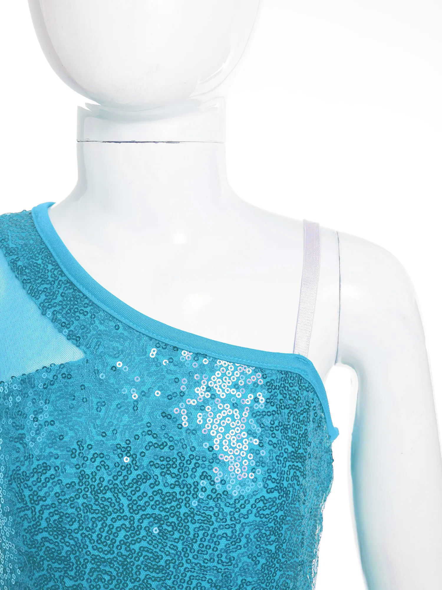 El top de baile para niña está adornado con lentejuelas que brillan bajo la luz para alegrar cualquier actuación.