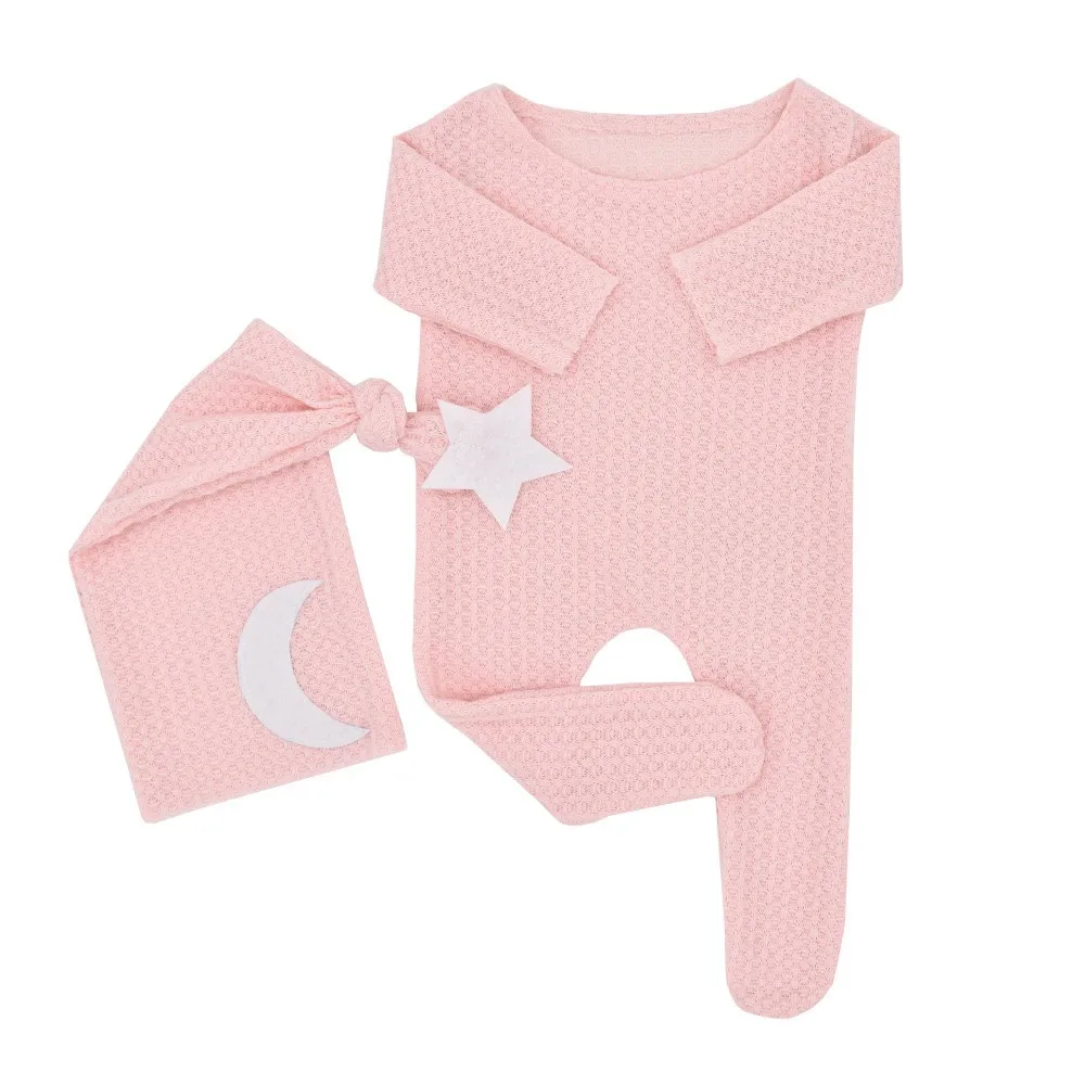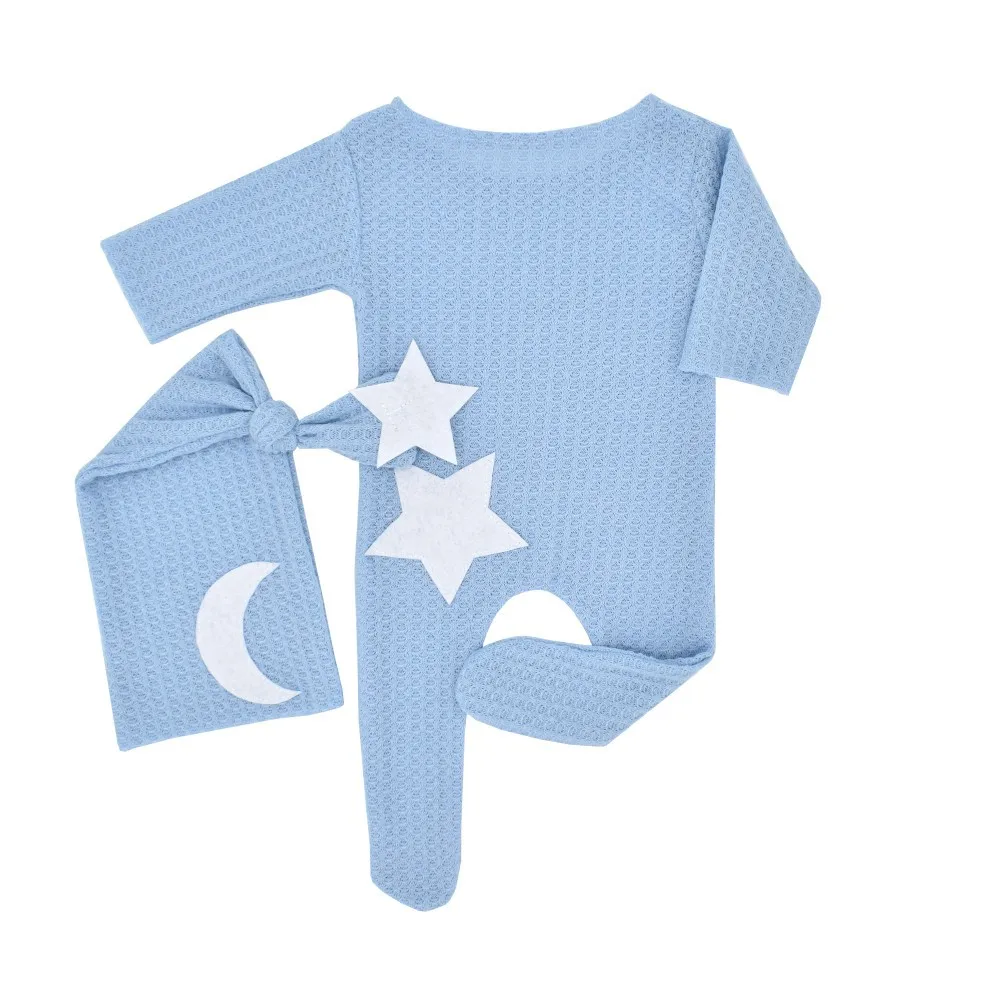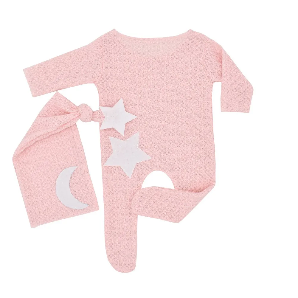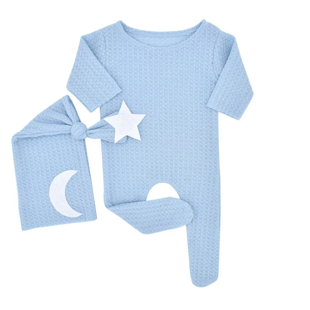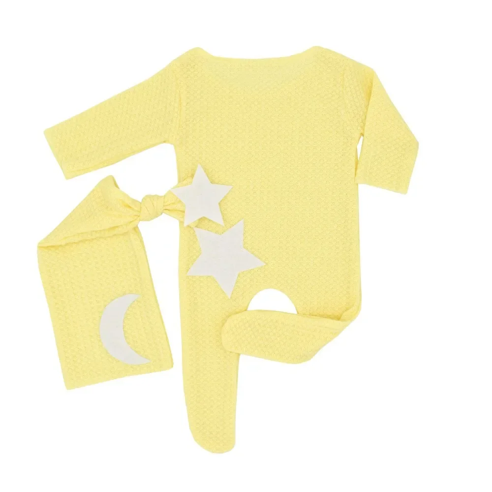 Este mameluco para recién nacido con patas está confeccionado con una suave tela tipo gofre. El conjunto viene con el sombrero coordinado de estrella y luna.Esta tela es adorable.