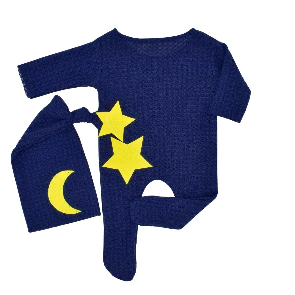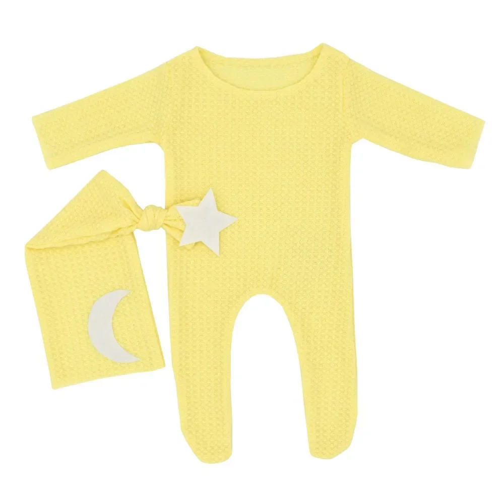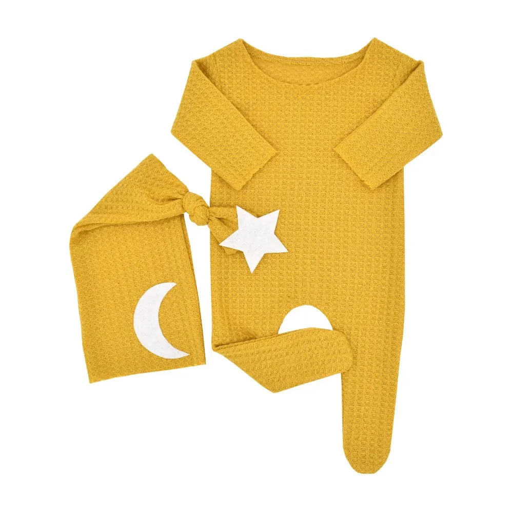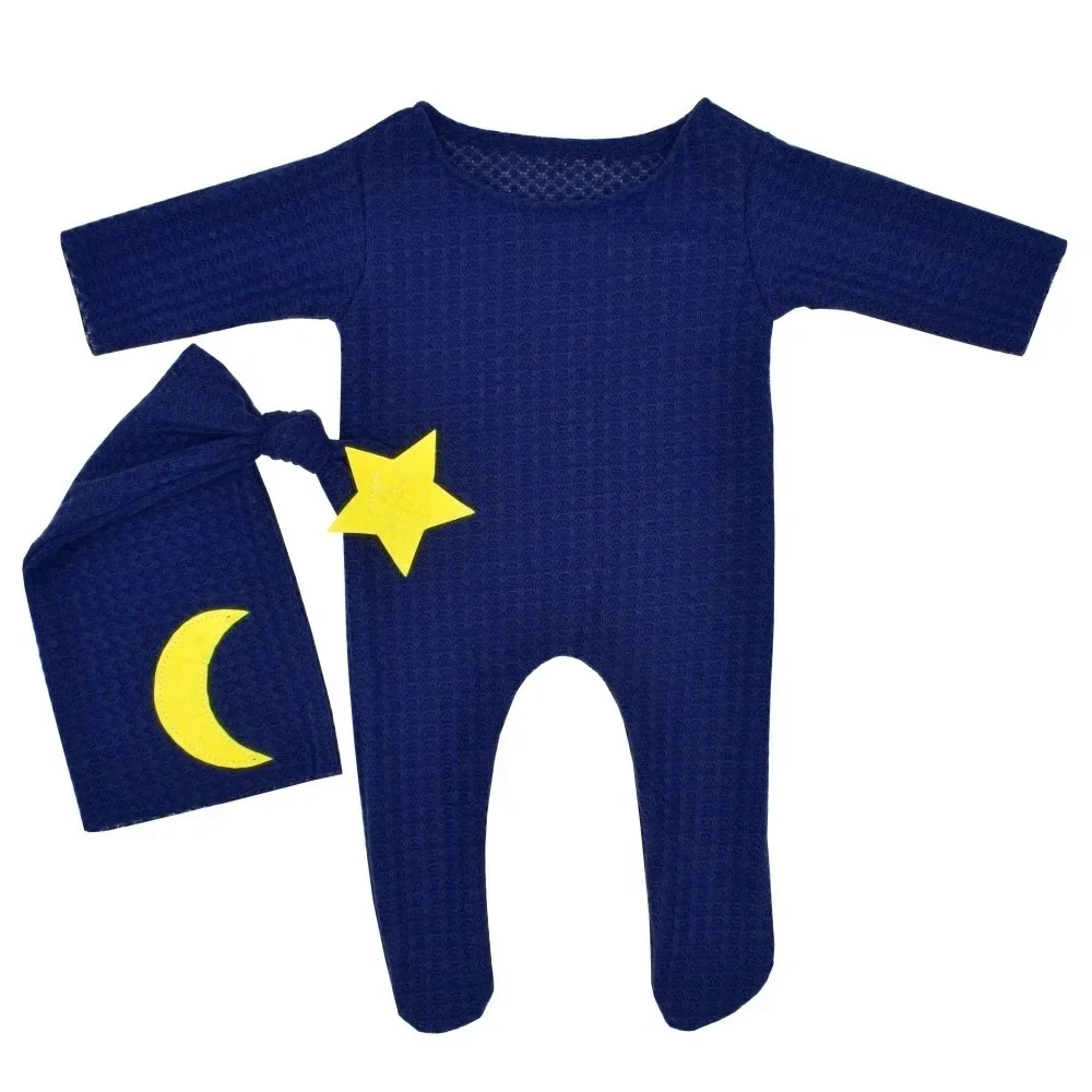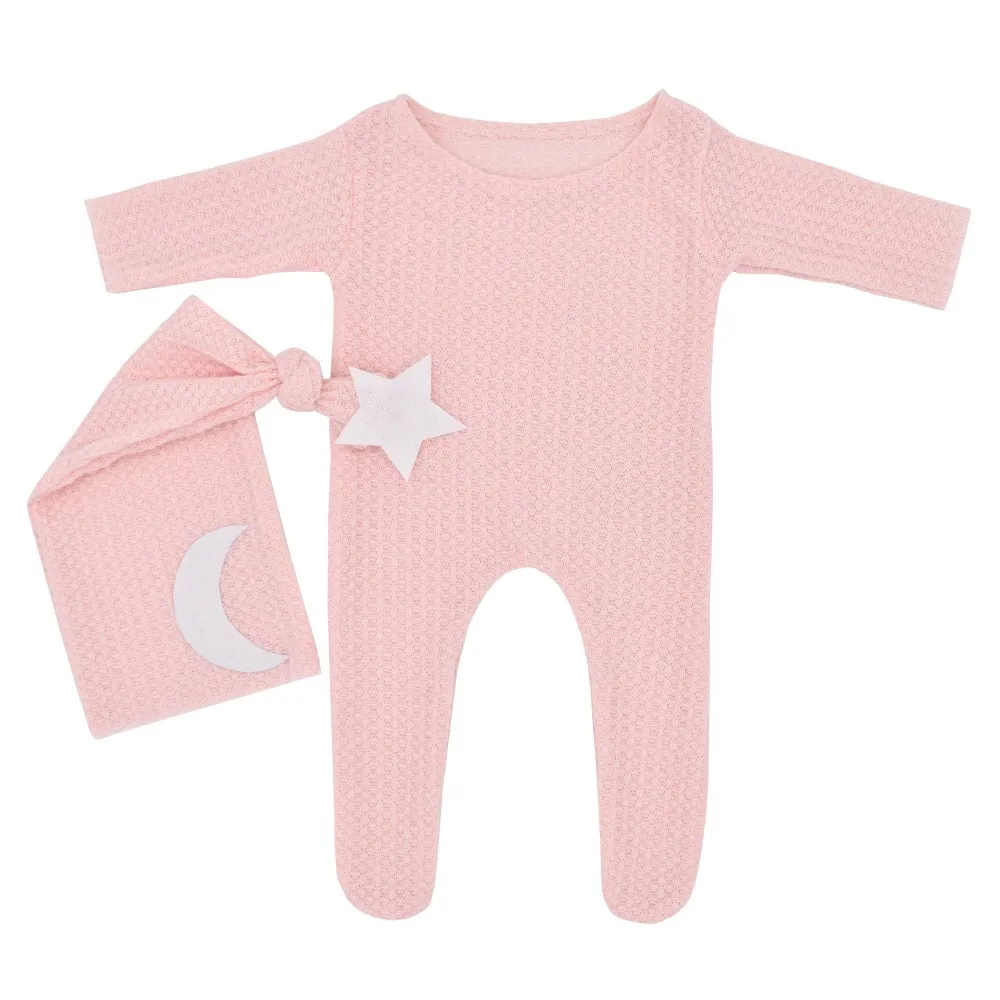 Este mameluco para recién nacido con patas está confeccionado con una suave tela tipo gofre. El conjunto viene con el sombrero coordinado de estrella y luna.Esta tela es adorable.