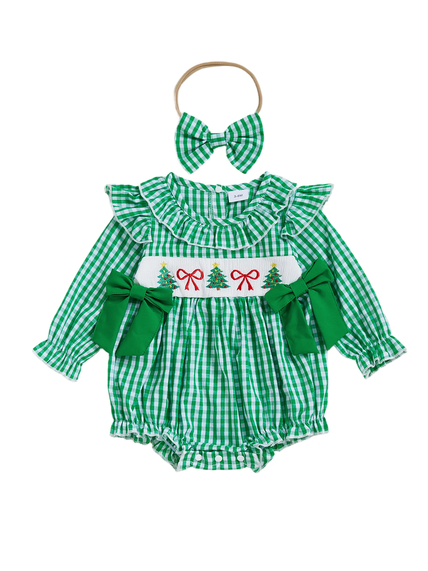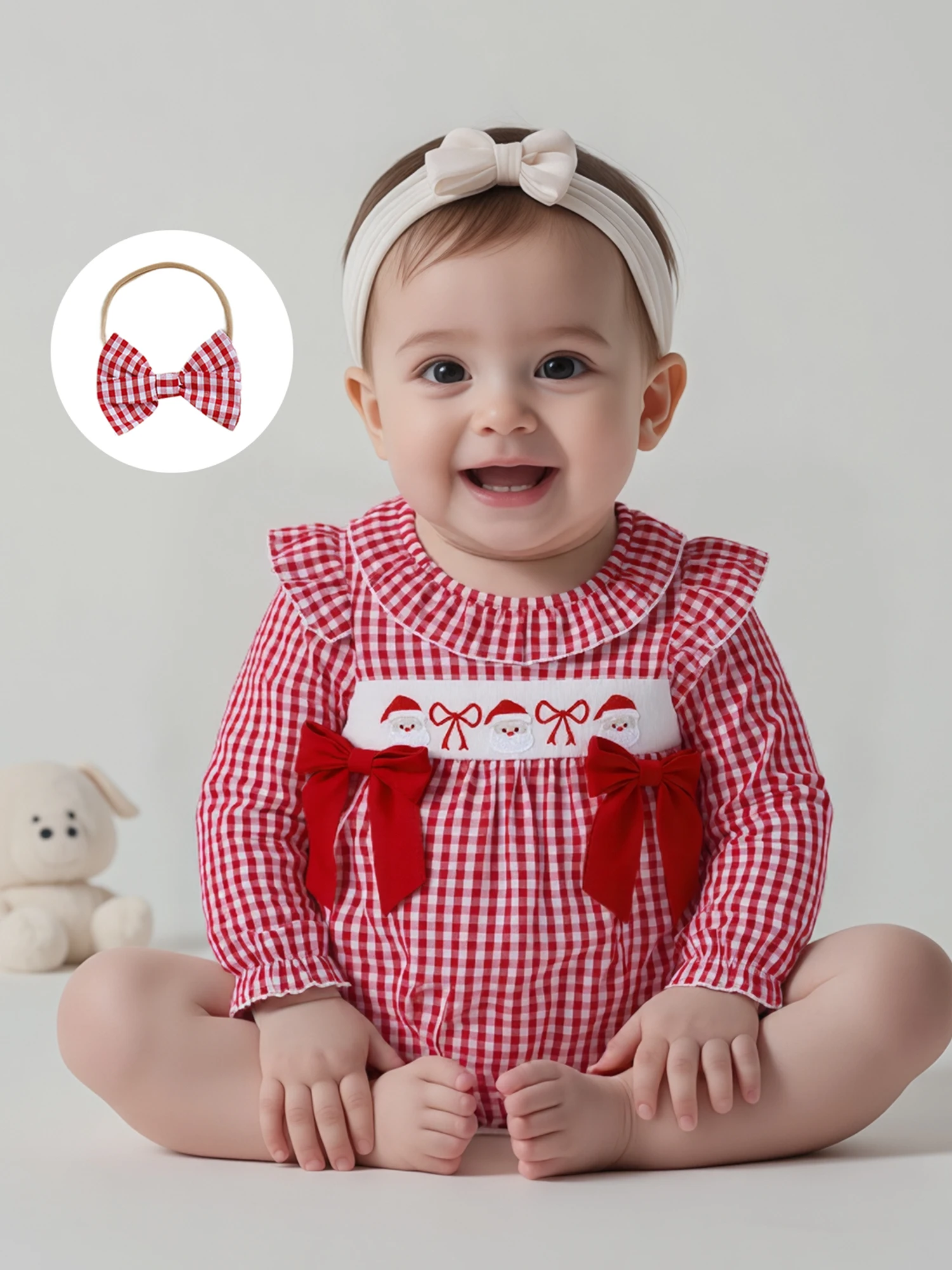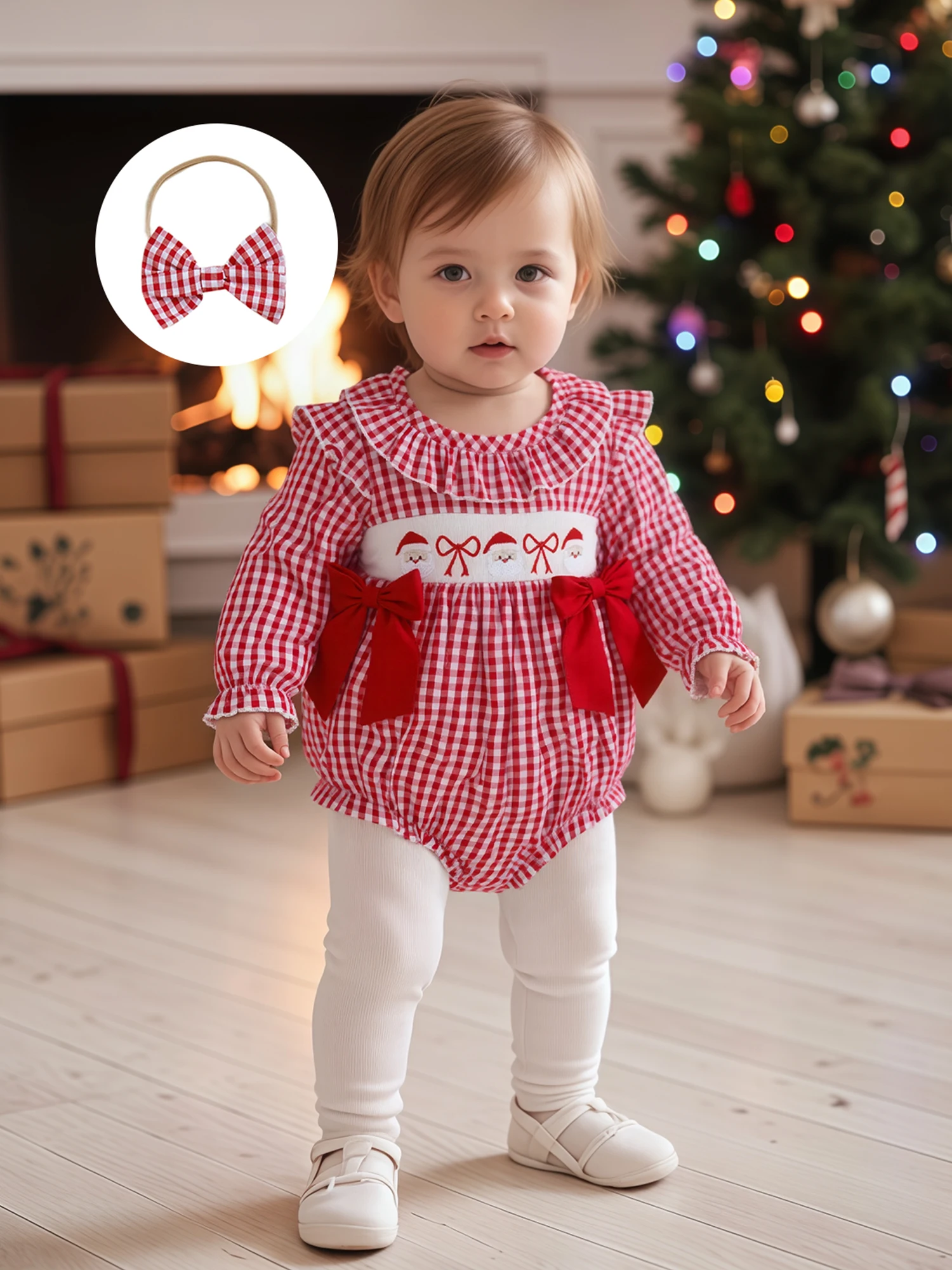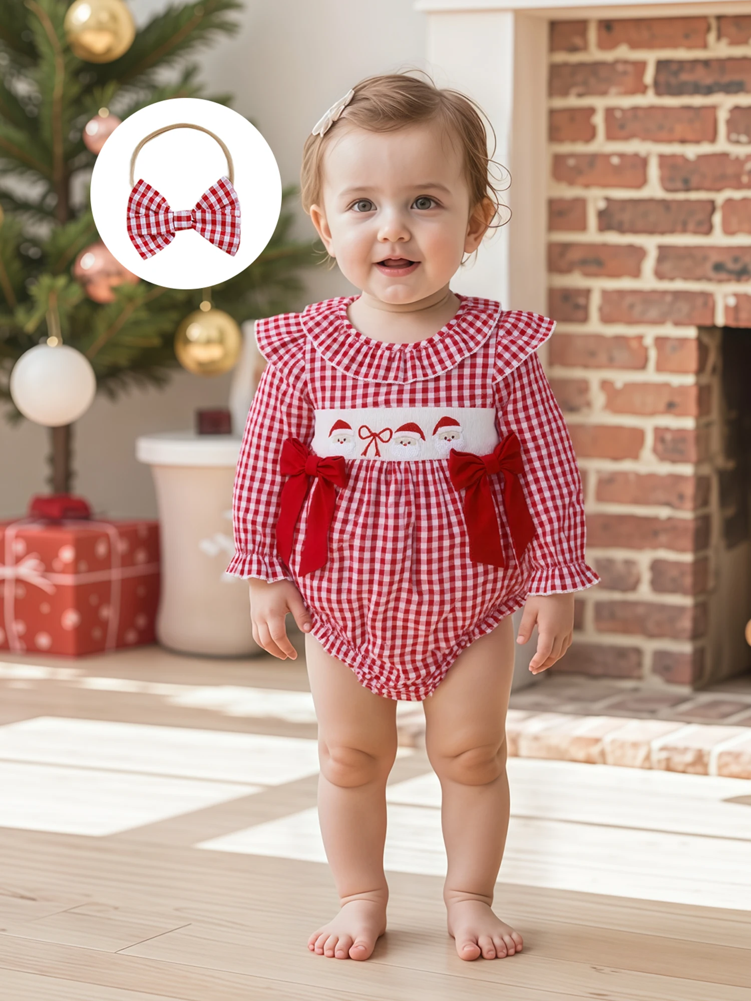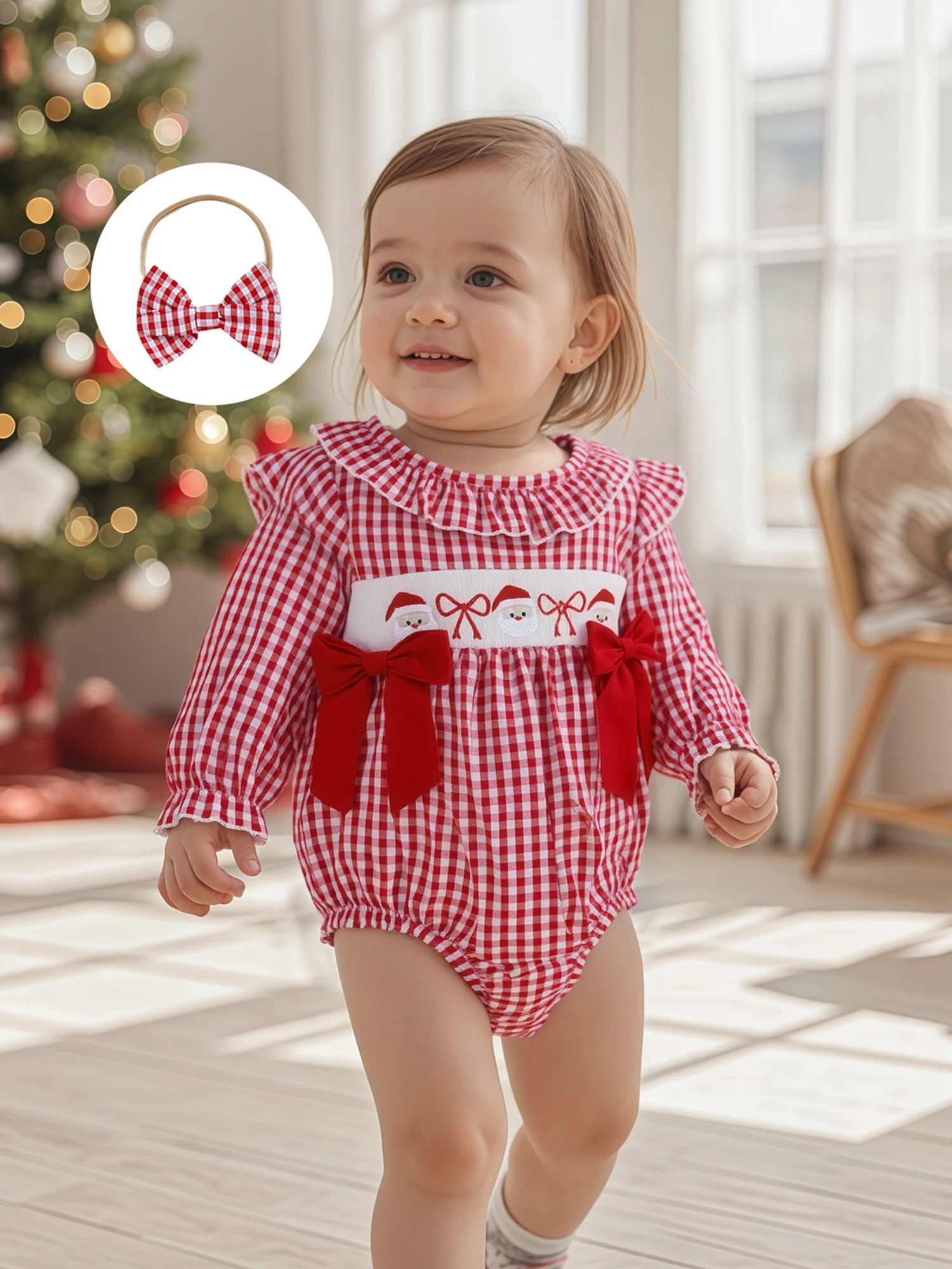 Traje de Navidad para niña de 0 a 18 meses, estampado a cuadros, bordado de Papá Noel, volantes, cuello redondo, manga larga, mameluco, diadema con lazo, 2 uds.