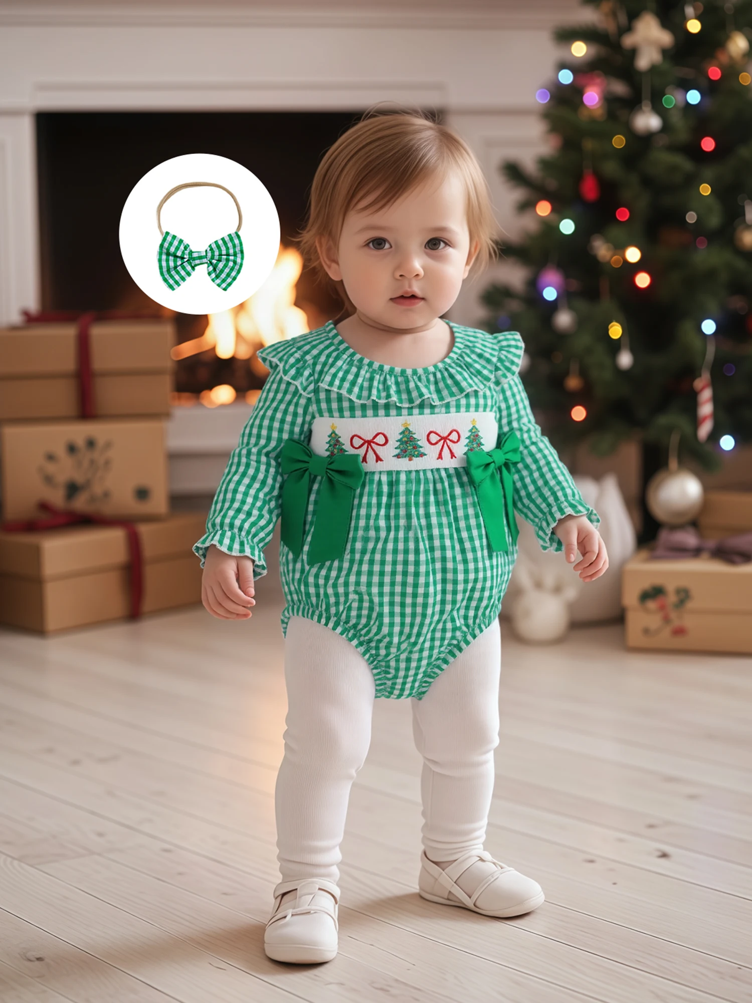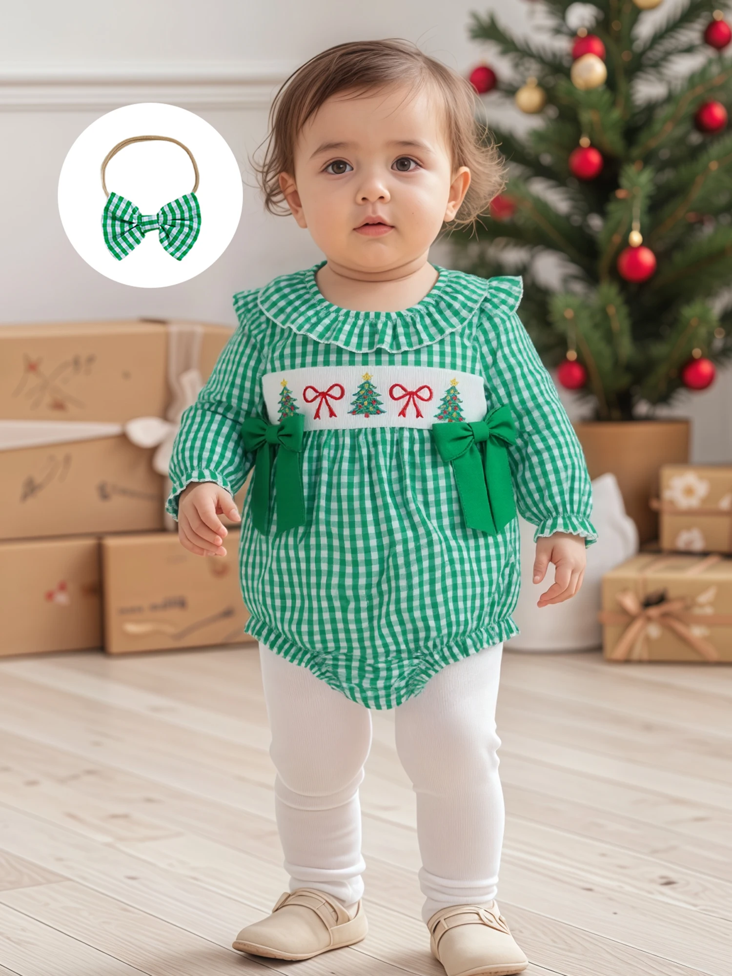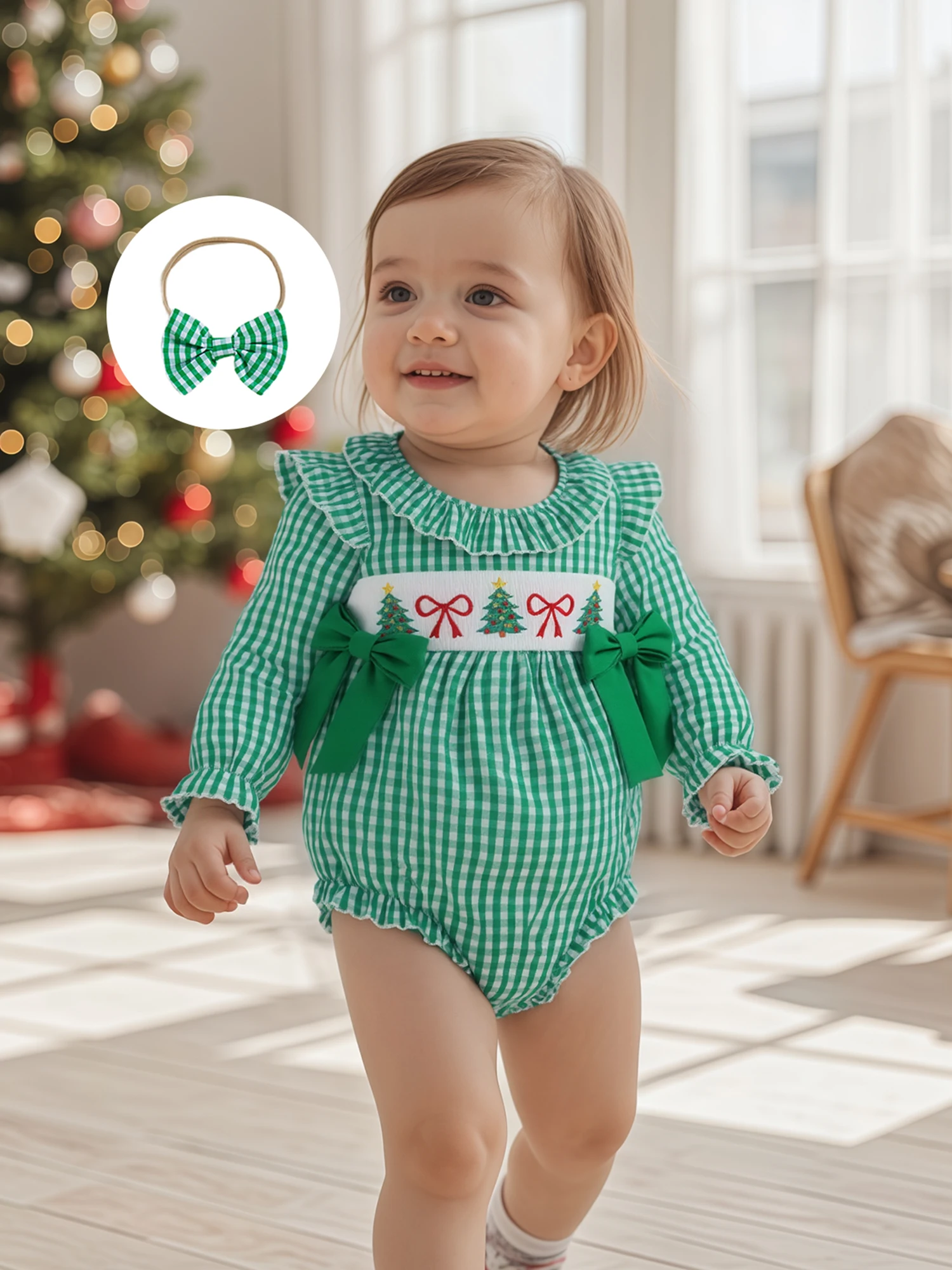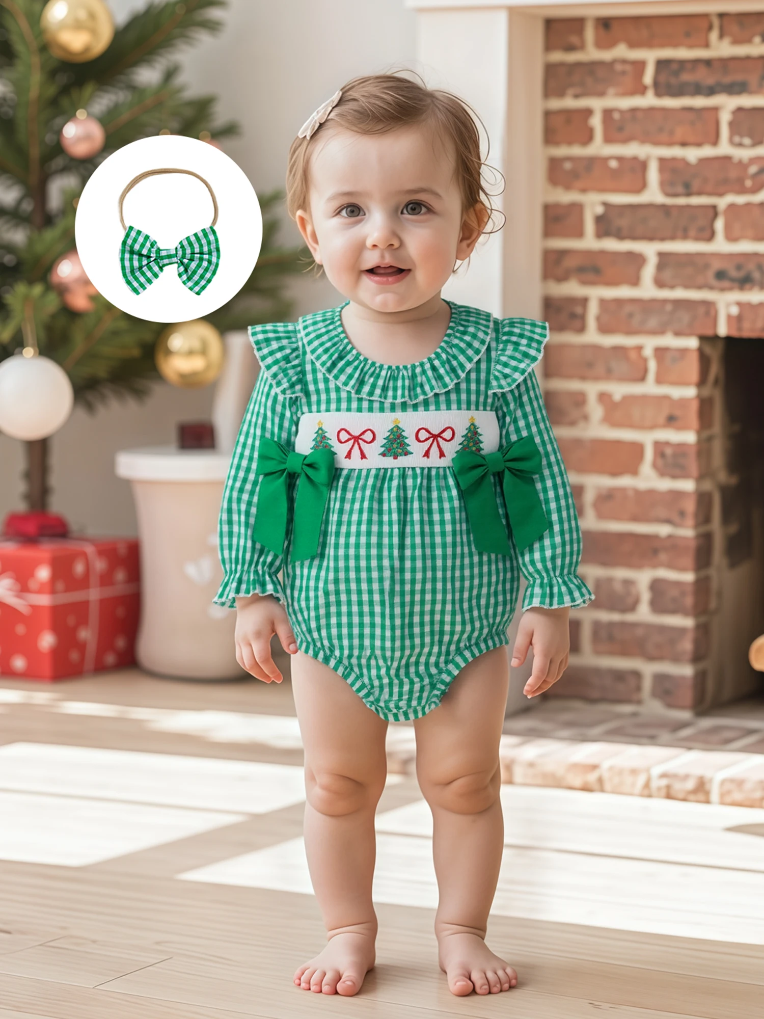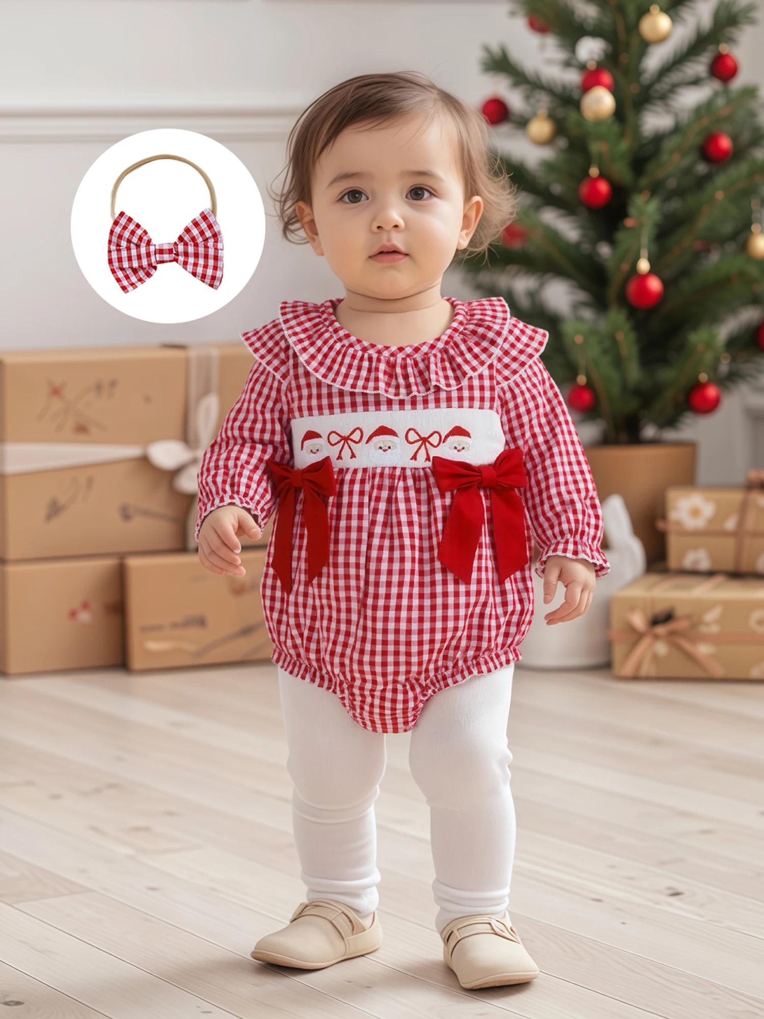 Traje de Navidad para niña de 0 a 18 meses, estampado a cuadros, bordado de Papá Noel, volantes, cuello redondo, manga larga, mameluco, diadema con lazo, 2 uds.