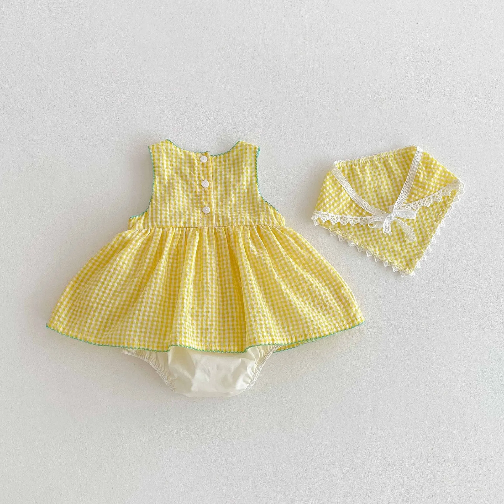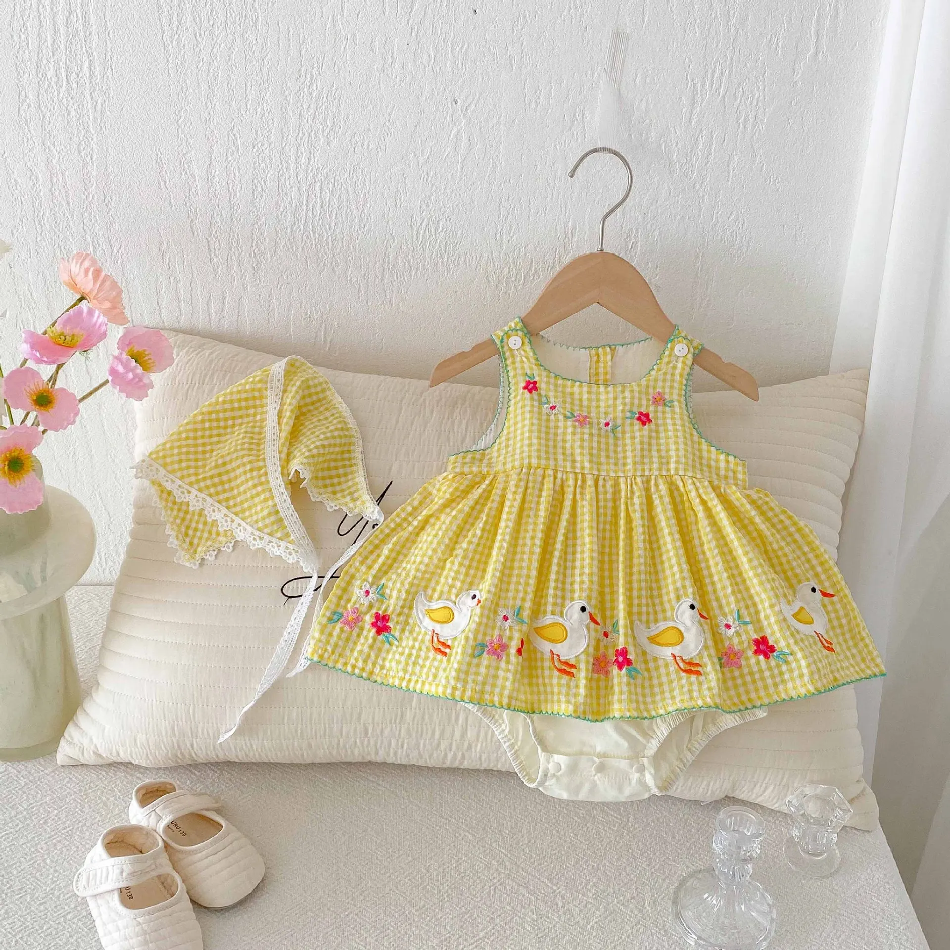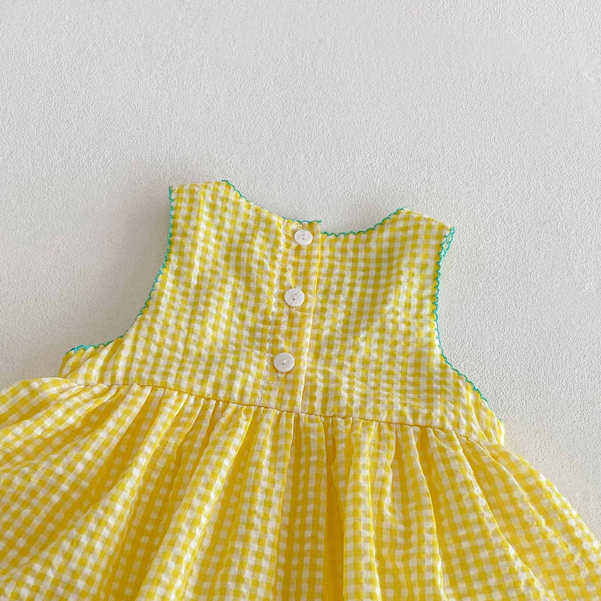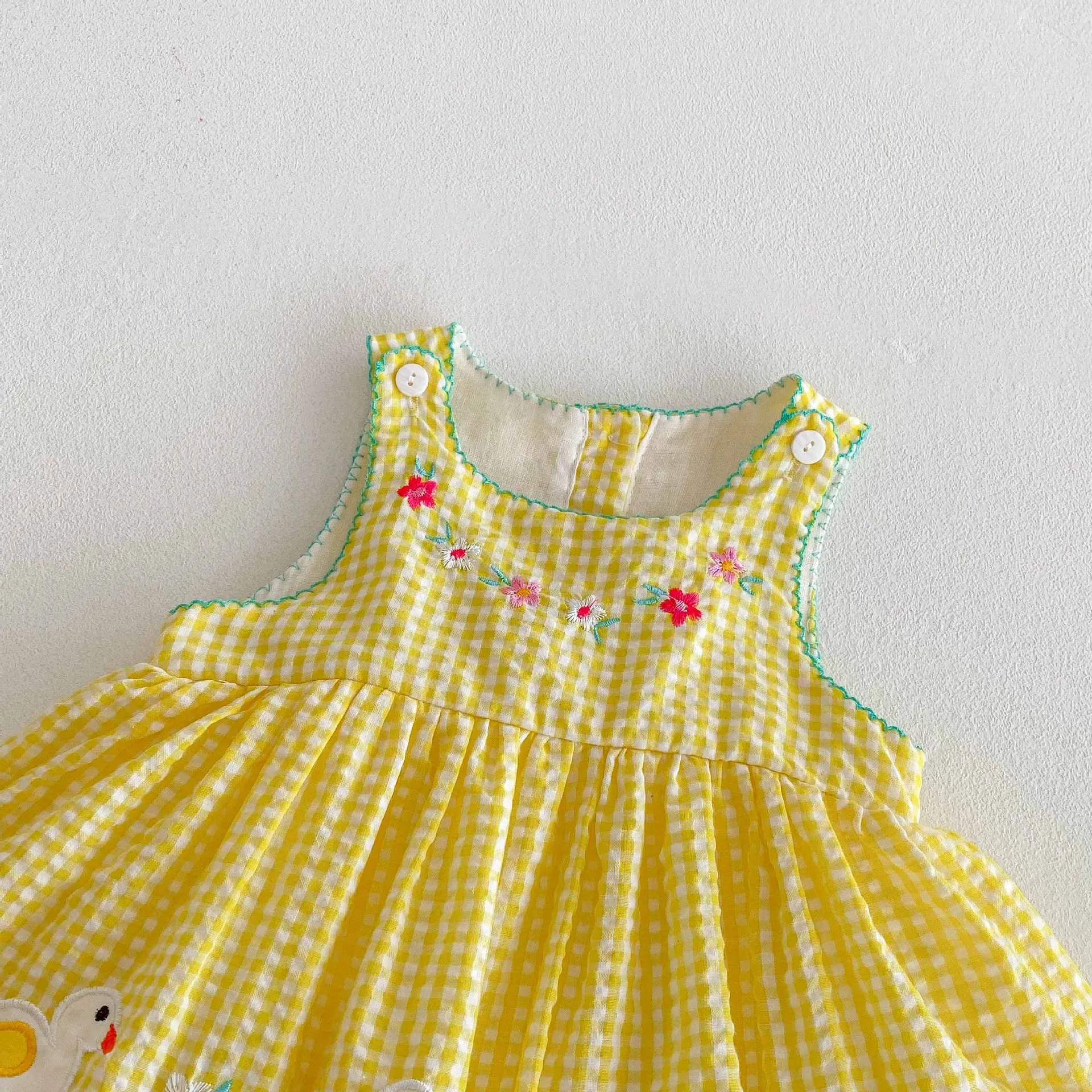 Este vestido mameluco sin mangas presenta un precioso patrón de cuadros amarillos con lindos bordados de patos, perfecto para el verano.Los colores brillantes y los dulces motivos de patos añaden un toque divertido.