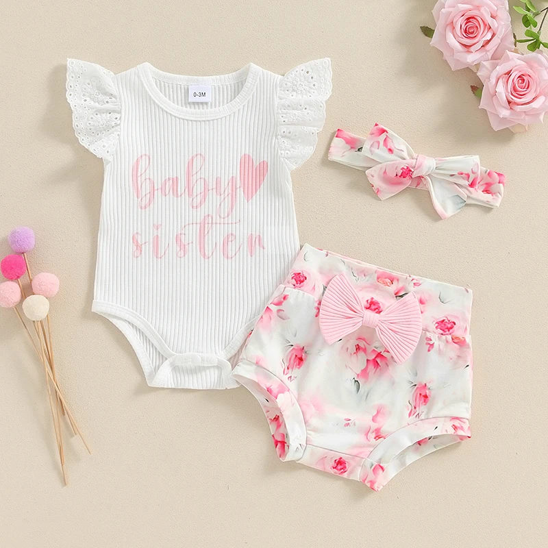 Comprar Trajes informales de verano para niña, Pelele de manga corta con estampado de letras y corazones, pantalones cortos con estampado Floral, diadema, conjunto de ropa de 3 piezas
