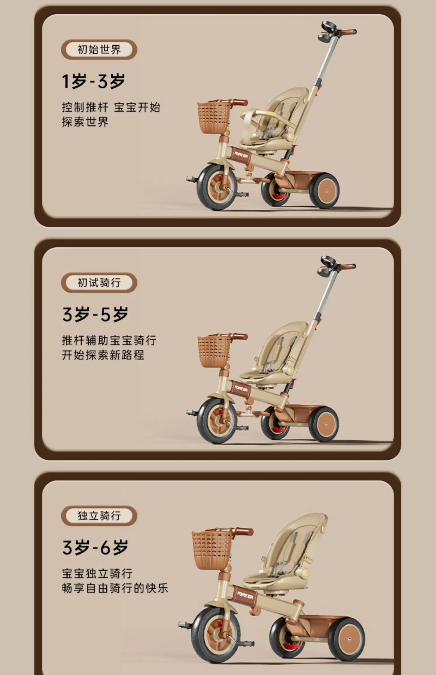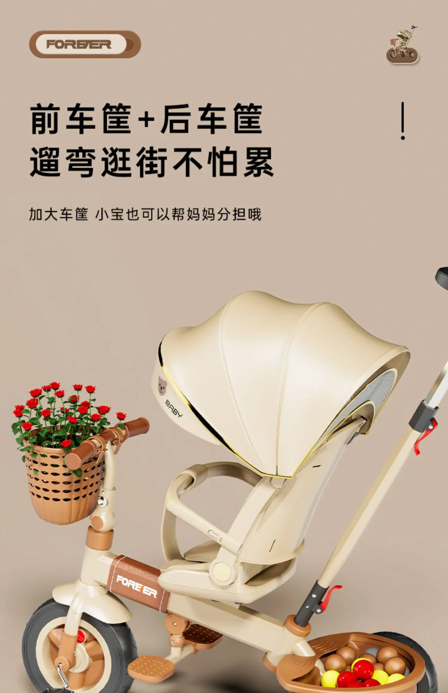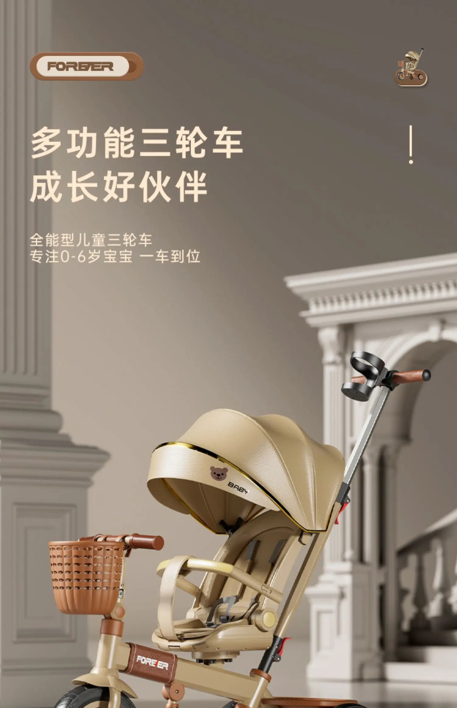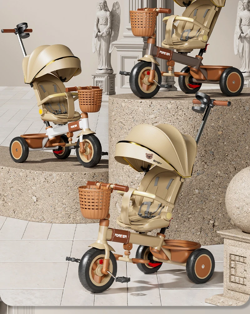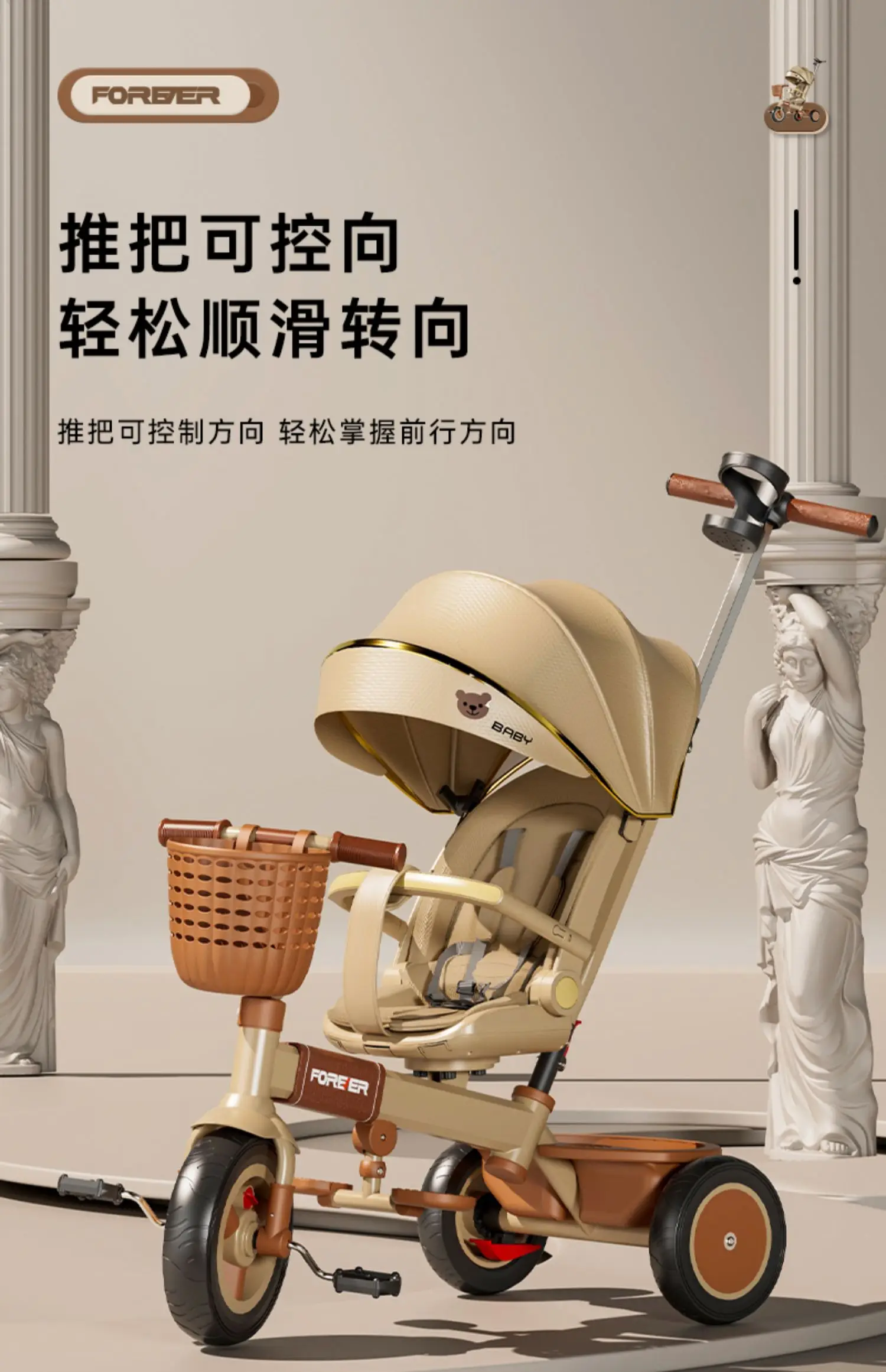Triciclo convertible 3 en 1 para bebé, asiento reclinable con dosel y cesta de almacenamiento, estructura de acero para niños de 0 a 6 años