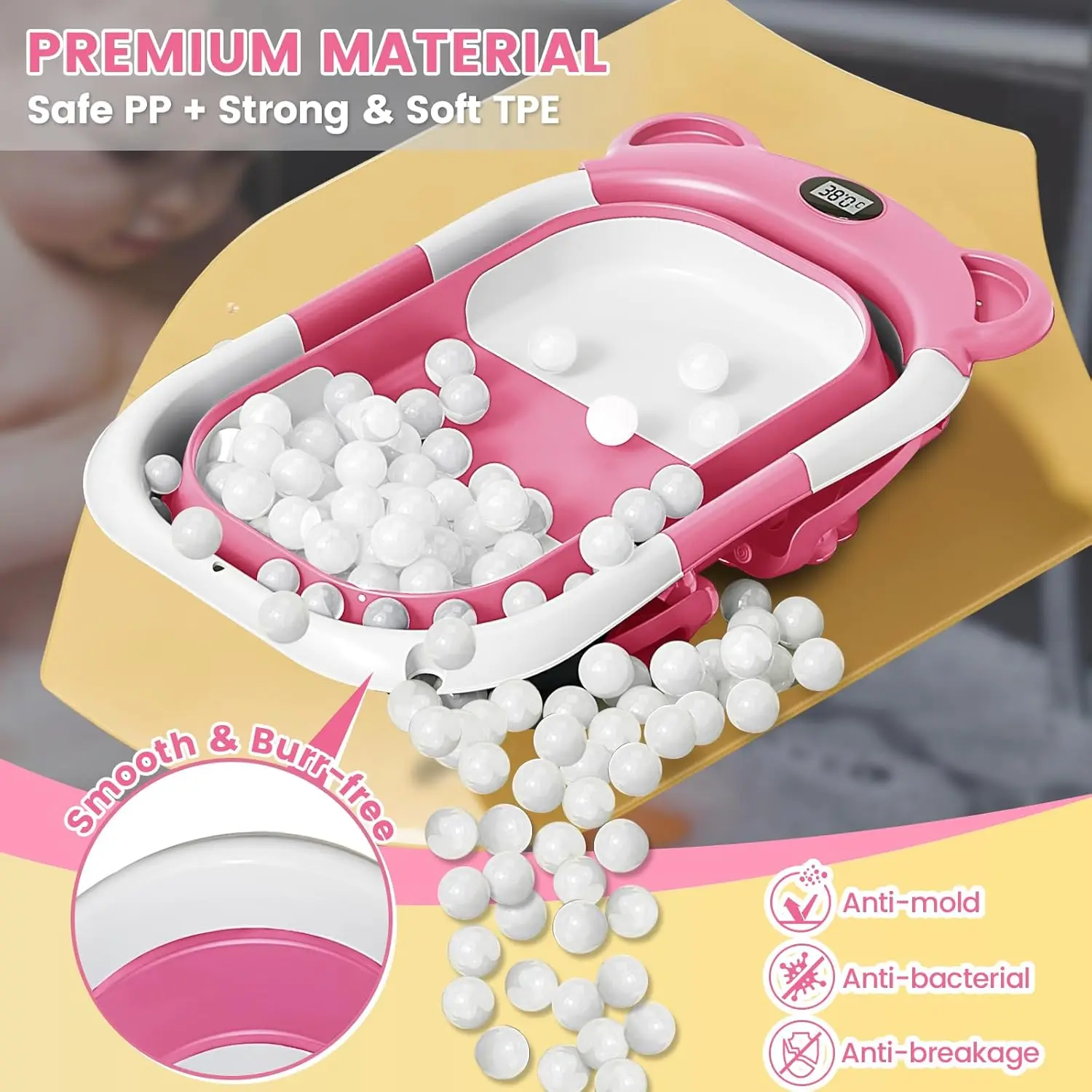 Diseño de material de seguridad: la bañera plegable para bebés de UBRAVOO está diseñada para sentir una baby shower y ha hecho todo para que el baño de su bebé sea más cómodo.Fabricado en PP y TPE de alta calidad.Estos materiales son respetuosos con el medio ambiente, no tóxicos e inodoros, sin BPA e inofensivos para su bebé.