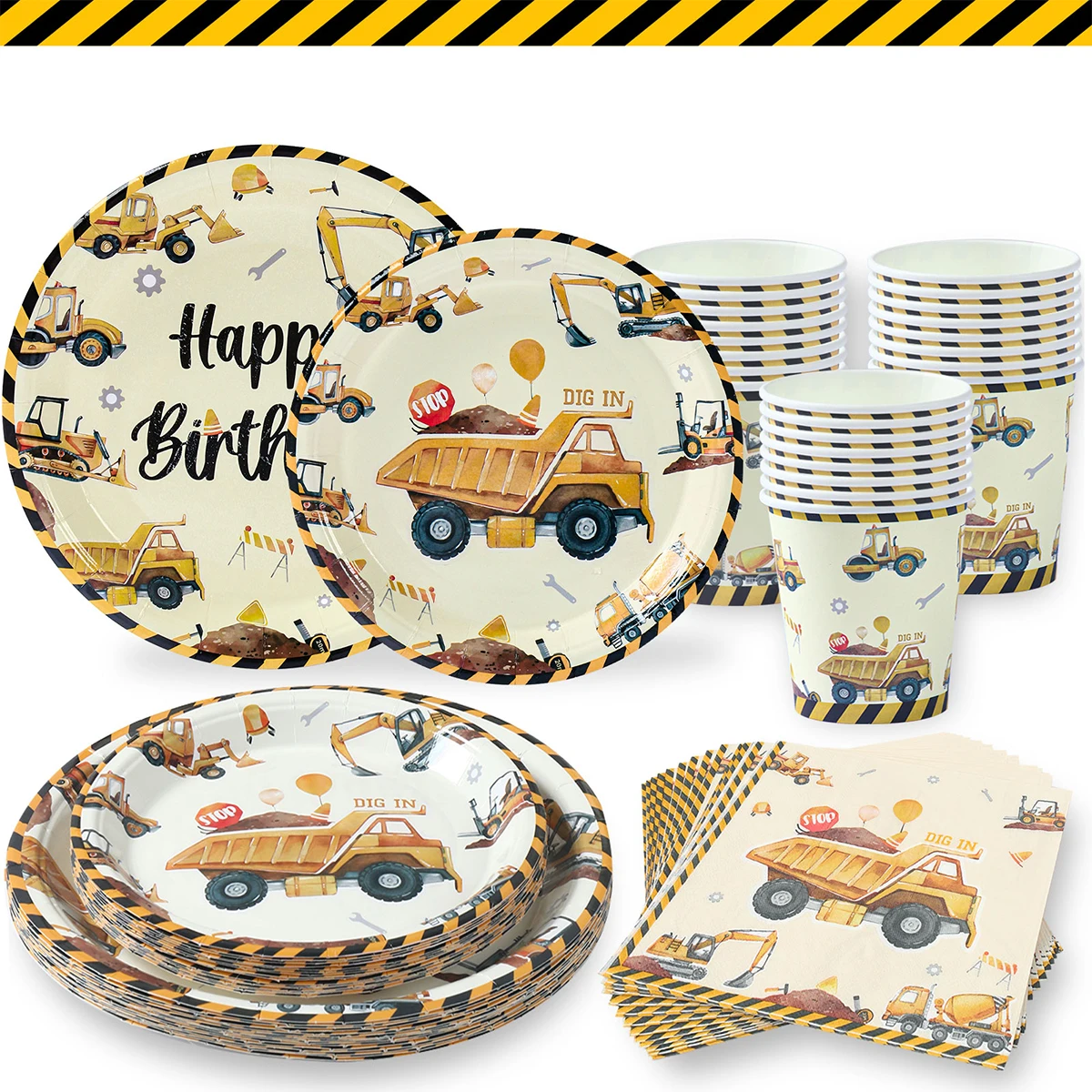 Vajilla desechable para fiesta de construcción, decoración de feliz cumpleaños, vehículo excavadora de camión para niños, suministros de primer cumpleaños