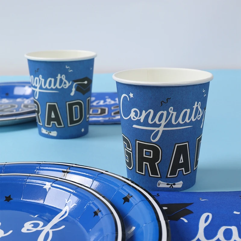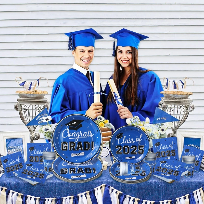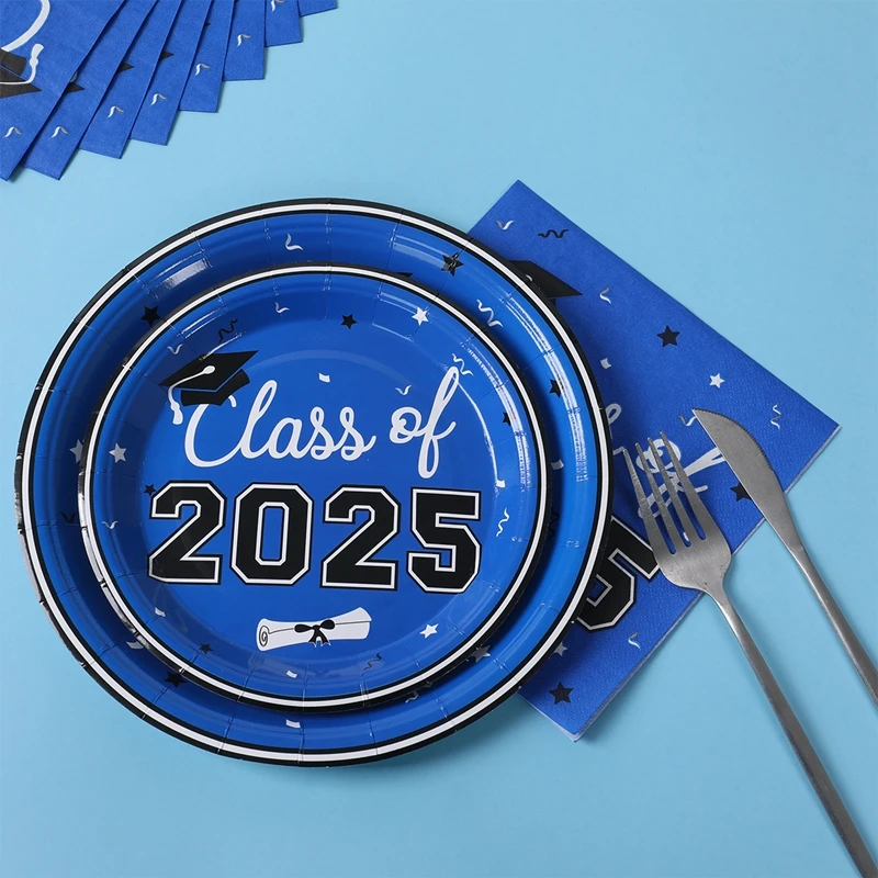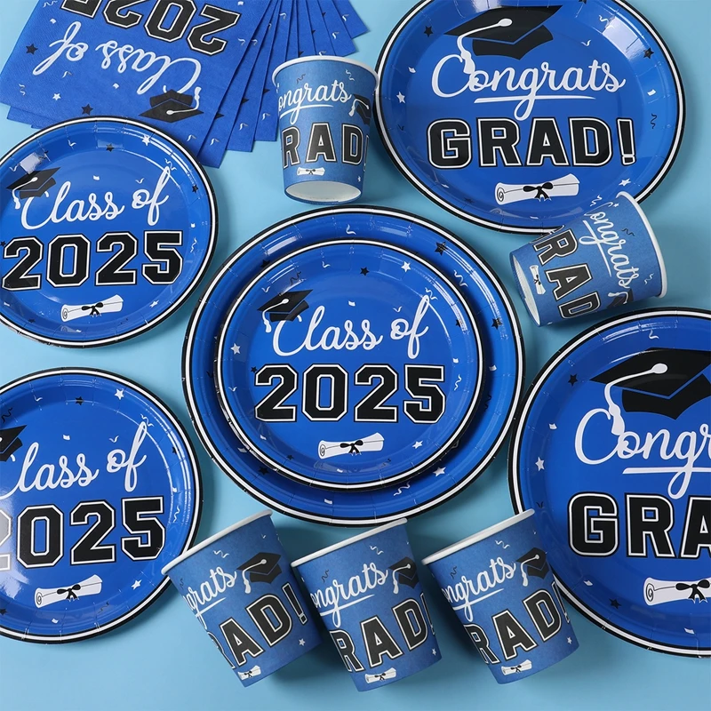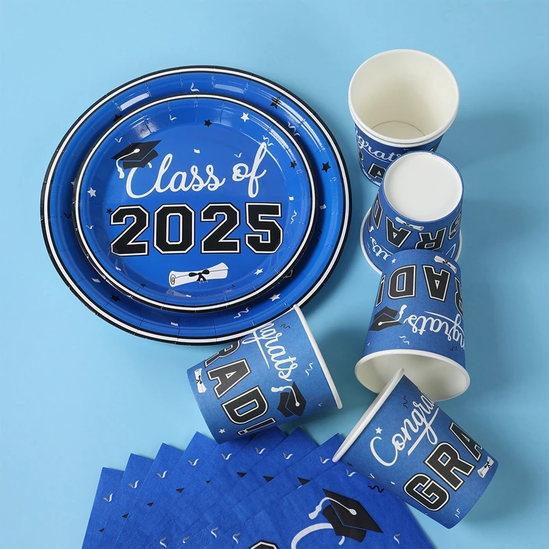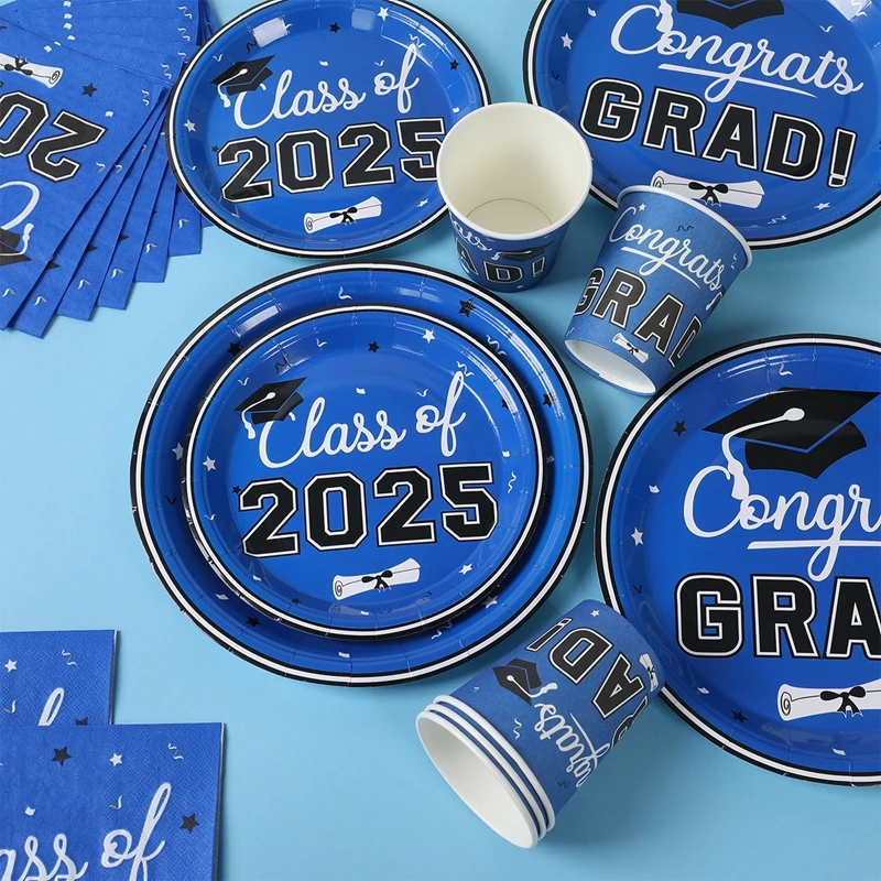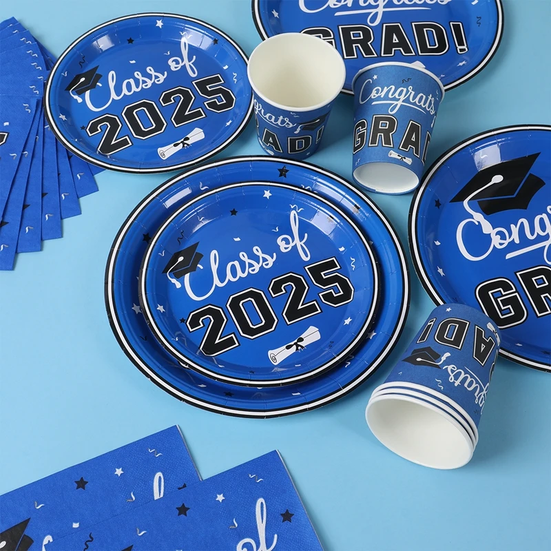 Vajilla desechable para graduación, azul y negro, decoración para fiesta temática de graduación, suministros de graduación, platos, servilletas, 2025 Copas