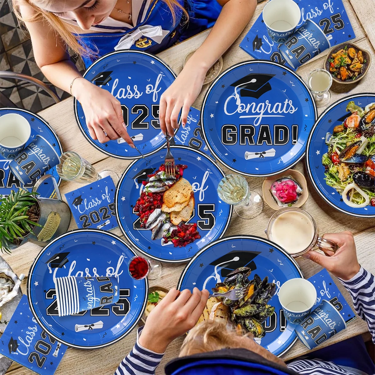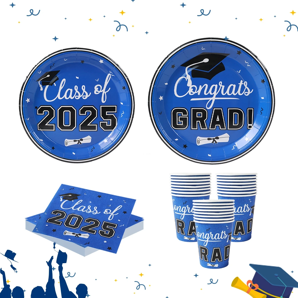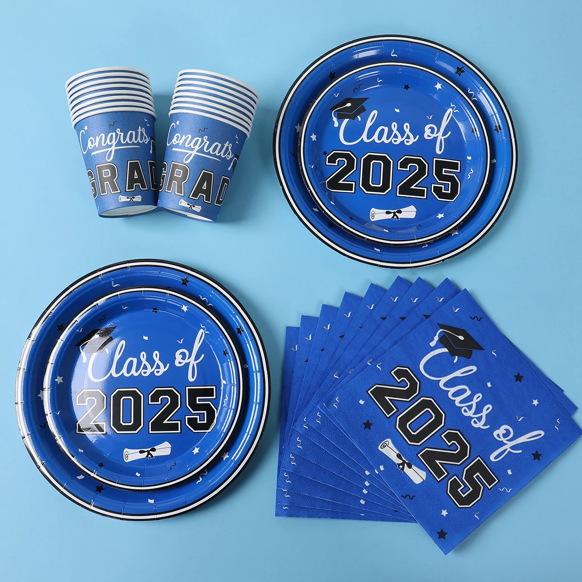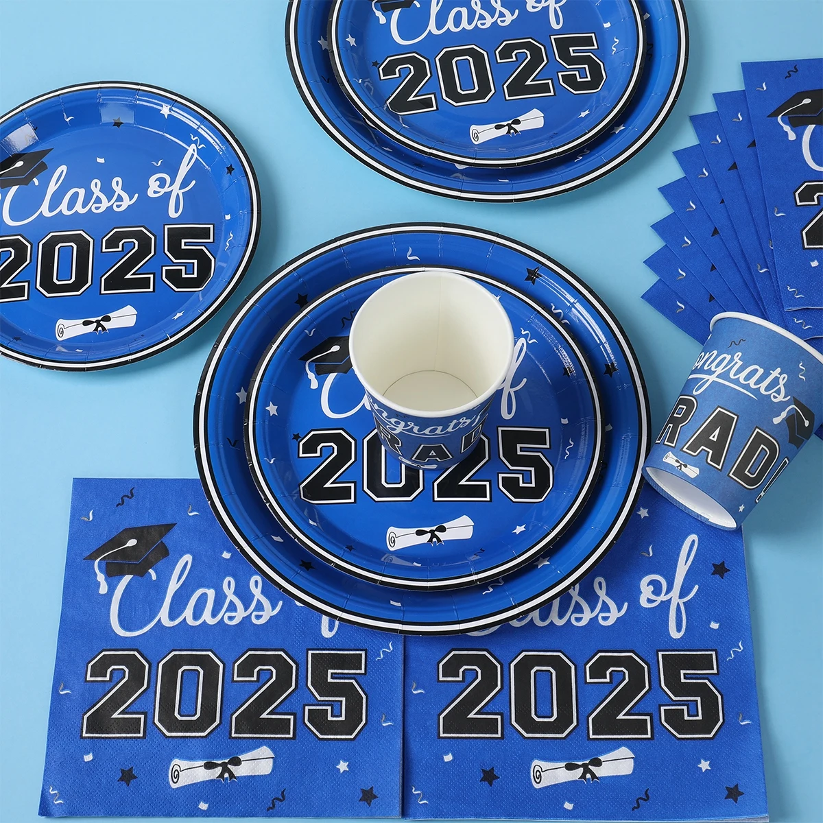 Vajilla desechable para graduación, azul y negro, decoración para fiesta temática de graduación, suministros de graduación, platos, servilletas, 2025 Copas
