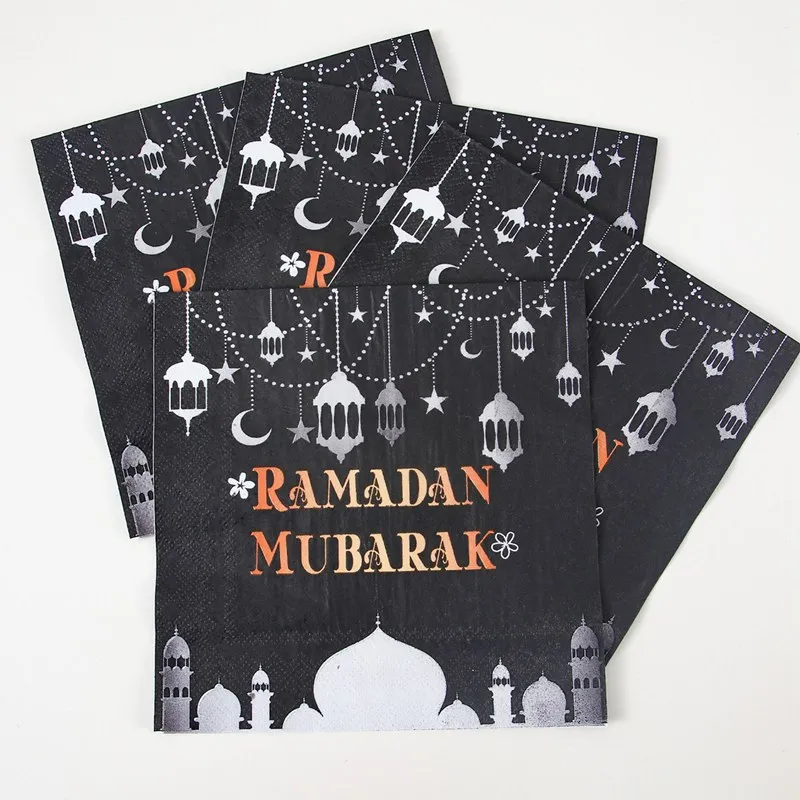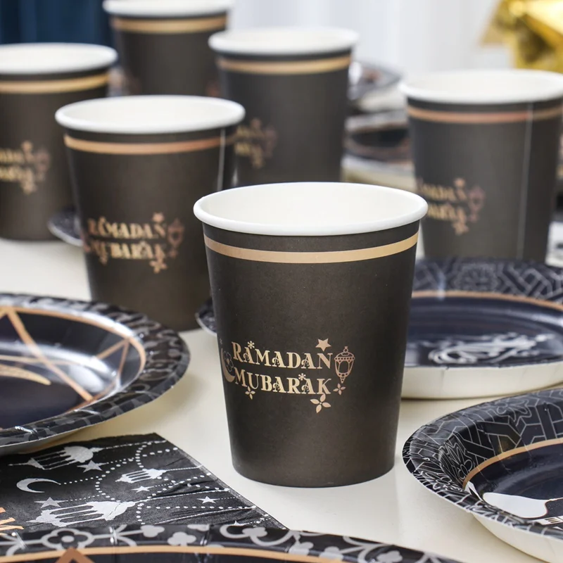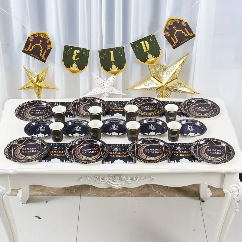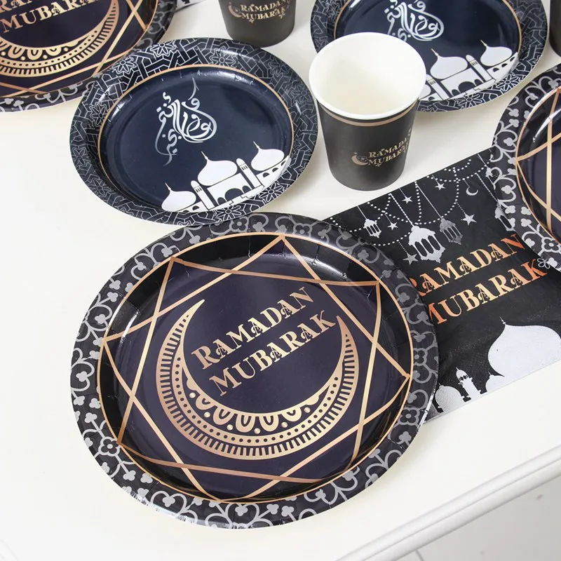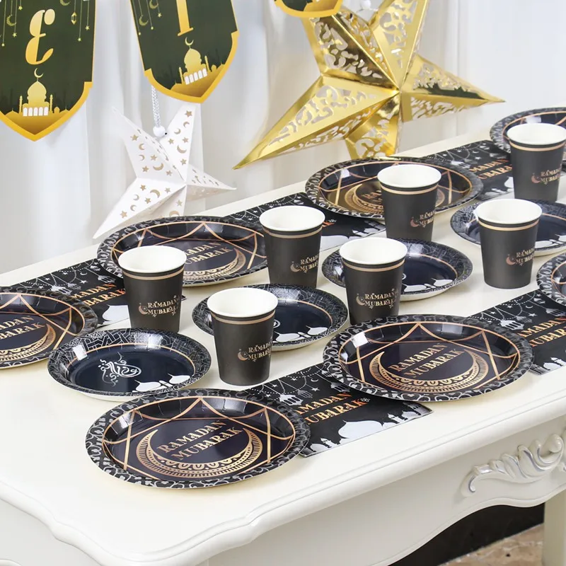Vajilla desechable Ramadan Mubarak, platos, vasos, decoración de Ramadán, 2025 Eid Mubarak, Ramadan Kareem, suministros para fiestas islámicas musulmanas