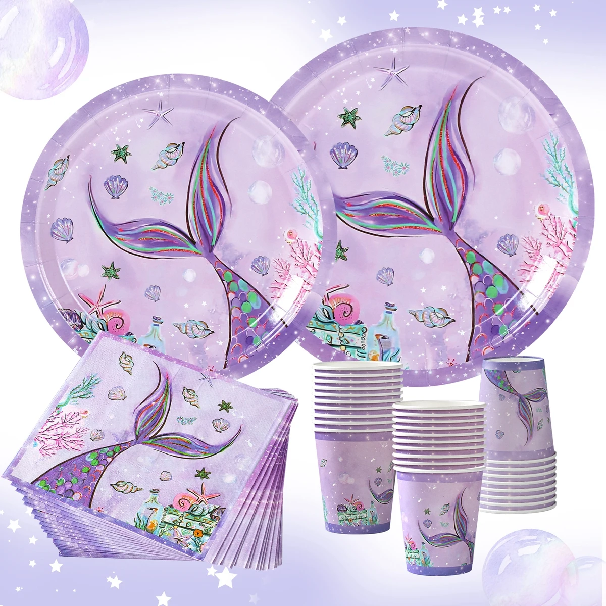 Comprar Vajilla desechable con tema de sirena, decoración de fiesta de cumpleaños para niños, Baby Shower, niñas, bajo el mar, suministros de fiesta de boda