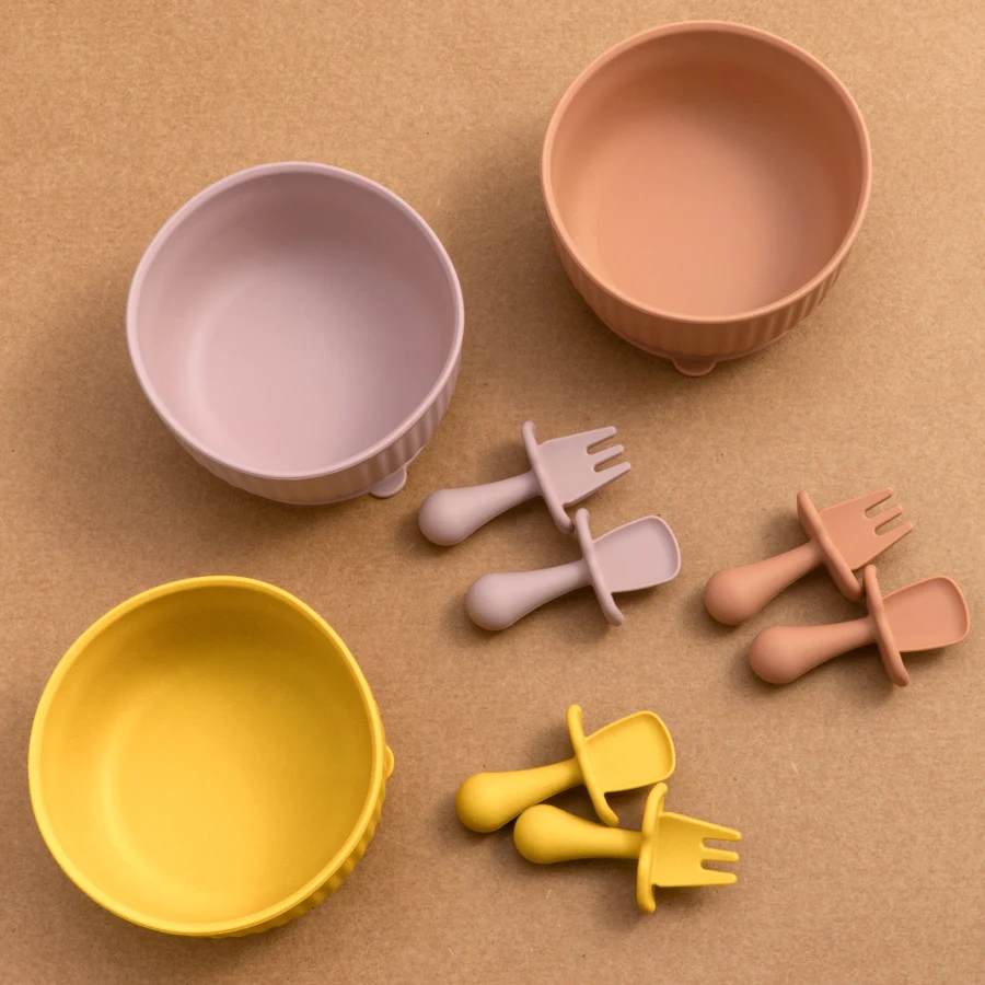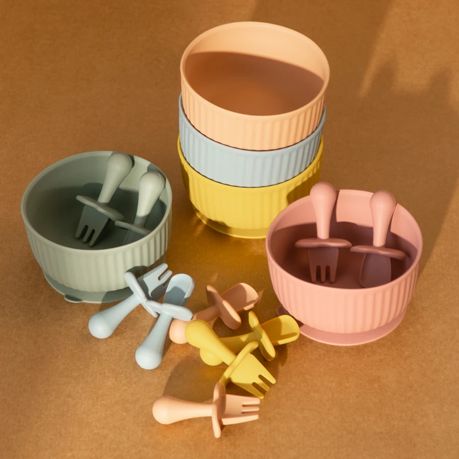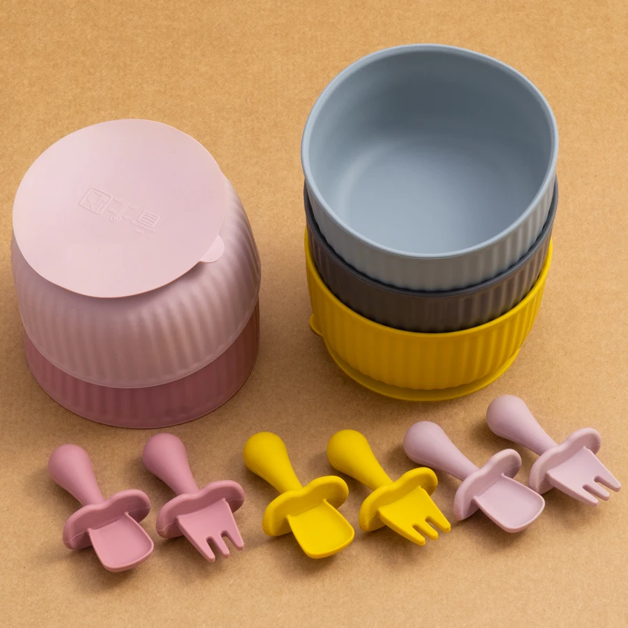 Vajilla de silicona para bebé, tazón de rayas verticales, tenedor, cuchara, 3 piezas con fuerte succión, tazón de entrenamiento para recién nacido, 2024