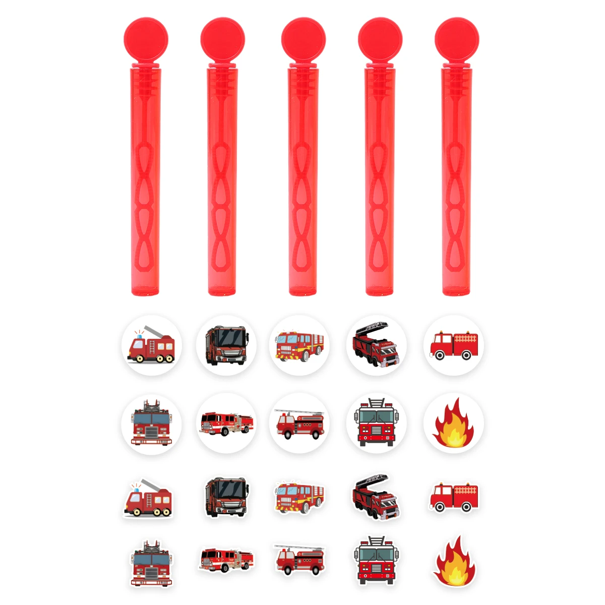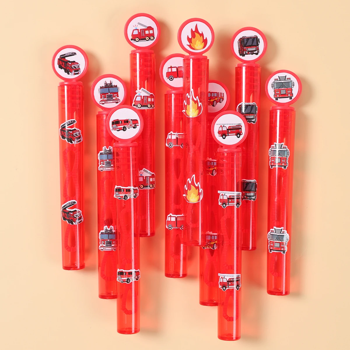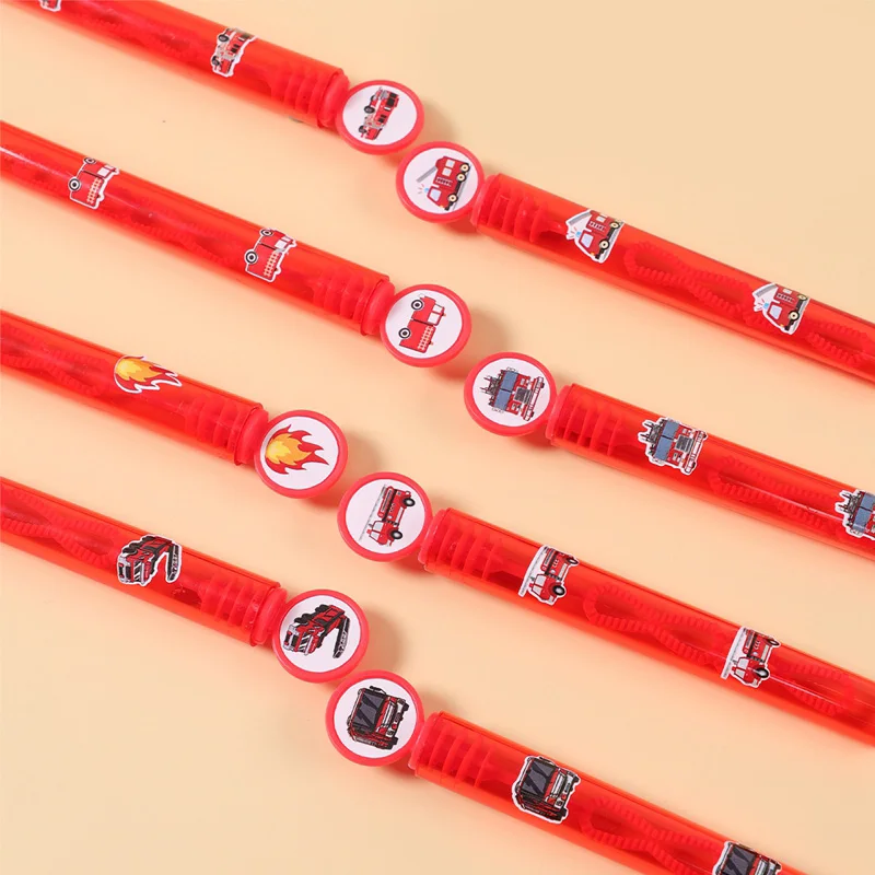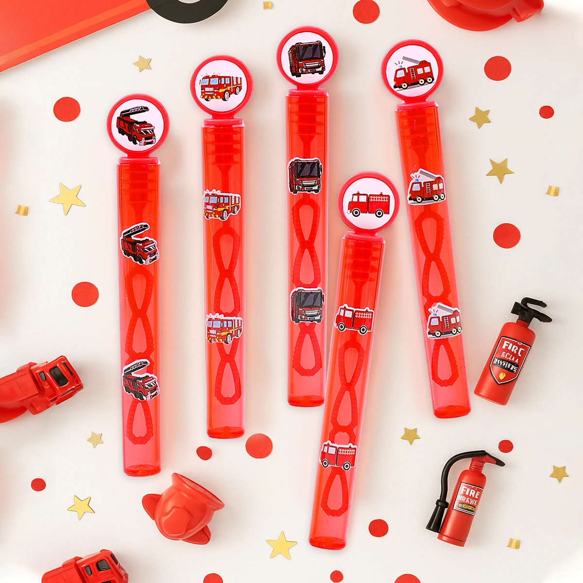 El diseño del camión de bomberos rojo hace que estas varitas de burbujas no solo sean funcionales sino también una elegante decoración para fiestas.