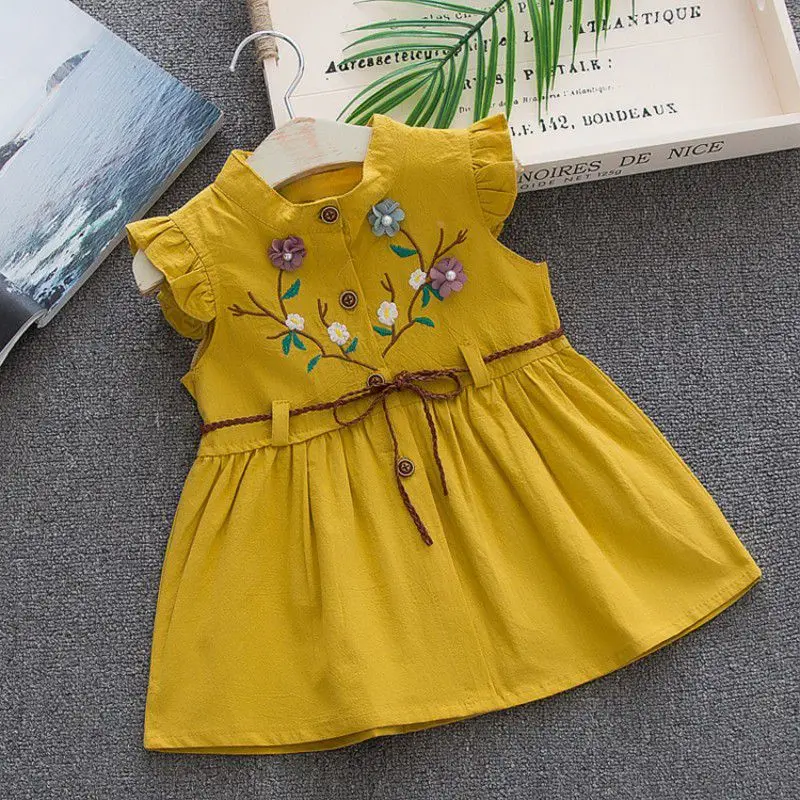 Comprar Vestido de algodón suave para niñas pequeñas, vestido de princesa con flores bordadas, decoración de volantes, color liso, informal, fresco, sin mangas